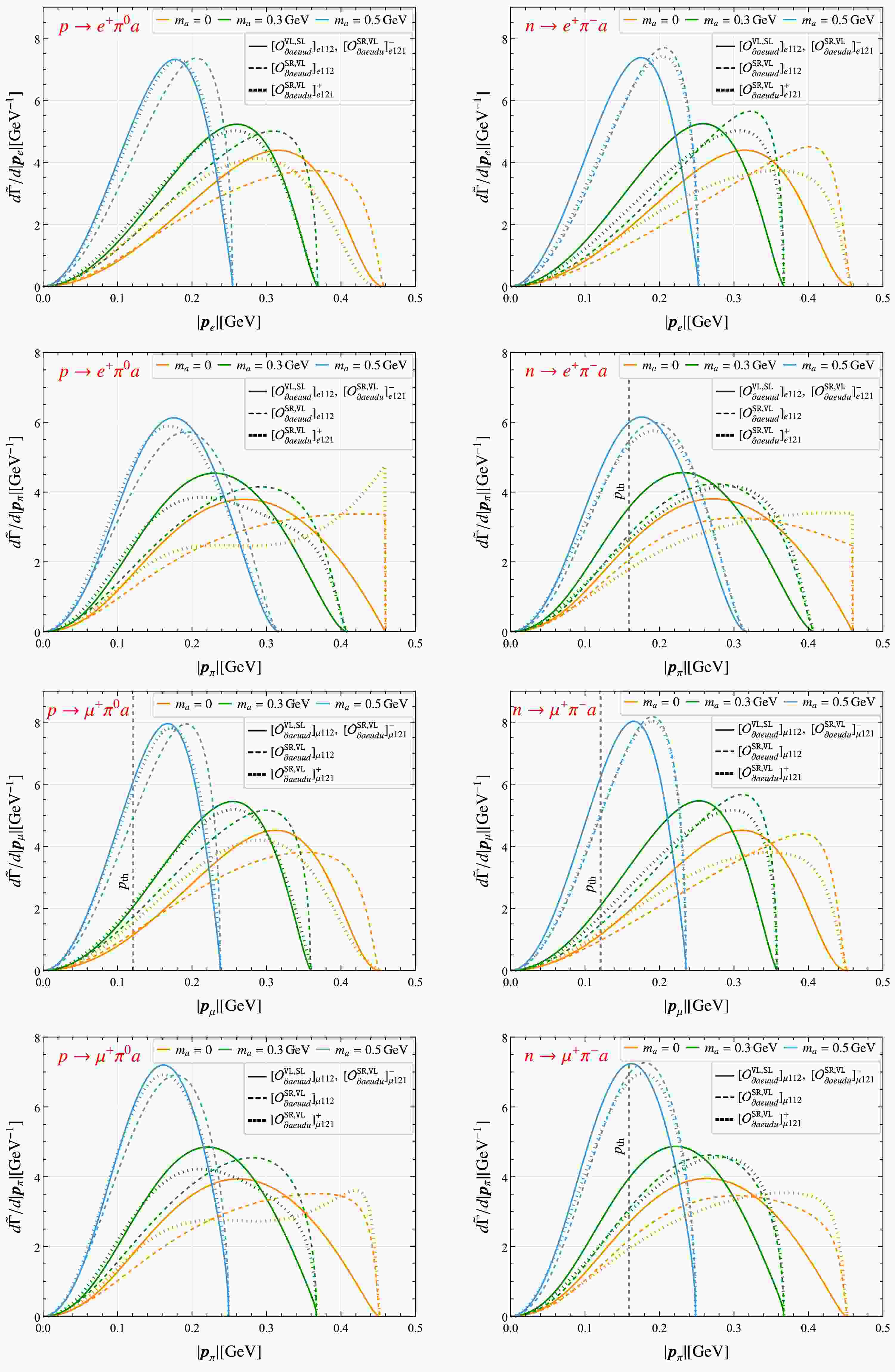 $ {\rm{SU}}(3)_{\mathtt{L}}\otimes {\rm{SU}}(3)_{\mathtt{R}} $ of the light$ u,\; d,\; s $ quarks, these dim-8 operators can be classified into three irreducible representations (irreps) and their chiral partners:$ {\bf{8}}_{ \mathtt{L}( \mathtt{R})} \otimes {\bf{1}}_{ \mathtt{R}( \mathtt{L})} $ ,$ {\bf{3}}_{ \mathtt{L}( \mathtt{R})} \otimes \bar{{\bf{3}}}_{ \mathtt{R}( \mathtt{L})} $ , and$ {\bf{3}}_{ \mathtt{L}( \mathtt{R})} \otimes {\bf{6}}_{ \mathtt{R}( \mathtt{L})} $ . Only 8 operators in the first two usual irreps were considered in [12], whereas the remaining 12 operators associated with the new chiral irreps$ {\bf{3}}_{ \mathtt{L}( \mathtt{R})} \otimes {\bf{6}}_{ \mathtt{R}( \mathtt{L})} $ were discarded as sub-leading contributions. Recently, we have found that the operators in the new chiral irreps can contribute to nucleon decays at the same leading chiral order as the other two [42]. Moreover, processes that change isospin by 3/2 units, such as$ n\to \pi^+ e^- a $ and$ n\to \pi^+ \mu^- a $ , can only be mediated by operators belonging to the irreps$ {\bf{3}}_{ \mathtt{L}( \mathtt{R})} \otimes {\bf{6}}_{ \mathtt{R}( \mathtt{L})} $ due to their unique flavor and Lorentz structures. Motivated by these considerations, in this work, we will systematically investigate the nucleon decays involving an ALP based on the complete set of all 20 BNV aLEFT operators.We begin by collecting the relevant dim-8 BNV aLEFT operators involving an ALP, a SM lepton, and three light quark fields, which are invariant under the QCD and QED symmetries