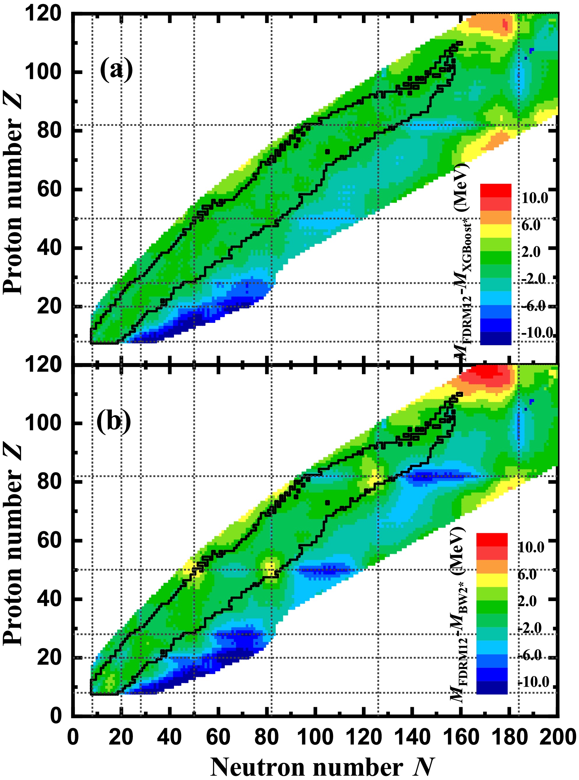 Figure 7. (color online) Difference of nuclear mass between the pseudo-experimental data of FRDM12 and theoretical predictions. Panels (a) and (b) correspond to the XGBoost* and BW2* mass models, respectively. The contours indicate the boundary of nuclei with known masses in AME2020, and the dotted lines denote the traditional magic numbers.