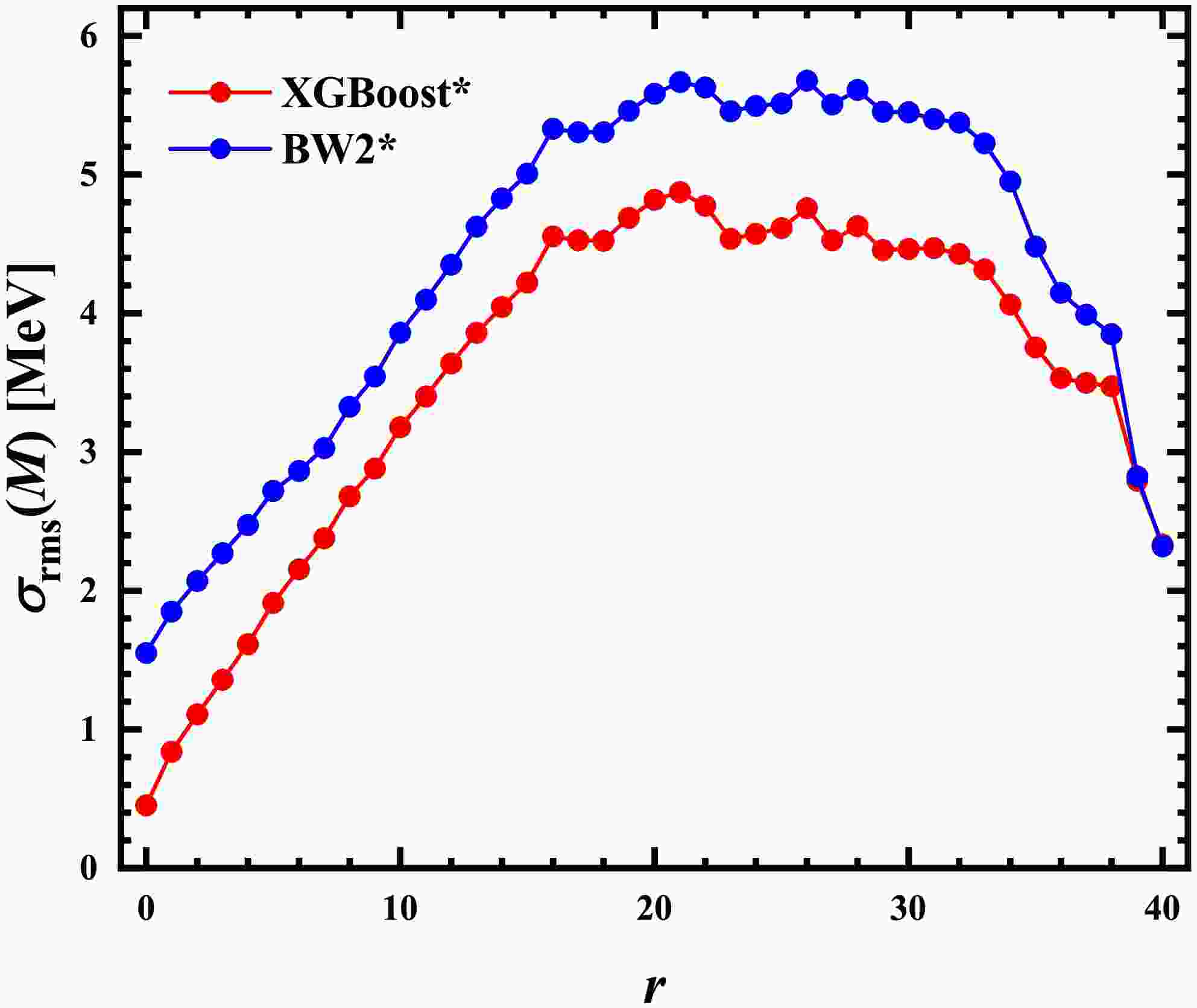 $ \sigma_{\rm{rms}} $ of different mass model predictions with respect to the experimental data for the learning and testing sets.To further test the predictive ability of the XGBoost method, we adopted the FRDM12 model as pseudo-experimental data. Two derived models, BW2* and XGBoost*, were constructed based on the FRDM12 results in the known AME2020 region. The deviations of FRDM12 model from the results of these two models are shown in Fig. 7. BW2* significantly underestimates masses in the medium-mass doubly-magic regions compared to that of FRDM12. When extrapolated to unknown regions, BW2* substantially overestimates the FRDM12 nuclear masses for proton magic nuclei. In contrast, XGBoost* reproduces the FRDM12 results considerably better across the nuclear chart. Although a slight overestimation remains for proton-magic nuclei, the overall deviation is remarkably reduced. Both methods exhibit considerable deviations for light nuclei far from β-stability, which awaits further experimental verification.