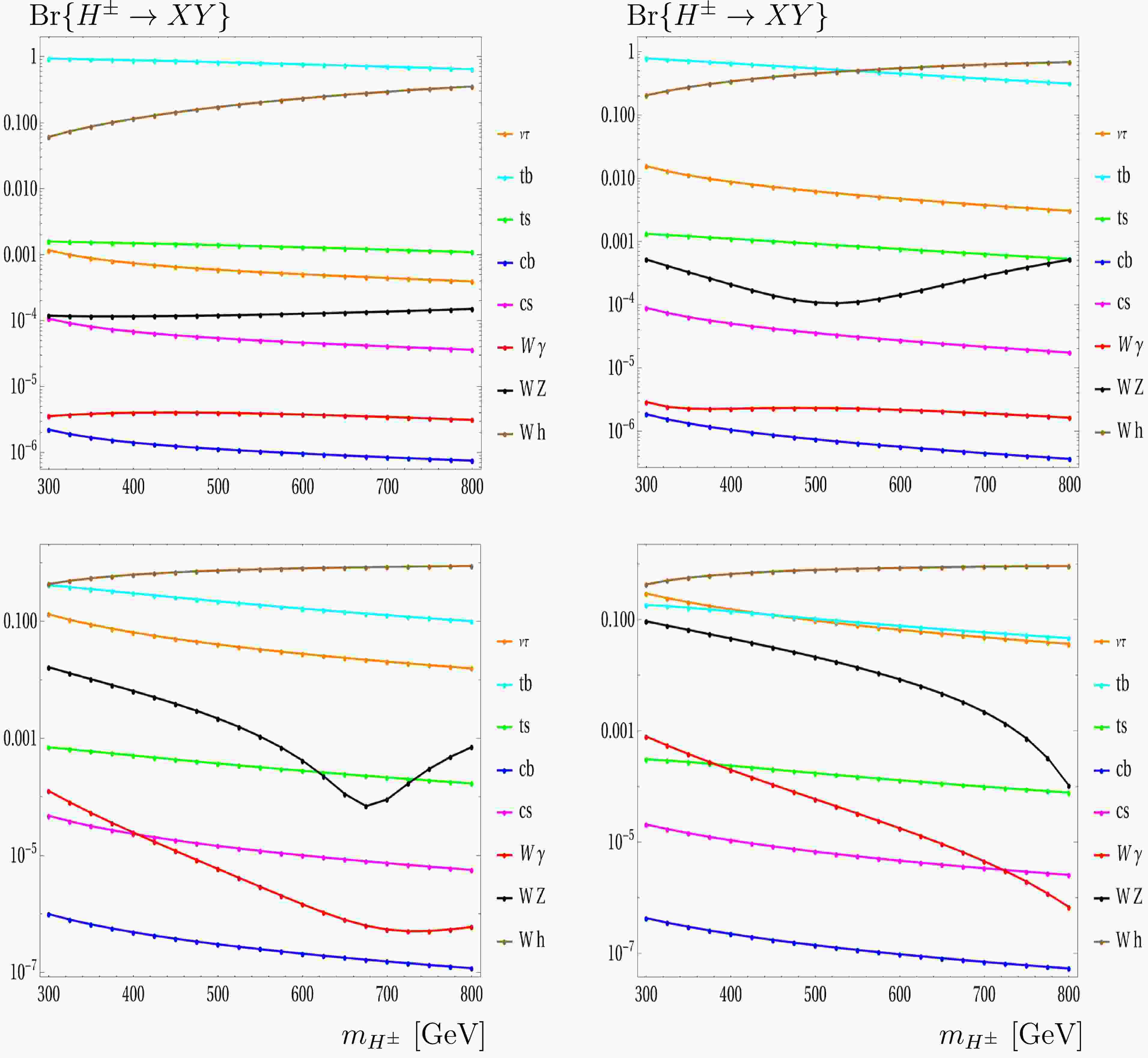 $ s_{\beta-\alpha} = 0.98 $ ,$ m_{A} = m_{H^\pm}+m_Z = m_H + m_Z $ , and$ m_{12}^2 = 5\cdot 10^{4}\; \text{GeV}^2 $ . The charged Higgs mass is scanned over the range$ 200\; \text{GeV} \leq m_{H^\pm} \leq 1000\; \text{GeV} $ , while the mixing parameter is chosen as$ 2 \leq t_{\beta} \leq 12 $ . All other SM parameters are taken from the Particle Data Group [60]. -