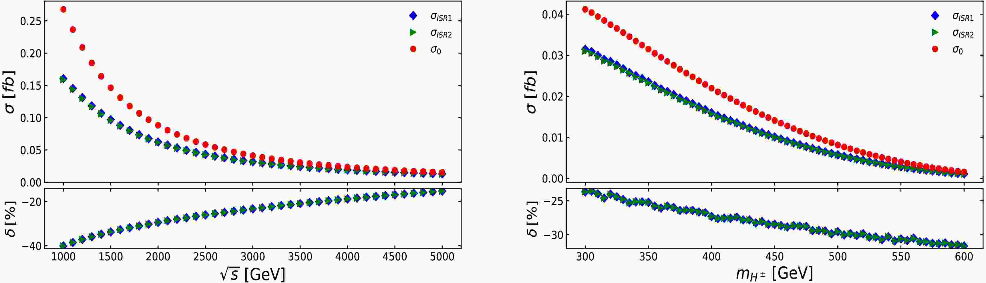$ \mu^+\mu^- \rightarrow H^{+}H^{-} \rightarrow W^{\pm}W^{\mp}Zh $ are examined as functions of the center-of-mass energy (left panel) and of the charged Higgs mass at$ \sqrt{s}=3 $ TeV (right panel). In the left plot, we vary the center-of-mass energy from$ 1000 $ GeV to$ 5000 $ GeV and fix$ m_{H^\pm}=300 $ GeV with$ t_\beta=8 $ . We find that the ISR corrections change from approximately$ -40 $ % to$ -20 $ %. For the right-panel plot, we study the ISR corrections at$ \sqrt{s}=3000 $ GeV while varying the charged Higgs mass and fixing$ t_\beta=8 $ . The results indicate that the corrections are from$ -20 $ % to$ -30 $ % for charged Higgs masses in the interval$ [300,600] $ GeV. In Fig. 3,$ \sigma_{ISR1} $ ($ \sigma_{ISR2} $ ) denotes the cross section calculated using the structure functions from Eqs. 9 and 10.