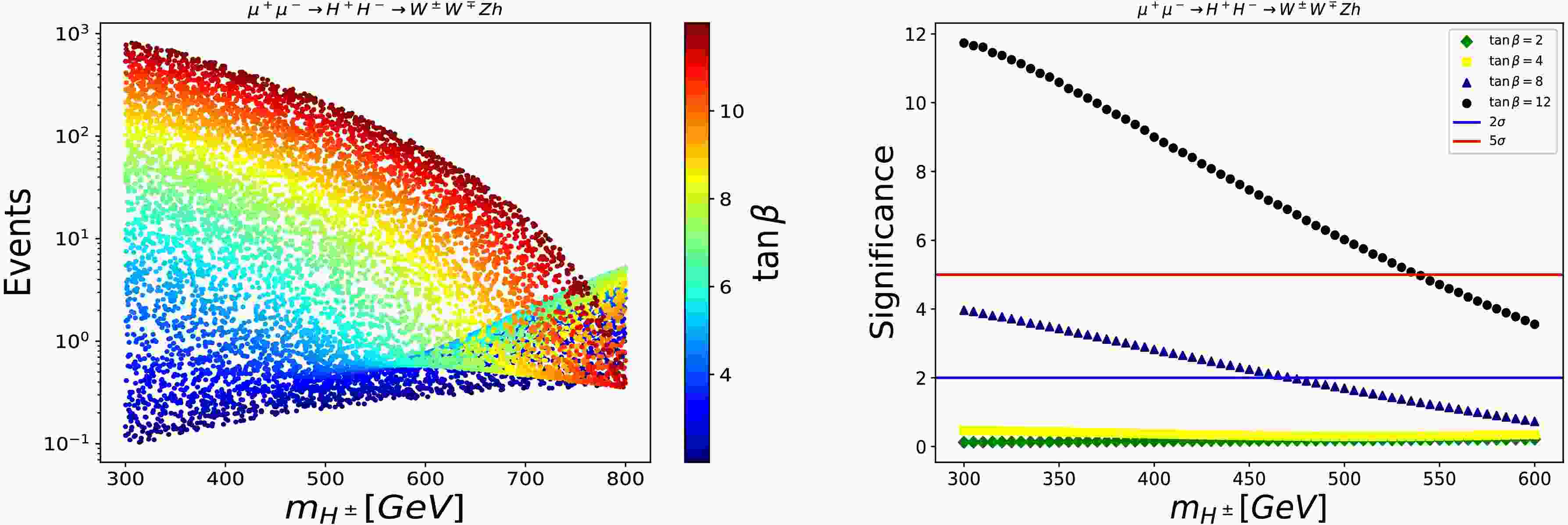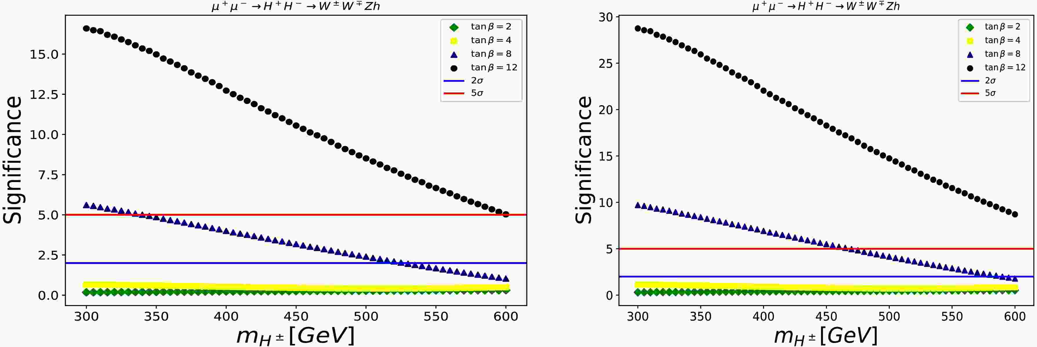 $ \mu^+\mu^- \to \gamma\gamma \rightarrow H^{+}H^{-} \rightarrow W^{\pm}W^{\mp}Zh $ at an integrated luminosity of$ {\cal{L}}=3000\; \text{fb}^{-1} $ are shown in the left panel. The corresponding signal significance taking into account the SM backgrounds is presented at$ {\cal{L}}=500\; \text{fb}^{-1} $ in the right panel.