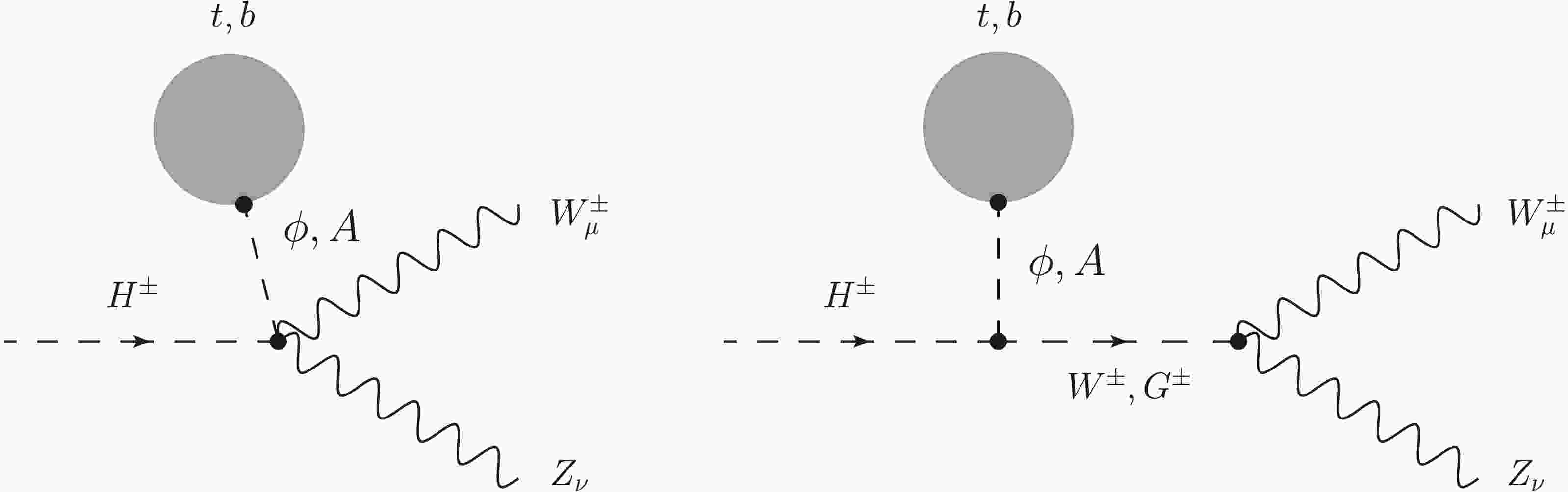 $ W^\pm $ and the Goldstone bosons$ G^\pm $ in the loop. The factor is given by$ \begin{aligned}[b] \dfrac{ {\cal{T}}^{B, \phi-W^\pm}_{1, \text{Trig}} } { g_{\phi W^\pm W^\mp} } = \;&\dfrac{ g_{\phi H^- W^+} \cdot g_{Z W^\pm W^\mp} }{32\pi^2 \cdot m_{W}^4} \Big\{ 2 m_{W}^2 \Big[ A_{0}(W) - A_{0}(\xi_W W) \Big] + \Big[ 2 m_{W}^2 \big( m_{H^\pm}^2 -m_{\phi}^2 +m_{Z}^2 -m_{W}^2 \big) B_{0} - 2 m_{Z}^2 B_{00} \Big] (Z; W,\xi_{W} W) \\& + \Big[ 2 m_{W}^2 \big( m_{\phi}^2 -m_{H^\pm}^2 -m_{Z}^2 \big) B_{0} + 2 \big( m_{Z}^2 -m_{W}^2 \big) B_{00} \Big](Z; W, W) + 2 m_{W}^2 B_{00}(Z;\xi_{W} W, \xi_{W} W ) \\ &- s_{W}^2 m_{Z}^2 \big( m_{\phi}^2 -m_{H^\pm}^2 \big) B_{0} (H^\pm; \phi, \xi_W W) + 2 m_{W}^2 \Big[ \big( m_{H^\pm}^2 - m_{\phi}^2 \big) \big( m_{H^\pm}^2 +m_{W}^2 -m_{Z}^2 \big) C_{2} + 2 m_{W}^2 \big( m_{H^\pm}^2 -m_{\phi}^2 \big) C_{1} \\ & - m_{\phi}^2 \big( m_{\phi}^2 -m_{H^\pm}^2 \big) C_{0} \Big] (W,Z, H^\pm;\phi,W, \xi_W W) + 2 m_{W}^2 \Big[ \big( m_{W}^2 -m_{H^\pm}^2 -m_{\phi}^2 \big) C_{00} - \big( m_{H^\pm}^2 +m_{W}^2 -m_{Z}^2 \big) C_{002} \\ & - 2 m_{H^\pm}^2 C_{001} \Big](H^\pm, Z, W; \phi,W, \xi_W W) \Big\} + \dfrac{ g_{\phi H^- W^+} \cdot g_{Z W^\pm W^\mp} }{32\pi^2 \cdot m_{W}^4} \Big\{ 2 m_{W}^2 \Big[ \big( m_{H^\pm}^2 +m_{W}^2 -m_{Z}^2 \big) C_{001} + 2 m_{H^\pm}^2 C_{002} \Big] \\ & + 2 m_{W}^2 \Big[ m_{\phi}^4 - m_{\phi}^2 \big( m_{H^\pm}^2 +m_{Z}^2 \big) - \big( m_{H^\pm}^2 -m_{W}^2 \big) \big( m_{W}^2 -m_{Z}^2 \big) \Big] C_{0} + 2 \Big[ m_{\phi}^2 \big( m_{Z}^2 -m_{W}^2 \big) - m_{Z}^2 \big( m_{H^\pm}^2 +m_{W}^2 \big) \\ &+ m_{W}^2 \big( 3 m_{H^\pm}^2 +m_{W}^2 \big) \Big] C_{00} + 2 m_{W}^4 \big( 2 m_{\phi}^2 -m_{H^\pm}^2 -m_{W}^2 -m_{Z}^2 \big) C_{1} + 2 m_{W}^2 \Big[ m_{\phi}^2 \big( m_{H^\pm}^2 +m_{W}^2 -m_{Z}^2 \big)\\ & + m_{H^\pm}^2 \big( m_{Z}^2 -m_{H^\pm}^2 \big) + m_{W}^2 \big( m_{Z}^2 -m_{W}^2 \big) \Big] C_{2} \Big\} (W,Z,H^\pm;\phi, W, W) \\& - \dfrac{ g_{\phi H^- W^+ Z} }{16\pi^2 \cdot m_{W}^2} \Big[ \big( m_{W}^2 B_{0} - B_{00} \big) (W;\phi,W) + B_{00} (W,\phi,\xi_W W) \Big], \end{aligned} $