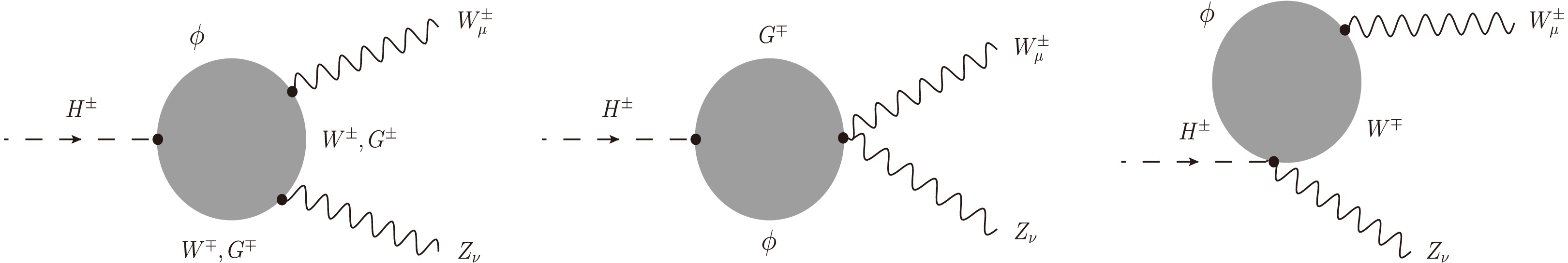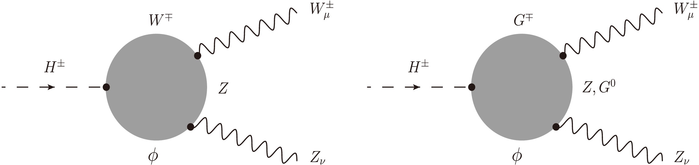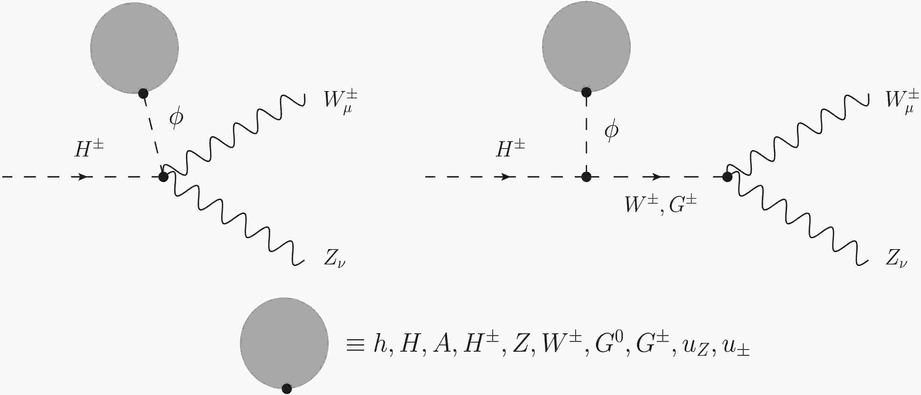 $ {\cal{T}}^{B, W^\pm}_{2, \text{Trig}}, {\cal{T}}^{B, Z}_{2, \text{Trig}}, {\cal{T}}^{B, W^\pm Z}_{2, \text{Trig}}, $ and$ {\cal{T}}^{B, A}_{2, \text{Trig}}, $ which involve vector and Goldstone boson propagators in terms of the gauge parameters$ \xi_{V} $ for$ V = W, Z $ . First, we present the representative form for$ {\cal{T}}^{B, W^\pm}_{2, \text{Trig}} $ with the cancellation checks of ξ-dependence as follows:$ \begin{aligned}[b] \dfrac{ {\cal{T}}^{B, W^\pm}_{2, \text{Trig}} } { g_{Z W^\pm W^\mp} } =\;& \sum \limits_{\phi = h, H} \dfrac{ g_{\phi W^\pm W^\mp} \cdot g_{\phi H^- W^+} }{ 2 c_{W}^2 m_{W}^4 } \Big\{ c_{W^\pm}^{0} + c_{W^\pm}^{1} A_{0}(\phi) + c_{W^\pm}^{2} A_{0}(W) + c_{W^\pm}^{3} B_{0}(W;\phi,W) + c_{W^\pm}^{4} B_{0}(H^\pm;\phi,W) \\&+ c_{W^\pm}^{5} B_{0}(Z;W,W) + c_{W^\pm}^{6} C_{0}(W,Z,H^\pm;\phi,W,W) + c_{W^\pm}^{7} A_{0}(\xi_{W}\; W) + c_{W^\pm}^{8} B_{0}(W;\phi,\xi_{W}\; W) + c_{W^\pm}^{9} B_{0}(H^\pm;\phi,\xi_{W} W)\\& + c_{W^\pm}^{10} B_{0}(Z;W,\xi_{W} W) + c_{W^\pm}^{11} B_{0}(Z;\xi_{W}\; W,\xi_{W}\; W) + c_{W^\pm}^{12} C_{0}(W,Z,H^\pm;\phi,W,\xi_{W} W) \\&+ c_{W^\pm}^{13} C_{0}(H^\pm,Z,W; \phi,W,\xi_{W} W) + c_{W^\pm}^{14} C_{0}(W,Z,H^\pm; \phi,\xi_{W} W,\xi_{W} W) \Big\}. \end{aligned} $