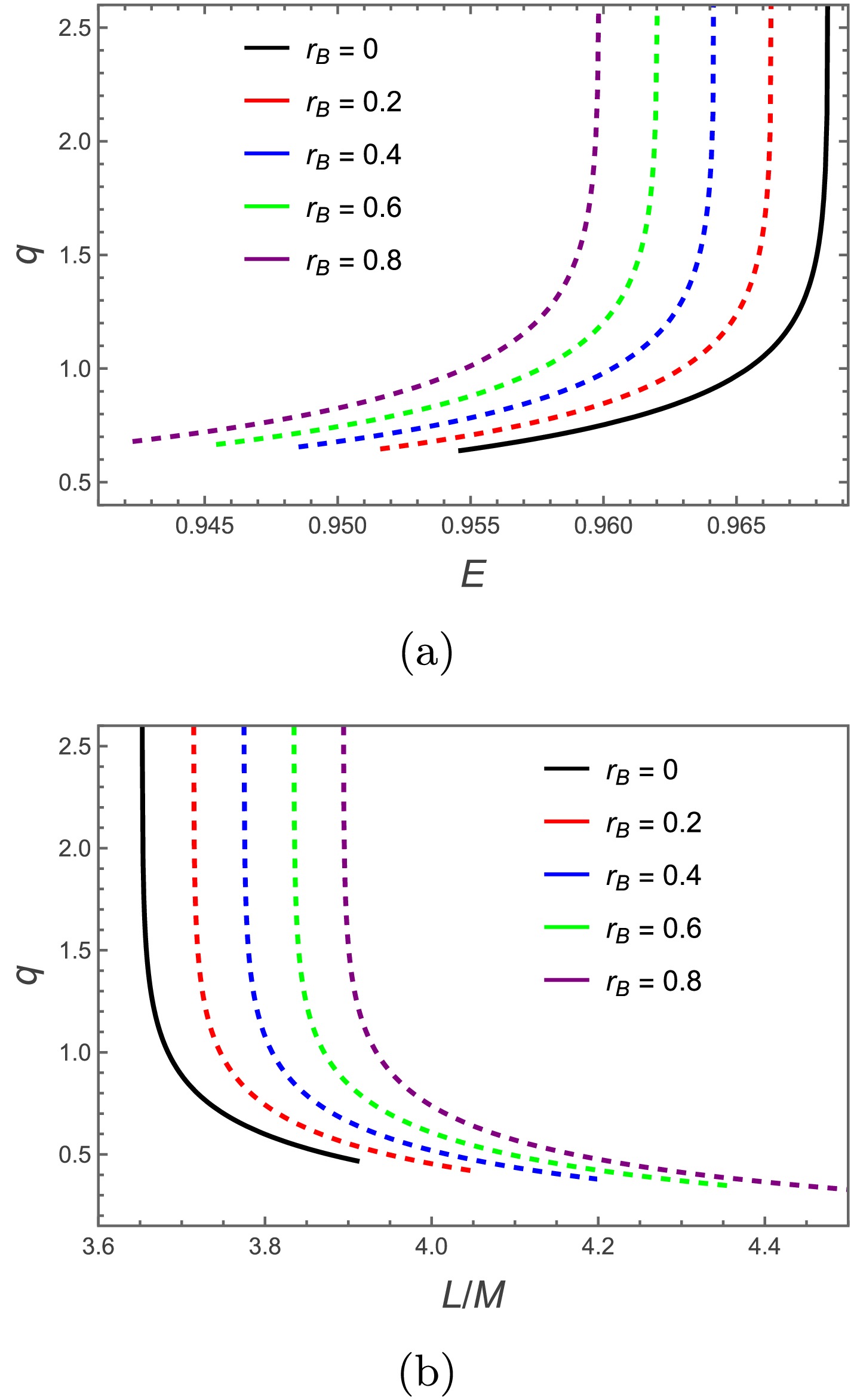 $ r_B $ , with fixed$ L=(L_{\text{MBO}}+L_{\text{ISCO}})/2 $ . (b) q versus angular momentum for different$ r_B $ , with fixed$ E=0.96 $ .Figure 5 shows q increases slowly with E initially but diverges as E approaches its maximum; versus L, q diverges near minimal L then gradually decreases. For fixed q, orbital energy E decreases while angular momentum L increases with