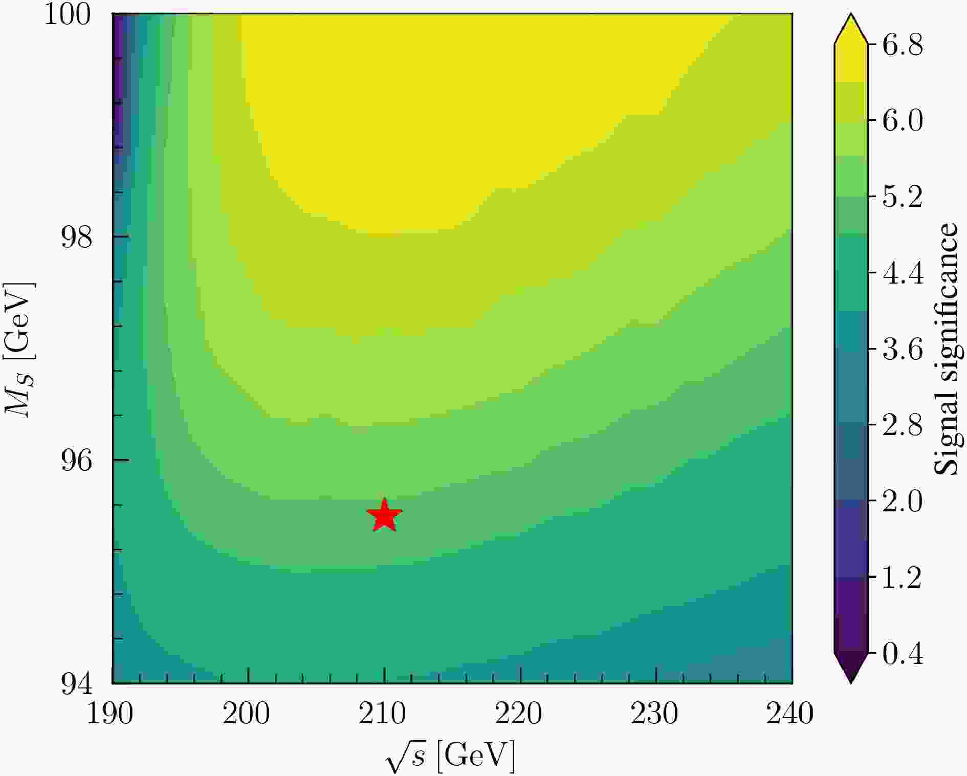 $ \mathcal{Z} $ in the$ M_S $ versus$ \sqrt{s} $ plane, assuming an integrated luminosity of 500$ {\rm{fb}}^{-1} $ . The red star indicates the benchmark point at$ M_S = 95.5 $ GeV and$ \sqrt{s} = 210 $ GeV.$ \mathcal{Z}= \sqrt{2L\left[(\mathcal{S}+\mathcal{B})\ln(1+\mathcal{S}/\mathcal{B})-\mathcal{S}\right]}, $