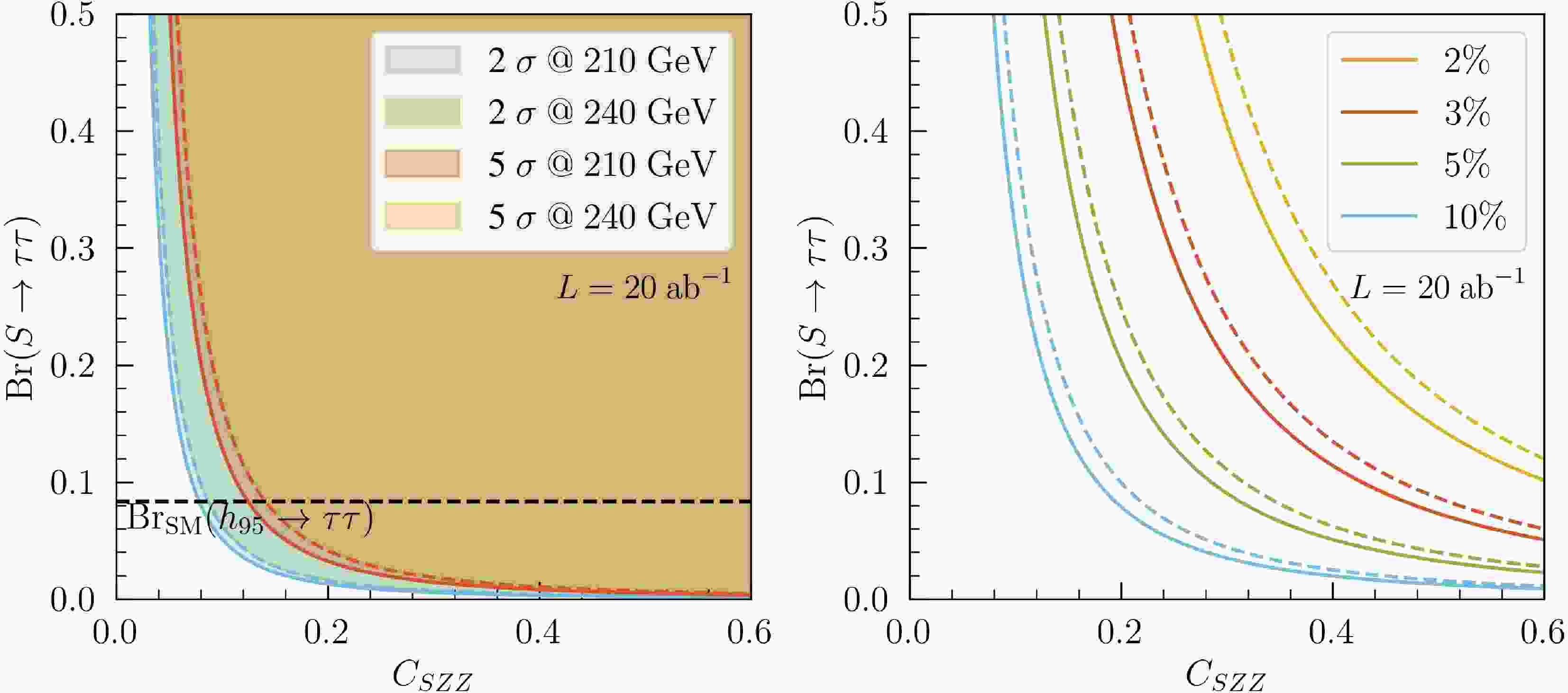 $ \mathrm{Br}(S\to\tau^+\tau^-) $ versus$ C_{SZZ} $ planes. The left panel shows the expected$ 2\sigma $ and$ 5\sigma $ coverage, and the right panel shows the relative statistical precision on the signal yield. Results are presented for$ \sqrt{s}=210 $ GeV (solid) and$ \sqrt{s}=240 $ GeV (dashed), assuming an integrated luminosity of$ L=20\; \mathrm{ab}^{-1} $ .$ \delta_{\rm stat}=\frac{\sqrt{(\mathcal S+\mathcal B)L}}{\mathcal S L}, $