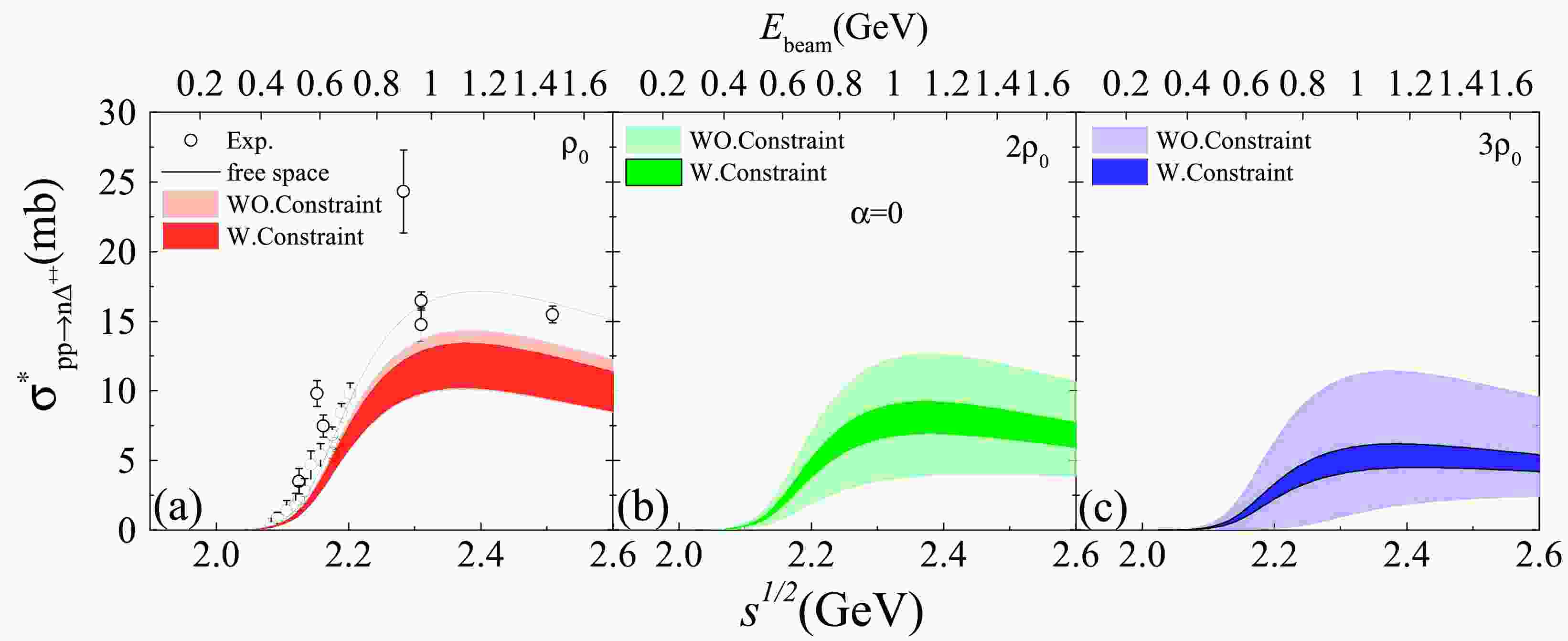 $pp \to n\Delta^{++}$ cross section as function of$ \sqrt{s} $ in symmetric nuclear matter. The left panel shows the cross section in free space and at$\rho_0 $ , while the middle and right panels present results at$ 2\rho_0 $ and$ 3\rho_0 $ , respectively. The experimental data are taken from Ref. [45].Since there is no isospin splitting of effective masses in symmetric nuclear matter, the in-medium cross section for