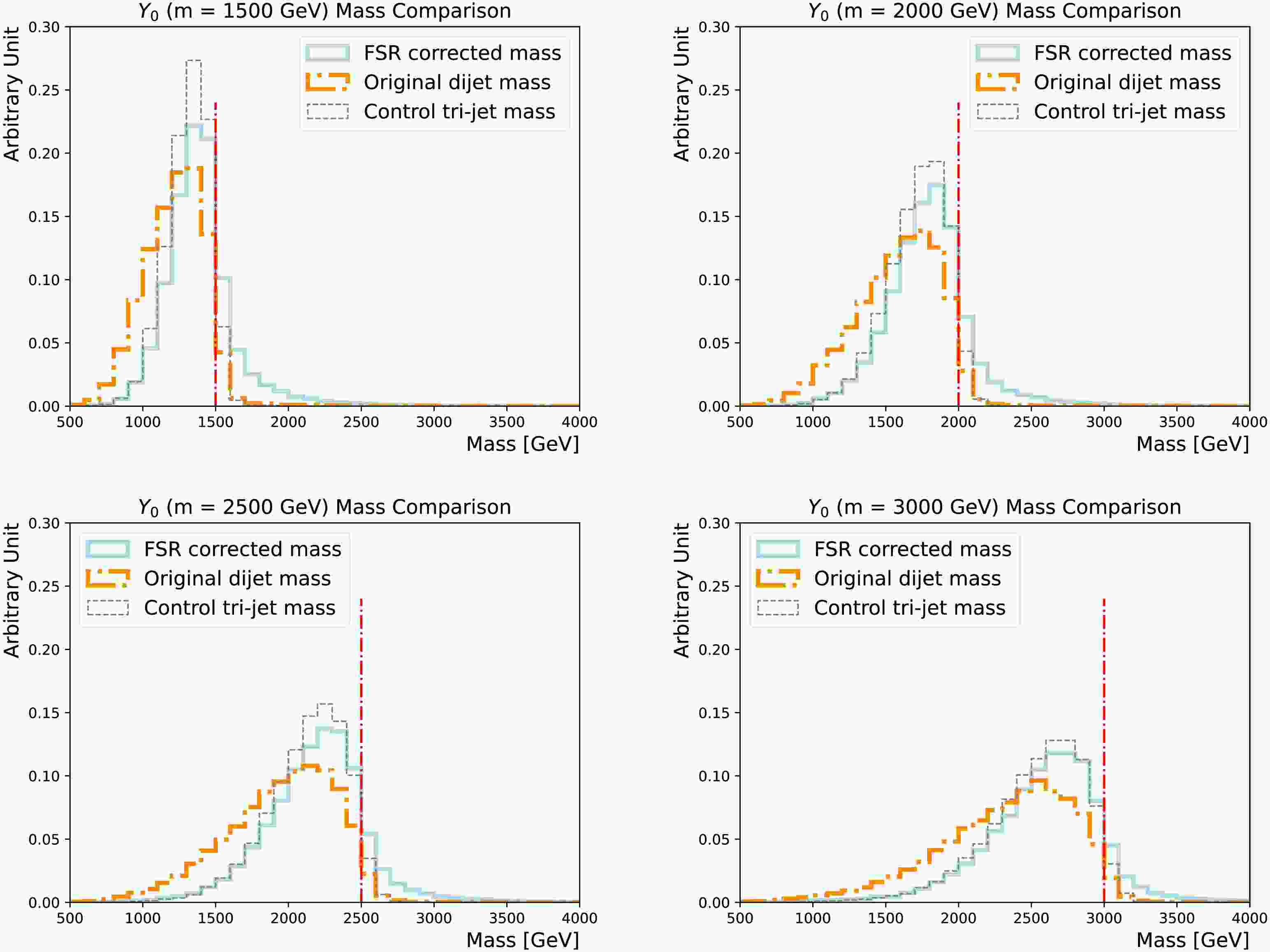 Figure 10.  (color online) Comparisons of the FSR corrected masses (solid line) and the original di-jet masses (dotted-dashed line), for the $m_{Y_0} $ = 1500 GeV (upper left), 2000 GeV (upper right), 2500 GeV (lower left) and 3000 GeV (lower right) nominal signal samples. The tri-jet mass calculated using the showering control samples with the FSR/ISR showering switch turned on/off is added as a reference (dashed line). The actual $m_{Y_0} $ is indicated by the vertical line.