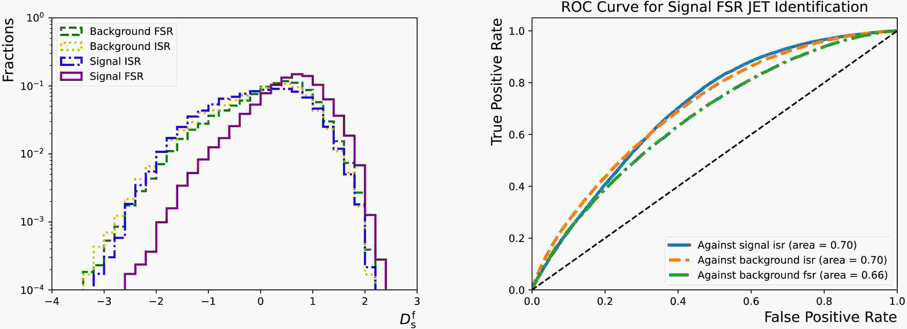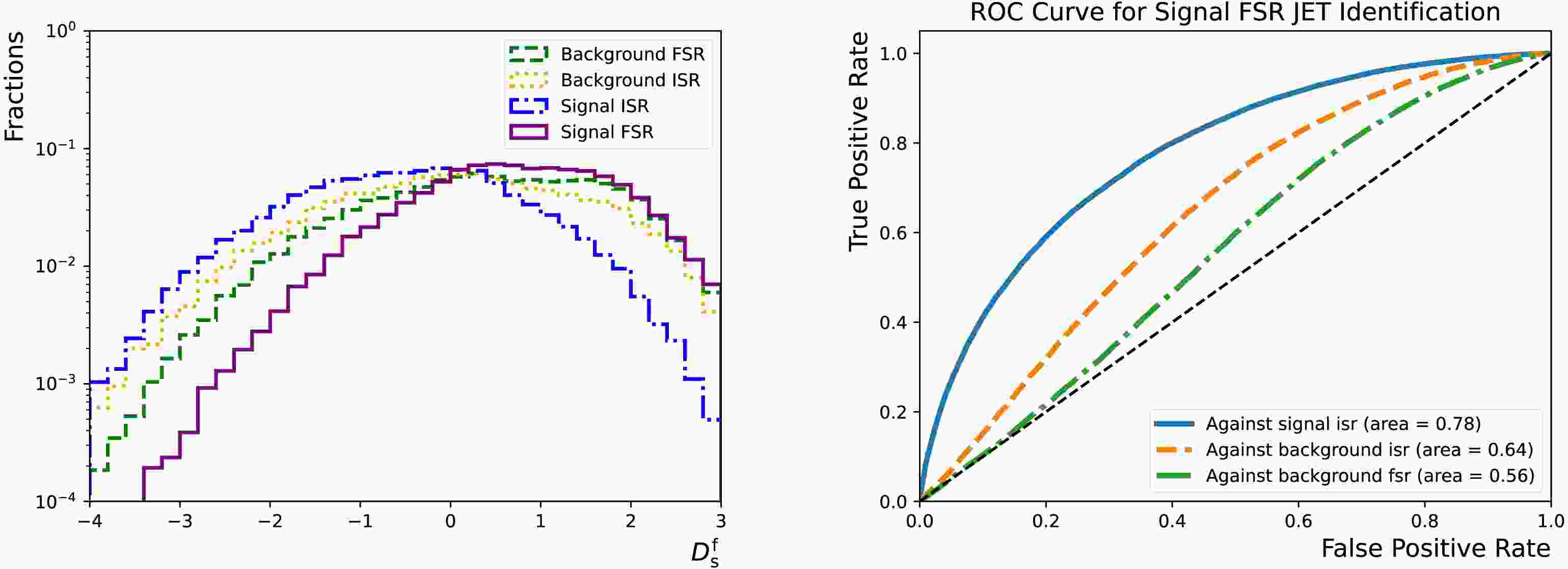 Figure 16.  (color online) Left: Distributions of the $ D_{{\rm{s}}}^{{\rm{f}}} $ for the "sig-isr" (dotted-dashed line), "sig-fsr" (solid line), "bkg-isr" (dotted line) and "bkg-fsr" (dashed line) categories. Right: "sig-fsr" identification efficiency as functions of the corresponding false positive rates for the "sig-isr" (solid line), "bkg-isr" (dashed line) and "bkg-fsr" (dotted-dashed line) categories. They are evaluated using the test dataset that accounts for 20% of the total combined dataset. $ f_{{\rm{s}}}^{{\rm{i}}} $ ($ f_{{\rm{b}}}^{{\rm{f}}} $) are set to 1 (0).