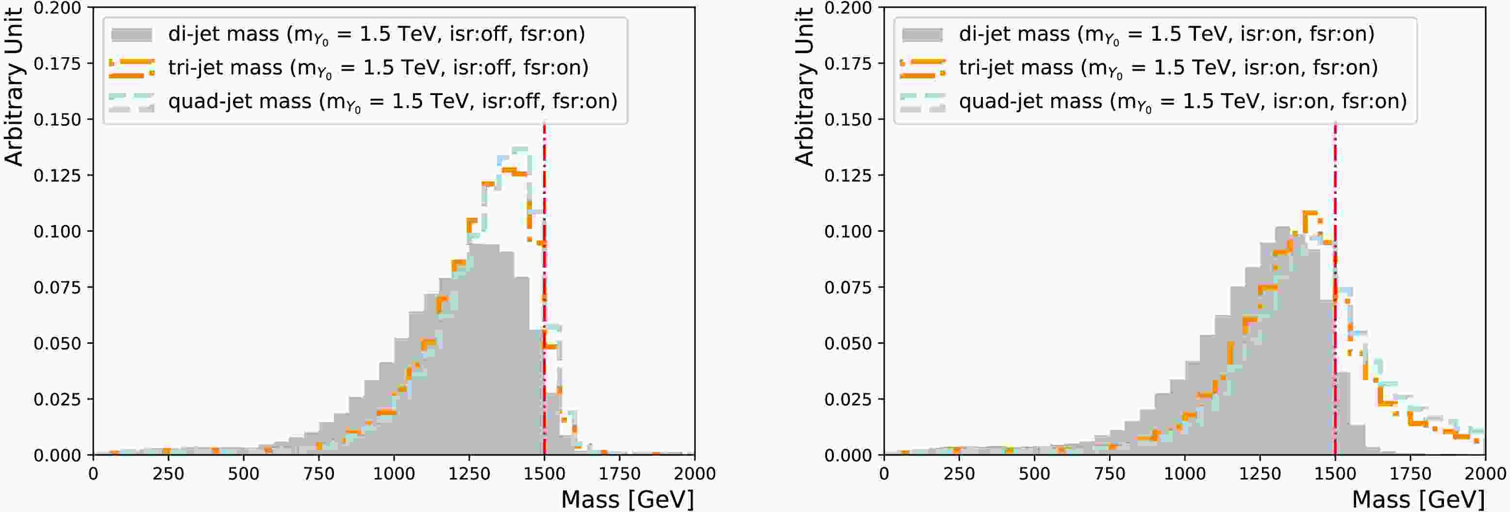 Figure 2.  (color online) Comparison of the $Y_0 $ mass reconstructed using the leading two jets (shaded area), the leading three jets (dotted-dashed line) and the leading four jets (dashed line), with the ISR showering switch turned off (left) and on (right). The FSR showering switch is turned on for both. The vertical line indicates the actual $Y_0 $ mass (1.5 TeV).