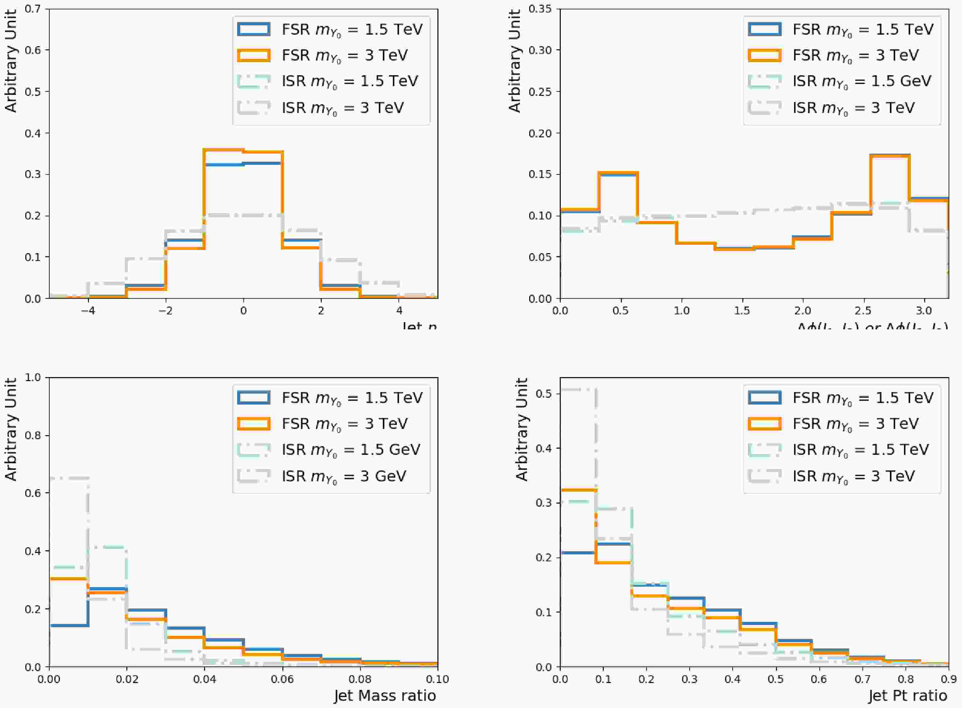 The two leading jets from a heavy $Y_0 $ particle, produced via s-channel, are central and back-to-back. Since the hardest FSR jet is branched from those two leading jets, it should be close to one of them spacially, resulting in central η and peaks in $\Delta\phi $ w.r.t the leading two jets. The kinematic properties of the ISR jets rely on the incoming partons, so their corresponding distributions are wider. Figure 3 compares the key variables of FSR jets to those of ISR jets, using the showering control samples.