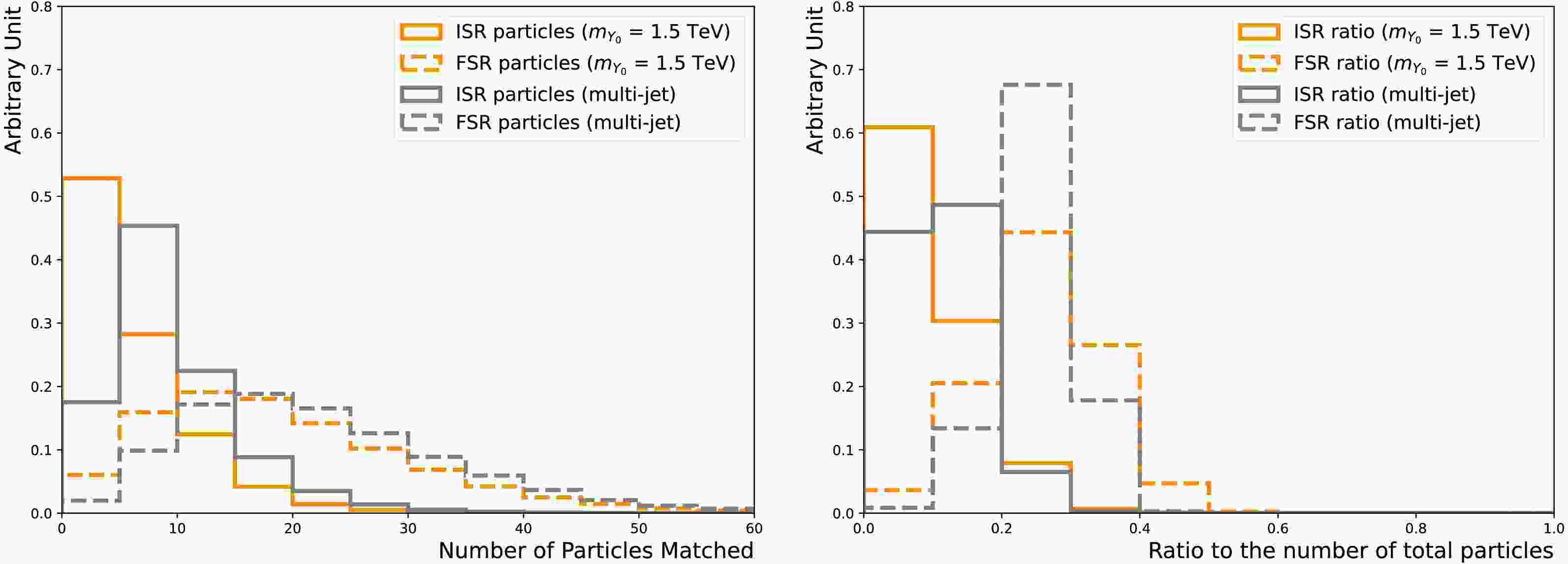 Figure 5.  (color online) The number of FSR particles (dotted-dashed line) and ISR particles (solid line) associated with the third jet (left). The ratio of the number of FSR particles (dotted-dashed line) and ISR particles (solid line) to the total number of particles, including those not from ISR/FSR, associated with the third jet (right). The nominal $m_{Y_0} $ = 1.5 TeV signal (dark orange) and multi-jet background (light grey) samples are used.