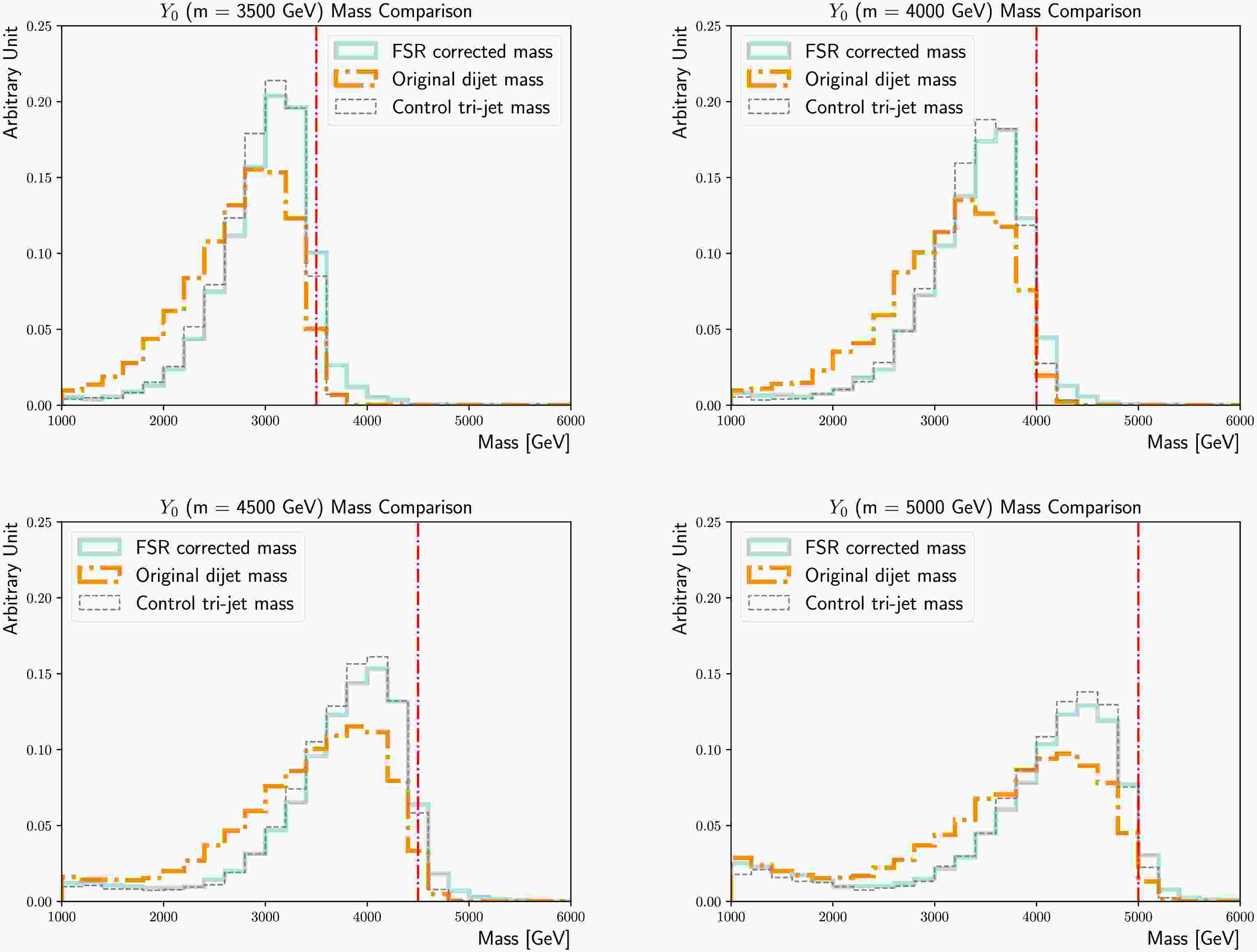 $m_{Y_0} $ = 3500 GeV (upper left), 4000 GeV (upper right), 4500 GeV (lower left), and 5000 GeV (lower right) nominal signal samples. The tri-jet mass calculated using the showering control samples with the FSR/ISR showering switch turned on/off is added as a reference (dashed line). The actual$m_{Y_0} $ is indicated by the vertical line.