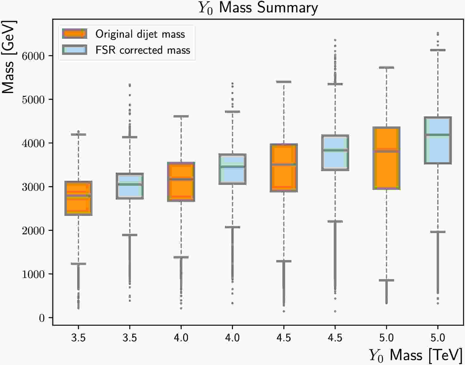 $m_{Y_0} $ = 3500 GeV, 4000 GeV, 4500 GeV, and 5000 GeV. The upper/lower boundaries of the boxes indicate the 75%/25% percentiles, while the centre lines represent the median. The upper/lower error bars correspond to the 95%/5% percentiles. -