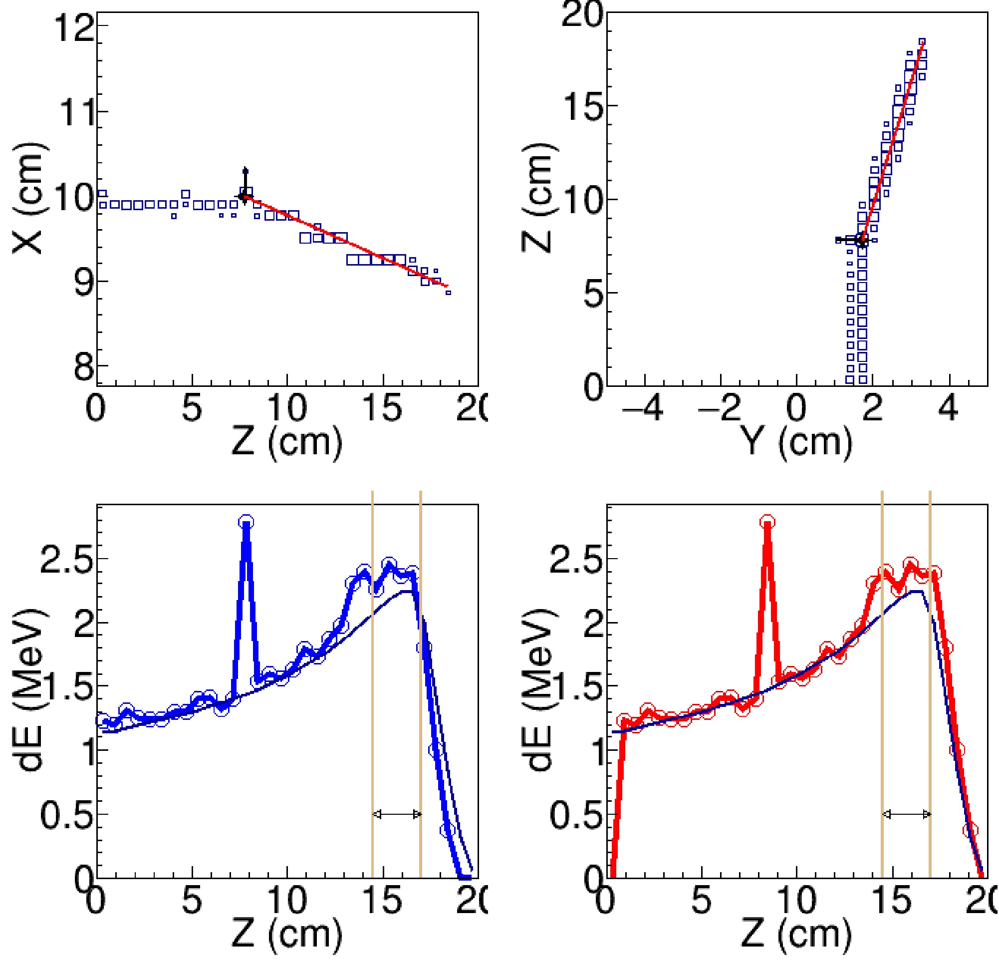 Figure 5. (color online) One-track fusion event. (Upper left) Track projection in the X–Z plane. (Upper right) Track projection in the Y–Z plane. (Lower left) Energy-loss curve along the Z-axis, with the measured energy-loss profile shown in blue and the template curve in black. (Lower right) Energy-loss curve after shifting to the position that yields the minimum