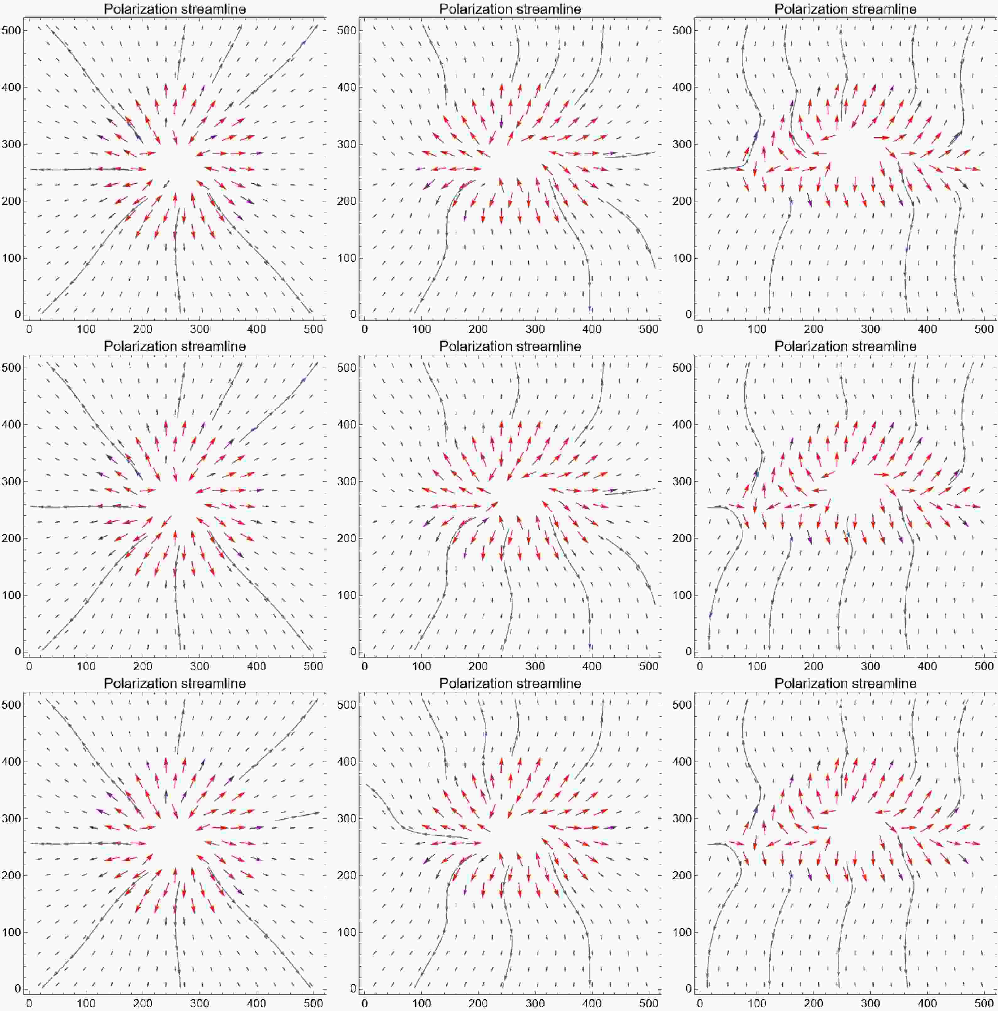 Figure 10.  (color online) EVPA streamlines for retrograde disks. Blue curves trace integral curves of the EVPA pseudovector, emphasizing global coherence and critical lines.