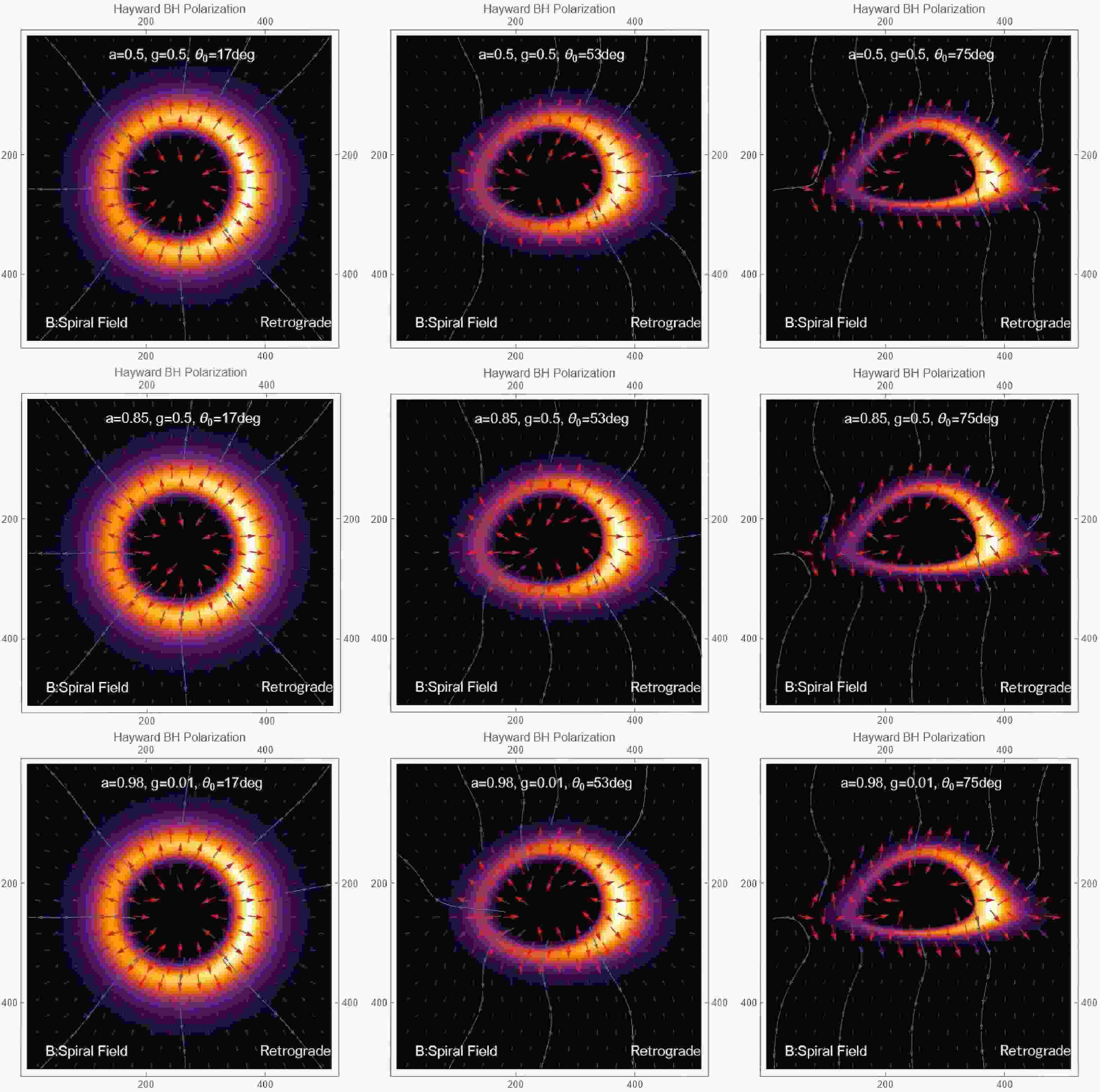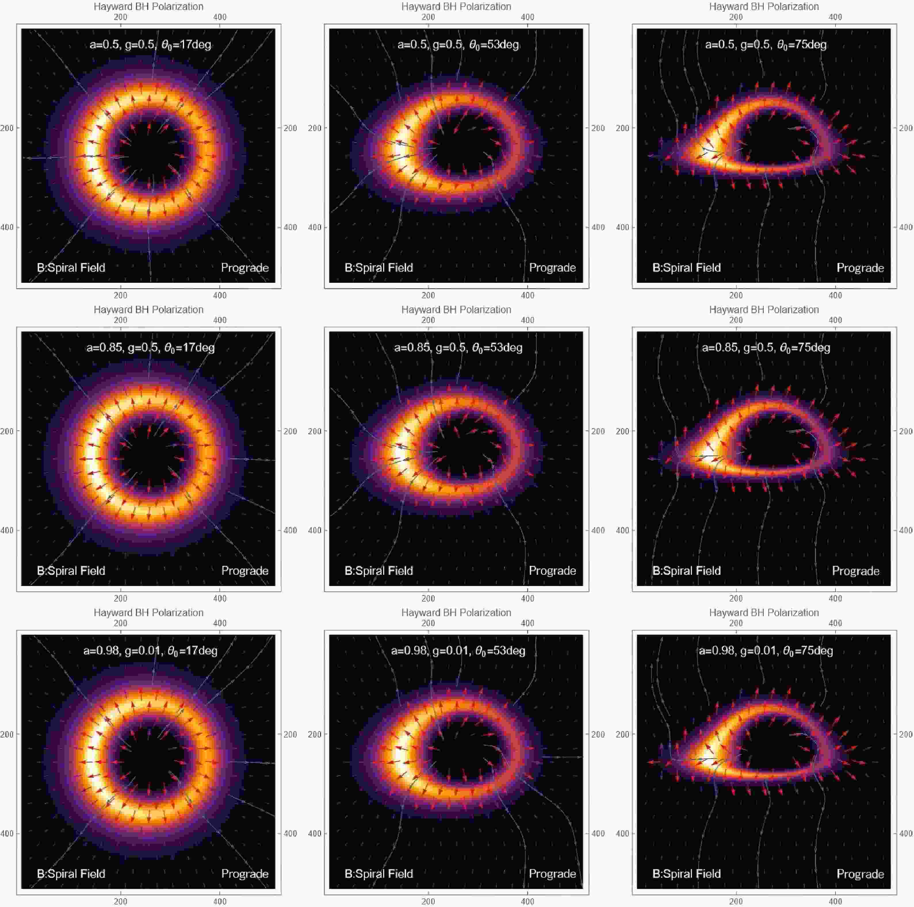 Figure 6 illustrates the EVPA vector fields of the Hayward BH in the prograde case. When the viewing inclination is $ \theta_0 = 17^\circ $, the polarization field appears nearly axisymmetric, and the EVPAs extend approximately in a radial pattern. As the inclination increases to $ \theta_0 = 53^\circ $, the EVPA distribution on the approaching side of the accretion disk shows noticeable rotations and shearing, which alter their local orientations. At a high inclination of $ \theta_0 = 75^\circ $, these features become even more pronounced, generating strong asymmetry and forming spiral-like flow structures along the crescent. For a fixed viewing inclination, increasing the spin parameter amplifies the frame-dragging effect in the spacetime, shifting the polarization direction and reducing the polarization intensity toward smaller radii. Consequently, the azimuthal twisting of EVPAs becomes more distinct, with the vectors aligning more closely along the photon-ring ridge.