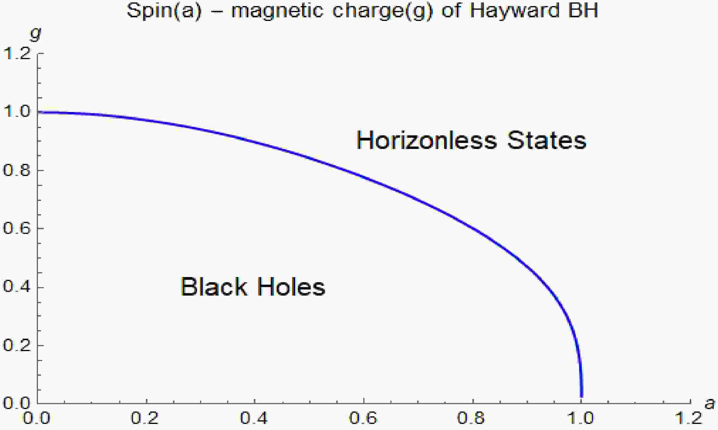 Figure 1.  (color online) Parameter space in terms of ($a,g$) is shown, delineating regions associated with BHs and horizonless spacetimes. Configurations enclosed within the blue boundary represent BHs with an event horizon, whereas regions outside this boundary correspond to horizonless spacetimes.