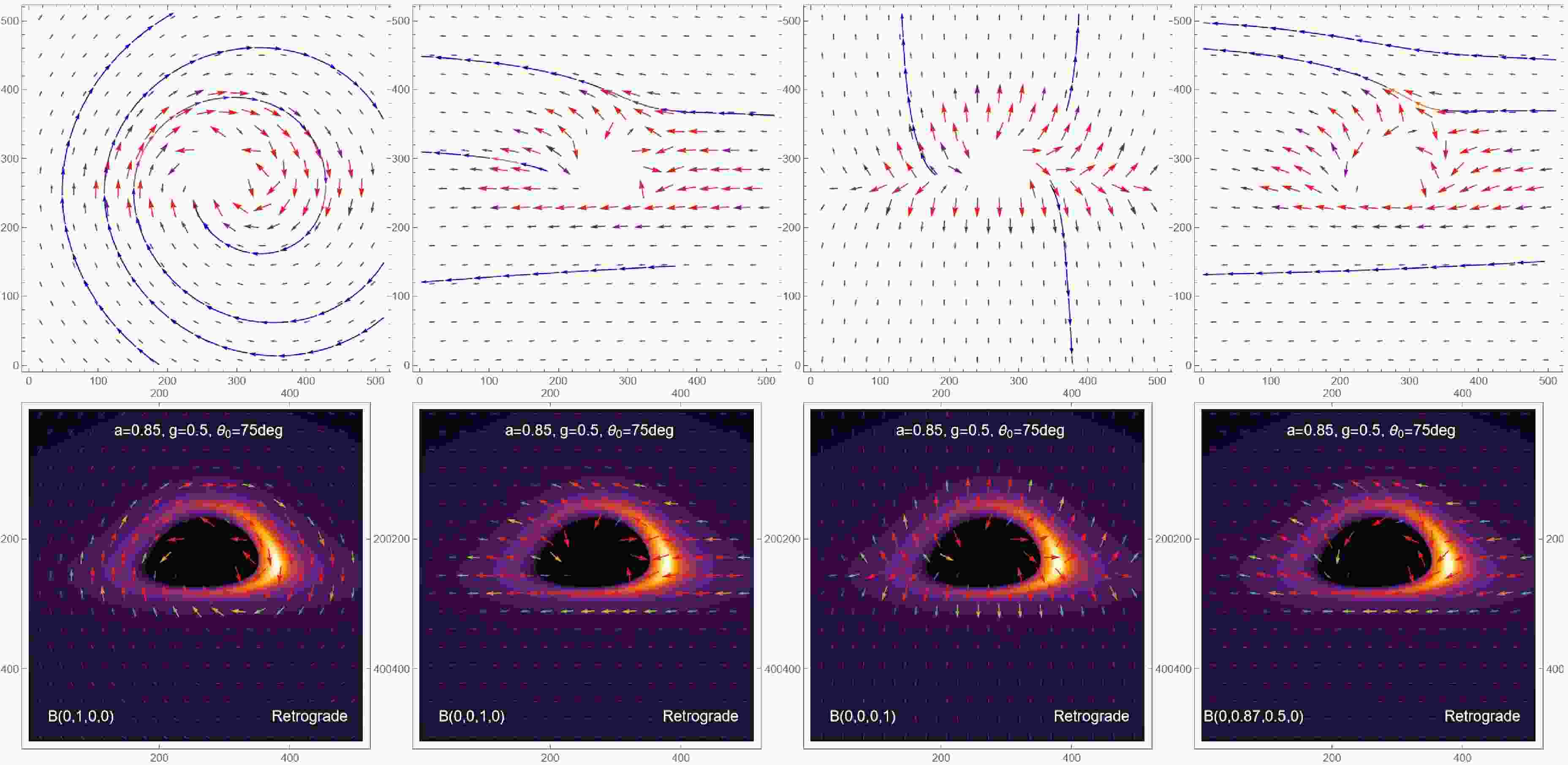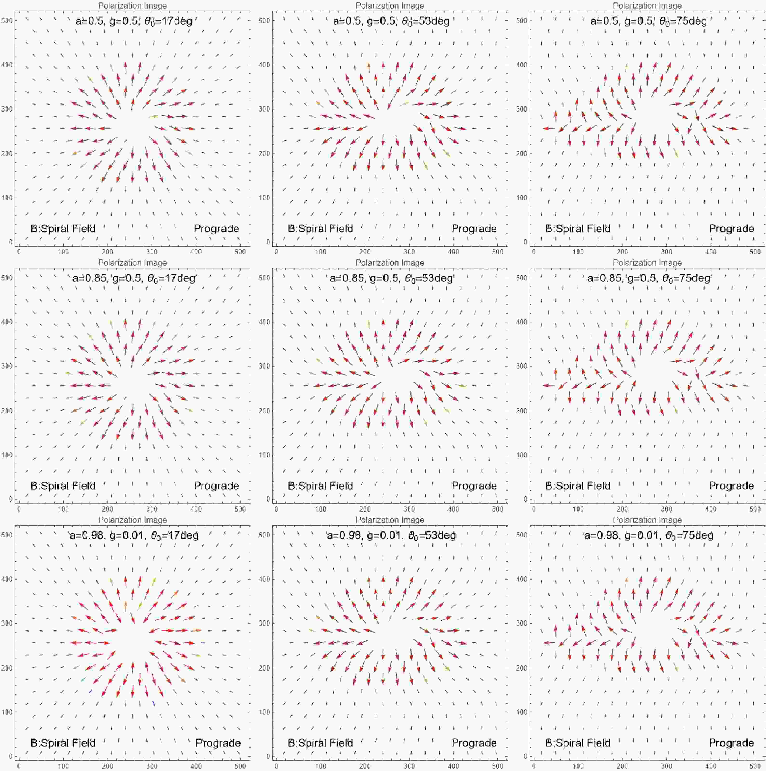 In Figure 9, the EVPA field at low viewing inclinations remains approximately radial in the retrograde case. However, its alignment with the photon-ring ridge is weaker than that in the prograde configuration. As the inclination increases, the EVPA rotation on the approaching side remains noticeable; however, its orientation becomes opposite to that in the prograde case. This reversal matches the opposite sign of the accumulated parallel-transport phase in a spacetime, where orbital motion counteracts frame dragging.