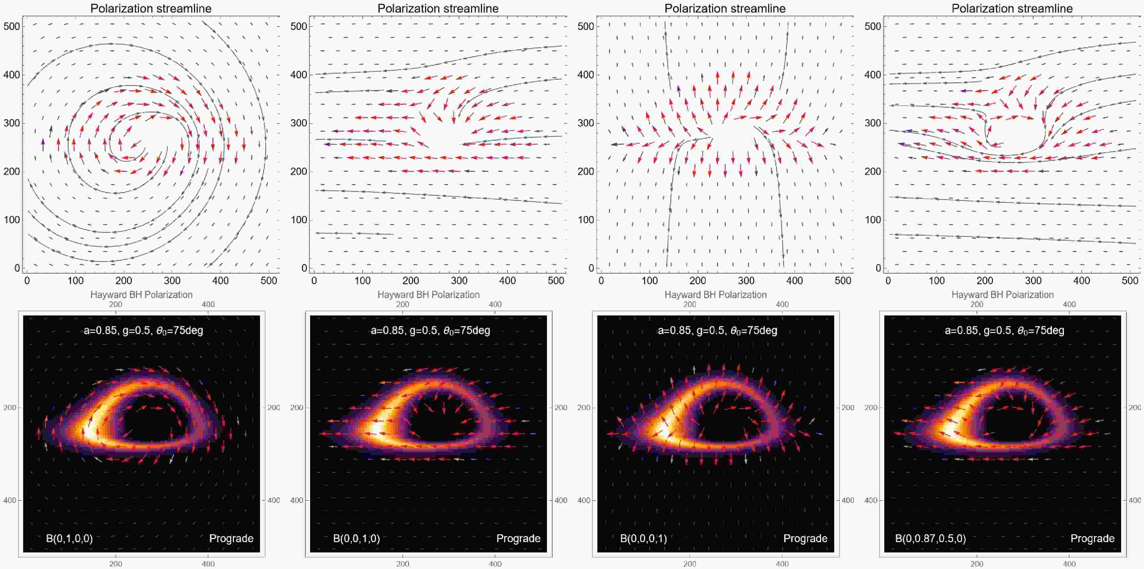 Figure 2 presents the polarization distribution and magnetic field configuration surrounding a rotating Hayward BH. The figure illustrates the polarization distribution patterns and magnetic field configurations for various magnetic field orientations. The first column shows a purely radial magnetic field, specified as $ B=(0,1,0,0) $. The resulting distribution exhibits an overall clockwise spiral pattern, with denser magnetic field lines observed at smaller observation angles ($ 0-\pi/2 $). As the observation angle increases, the magnetic field lines become more dispersed; however, they become dense again when the observation angle exceeds $ \pi/2 $.