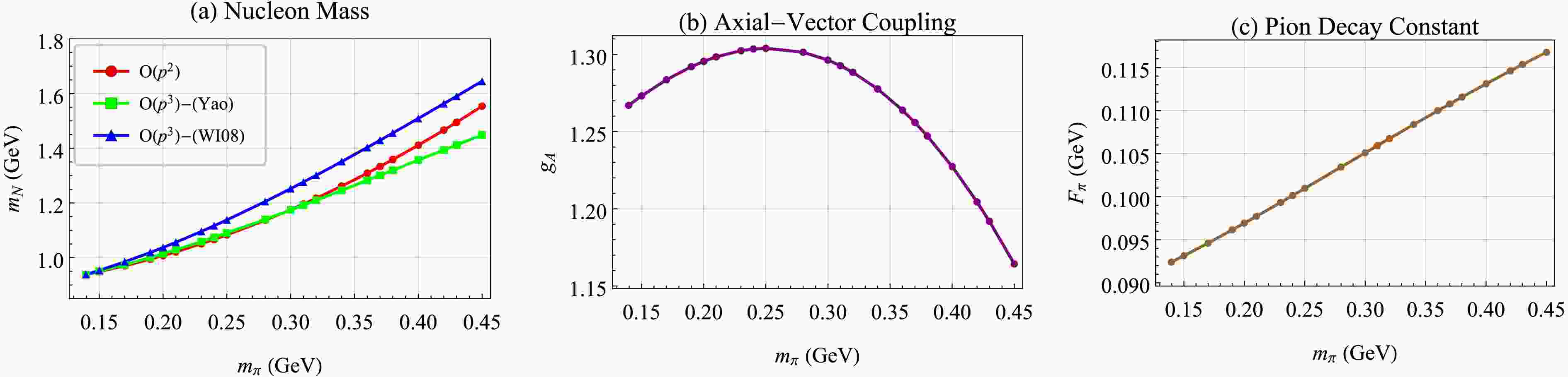 $ d_{16} = -0.83\,\text{GeV}^{-2} $ [35, 37] and LEC$ l_4^r = 0.00373 $ is derived through the evolution of its conventional value at renormalization scale$ \mu=0.77 $ [38, 39] to$ \mu=m_N $ . For the three sets of$ m_N $ vs.$ m_\pi $ dependence curves presented in the figure, the corresponding$ c_1 $ parameters are chosen from Ref. [3] for the$ O(p^2) $ order, Ref. [40] for the$ O(p^3)-(\text{Yao}) $ set and Ref. [41, 42] for the$ O(p^3)-\text{(WI08)} $ set, respectively. Since we do not consider explicit$ \Delta(1232) $ in the BχPT, we choose the parameter sets in the cases without explicit$ \Delta(1232) $ from these references.