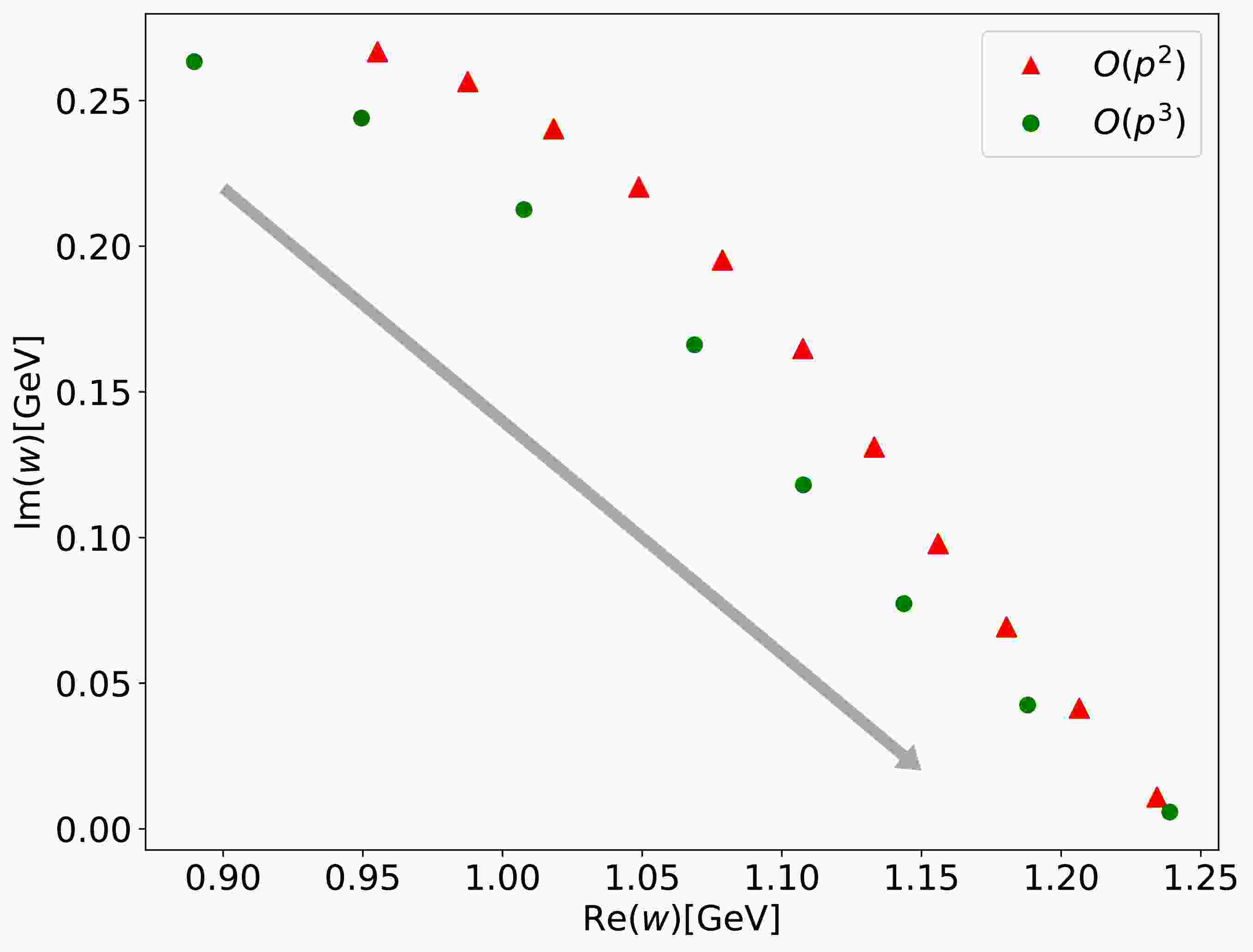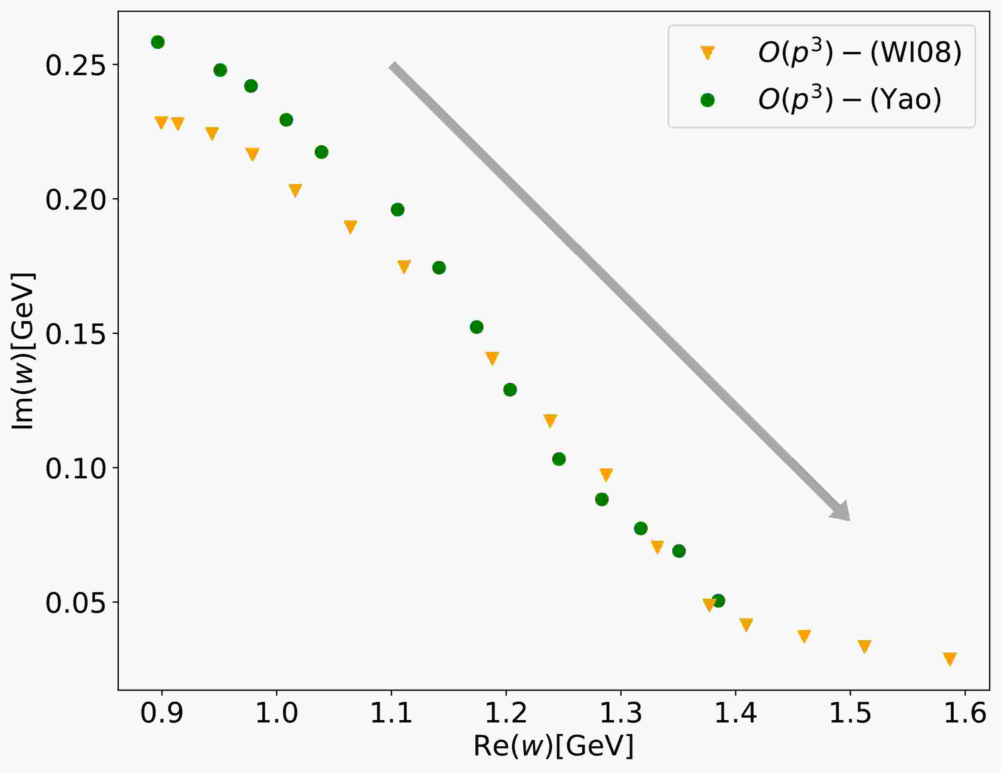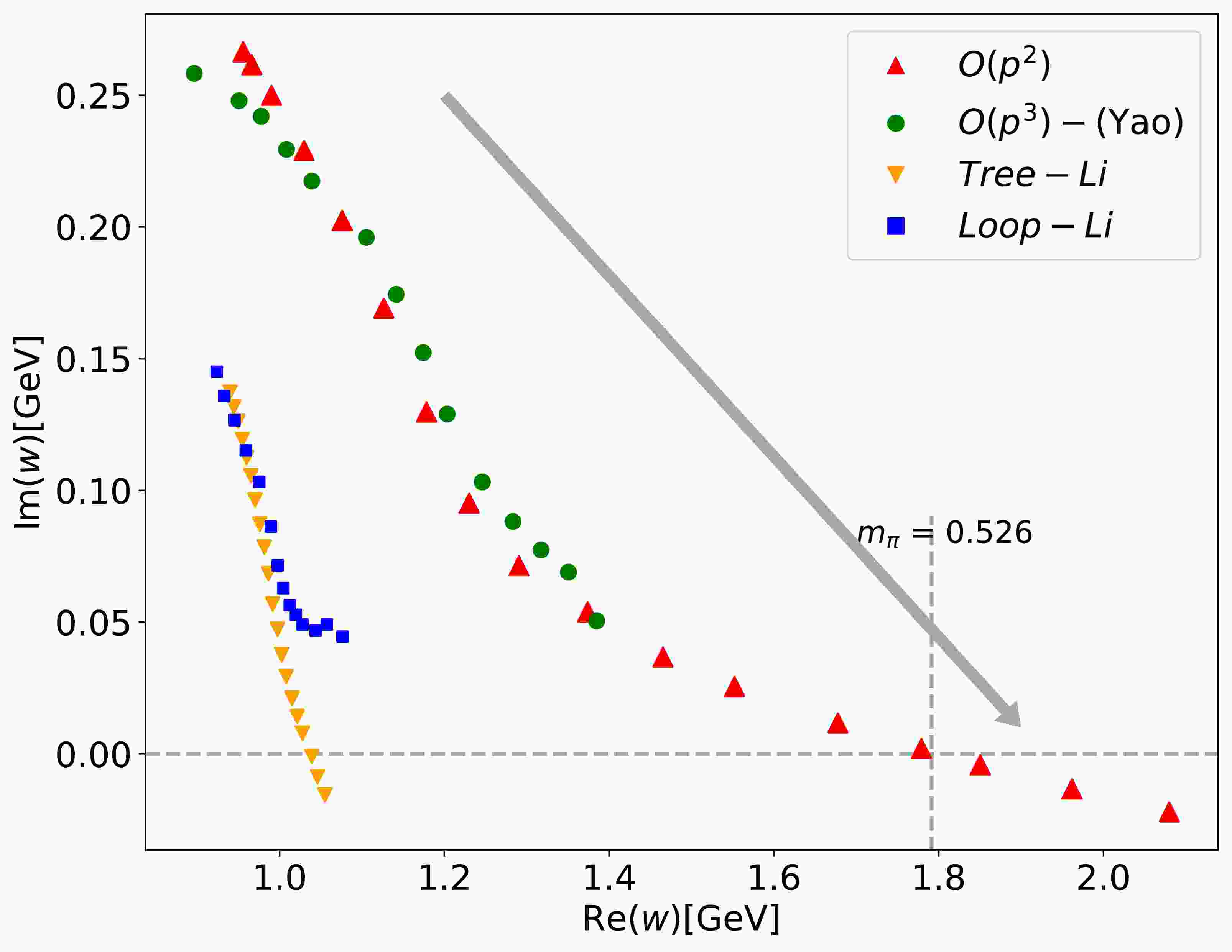 $ O(p^3) $ result shows that the trajectory continues to bend downward toward the real axis with increasing$ m_\pi $ , following a trend similar to the tree-level behavior.In addition, we tested another set of parameters [40–41], referred to as the WI08 parameter set, and found that the