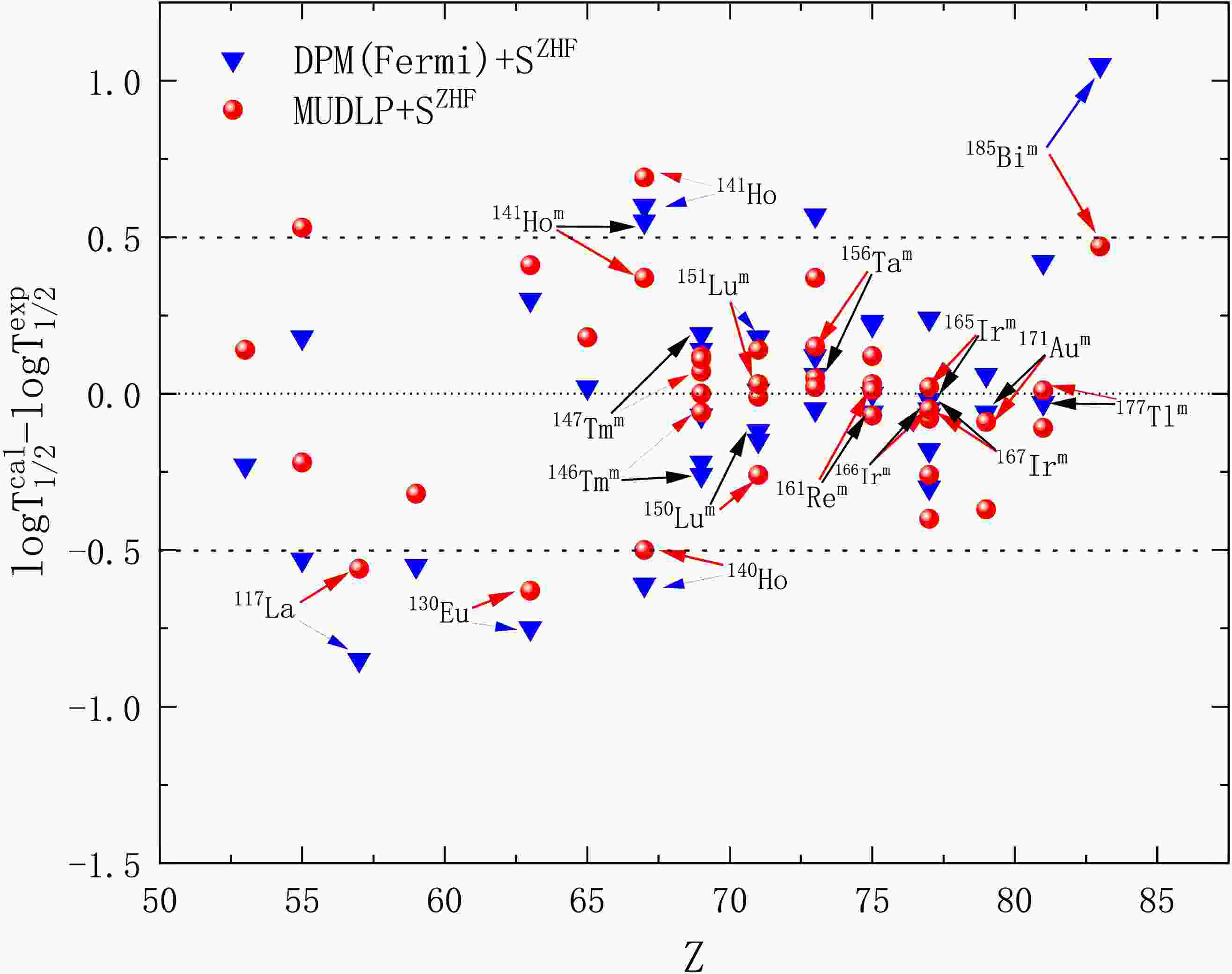$ \Delta \equiv \log_{10} T_{1/2}^{{\rm{cal}}} -\log_{10} T_{1/2}^{{\rm{exp}}} $ . For the DPM calculations employing the Fermi proton density together with the$ S_p^{{\rm{ZHF}}} $ preformation factors, the distribution is narrowly centered around zero, and the deviations for most nuclei satisfy$ |\Delta|\lesssim 0.5 $ ; the largest deviation is about$ |\Delta|= 1.05 $ . The points marked by black arrows correspond to proton emission from isomeric states of a given nucleus. Except for$ {}^{185}{\rm{Bi}}^{m} $ , these isomeric emitters all lie within the$ \pm 0.5 $ band, indicating that for given$ Q_p $ ,$ J^\pi $ (and hence the minimum orbital angular momentum l), and$ S_p $ , the present DPM framework provides a good description of isomeric decays as well. For the remaining outlier,$ {}^{185}{\rm{Bi}}^{m} $ , the positive residual (calculated half-life longer than experiment) can plausibly be attributed to the enhanced structure sensitivity near the$ Z=82 $ shell closure, a possible deformation or configuration mismatch between the parent and daughter nuclei, and the particularly small$ S_p $ value tabulated for this state.