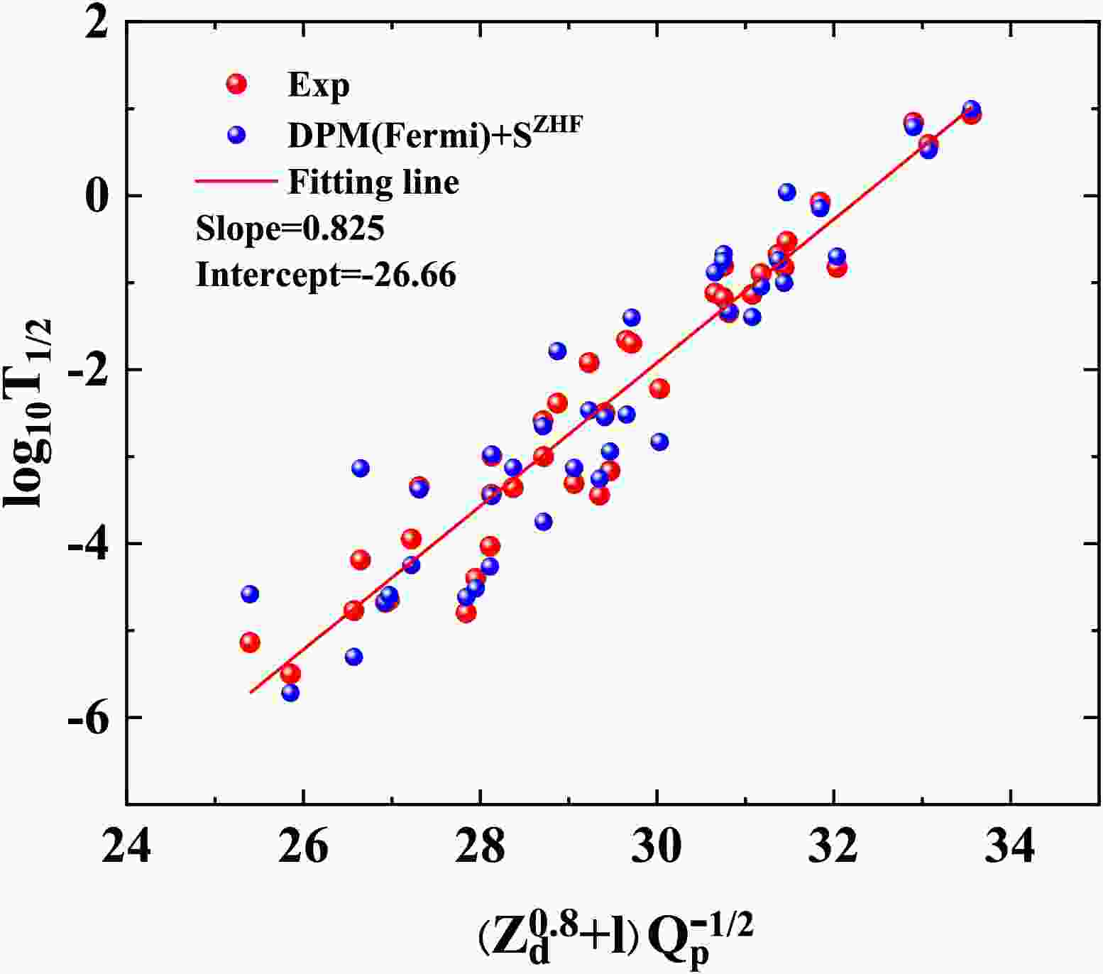 $ \log_{10}T_{1/2} $ as a function of$ X=(Z_{d}^{0.8}+l)Q_{p}^{-1/2} $ (with$ Q_{p} $ in$ {\rm{MeV}} $ ). Red circles denote experimental half-lives, and blue circles denote the present DPM(Fermi)+$ S_{p}^{{\rm{ZHF}}} $ results. The solid line is a linear fit to the experimental data.In parallel with the microscopic route, we also fit an analytic UDLP to the same data set. When preformation effects are not included explicitly (