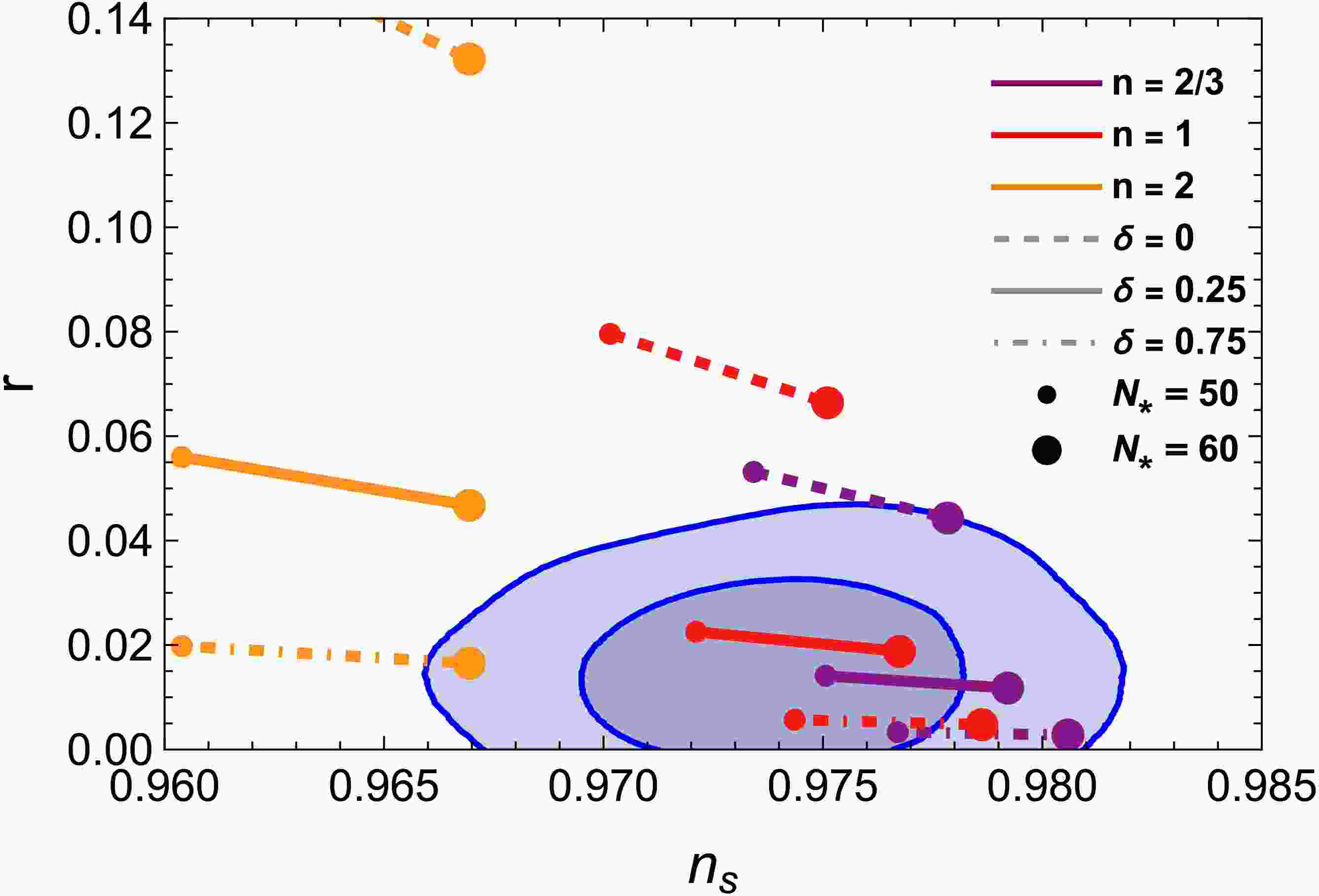 $ n_s $ and r as n and δ vary. Each curve corresponds to a variation in the number of e-folds$ N_* $ from$ 50 $ to$ 60 $ . The dark and light blue shaded regions represent the$ 1\sigma $ and$ 2\sigma $ confidence intervals from the combined P-ACT-LB-BK$ 18 $ data [9, 10]. -