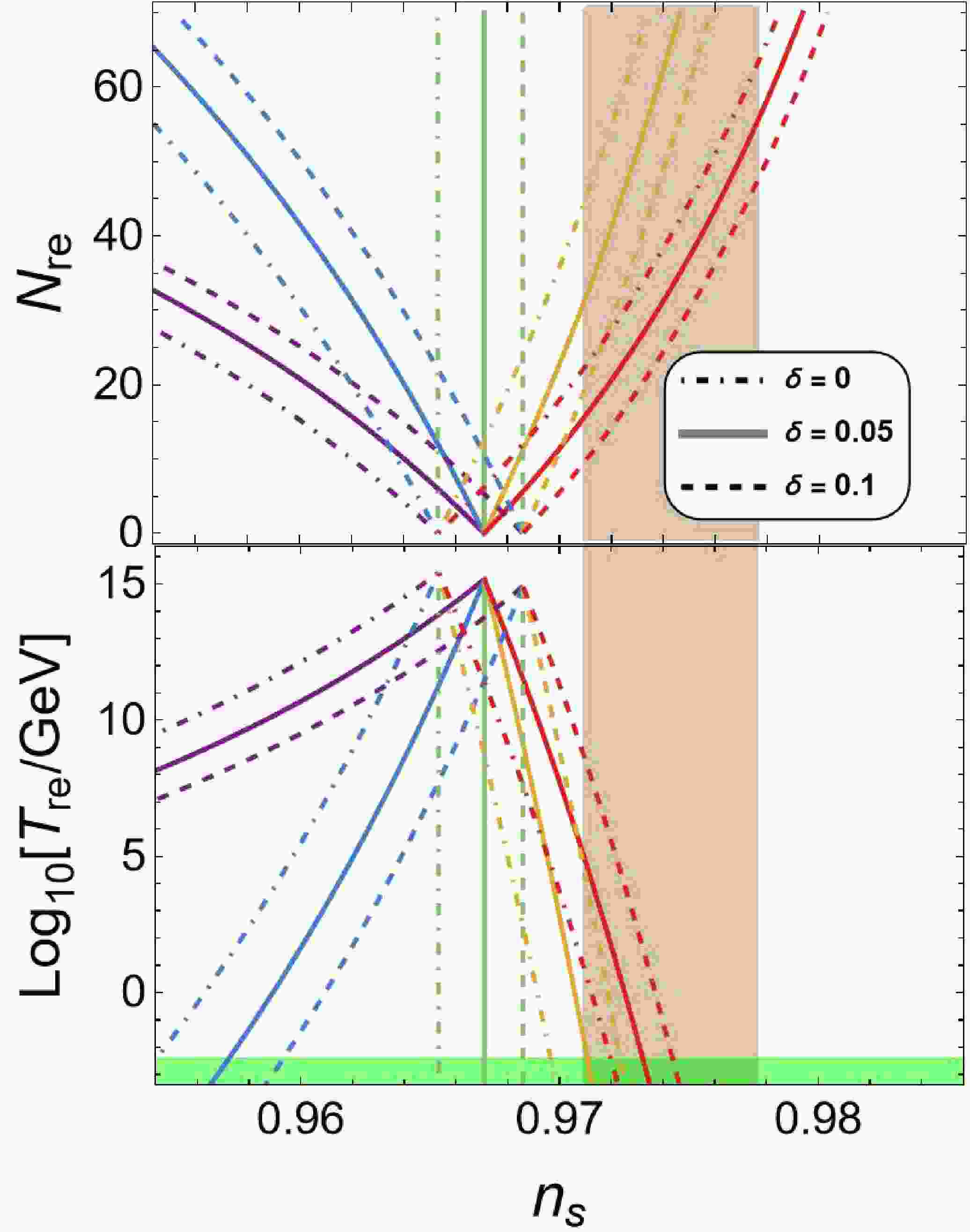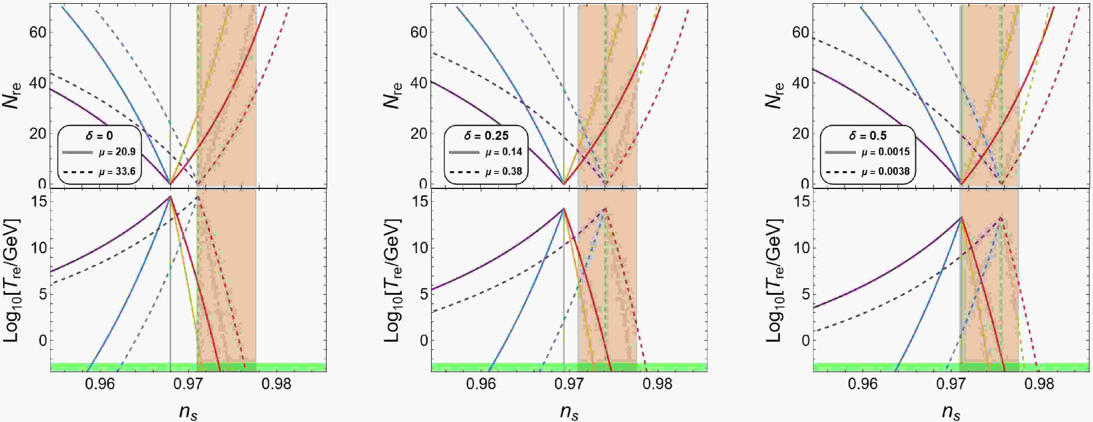$ N_{{\rm{re}}} $ and$ T_{{\rm{re}}} $ as functions of$ n_s $ . To provide a direct comparison with GR, we included the GR predictions ($ \delta=0 $ ) alongside the f(T) results ($ \delta=0.25, 0.5 $ ). For the GR case, we selected two representative field scales:$ \mu=20.9 $ and$ \mu=33.6 $ . These values correspond to the lower and upper bounds of the parameter space where the GR prediction enters the$ 1\sigma $ region of the$ (n_s, r) $ plane for$ N_*=60 $ , as shown in Fig. 2.