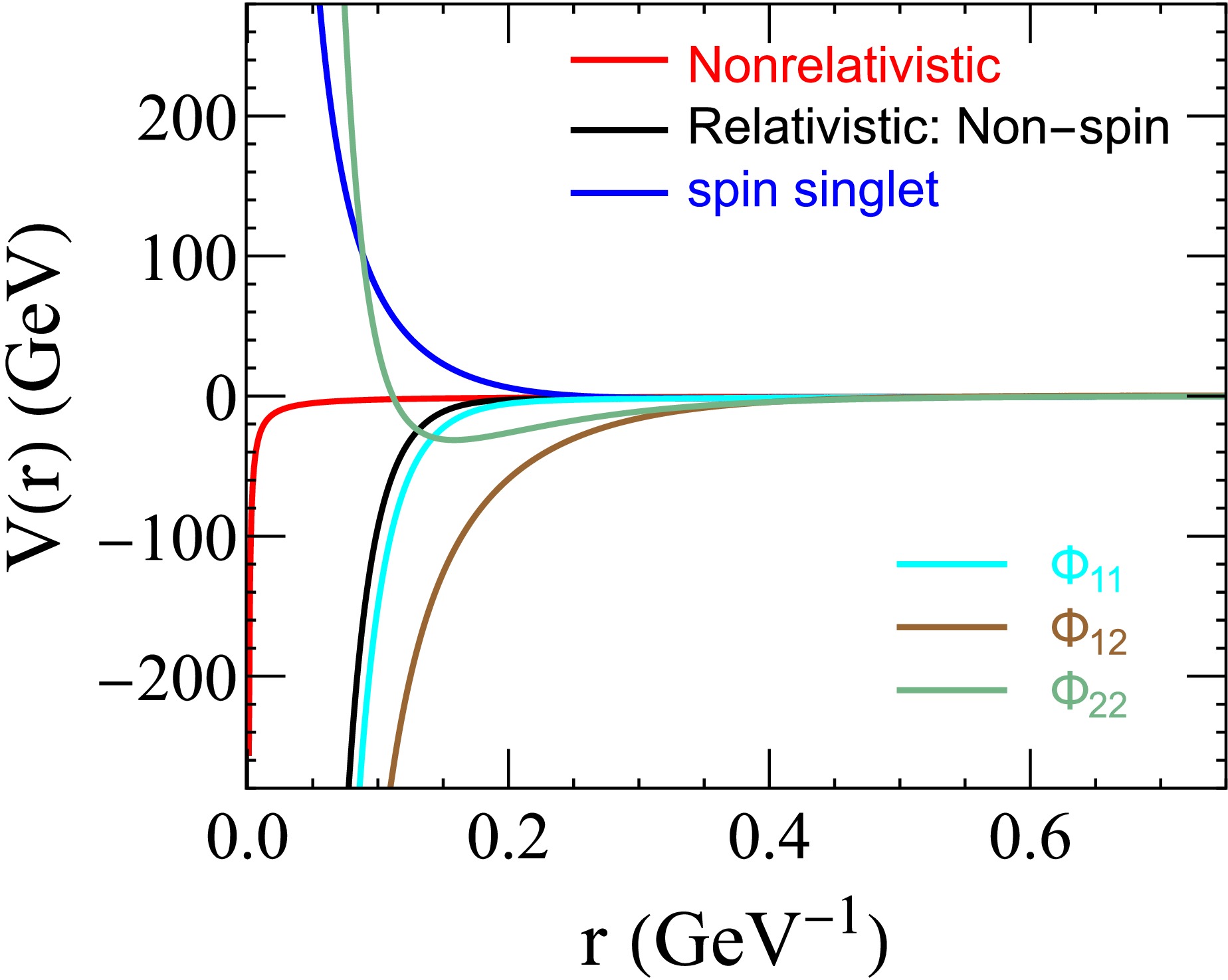The non-relativistic form of the p-p potential is shown as the red line in Fig. 1. In the relativistic case, the potential receives additional contributions from both kinetic and spin-dependent terms, as shown in Eq. (3). The relativistic potential without spin-dependent terms—meaning only including the Darwin term