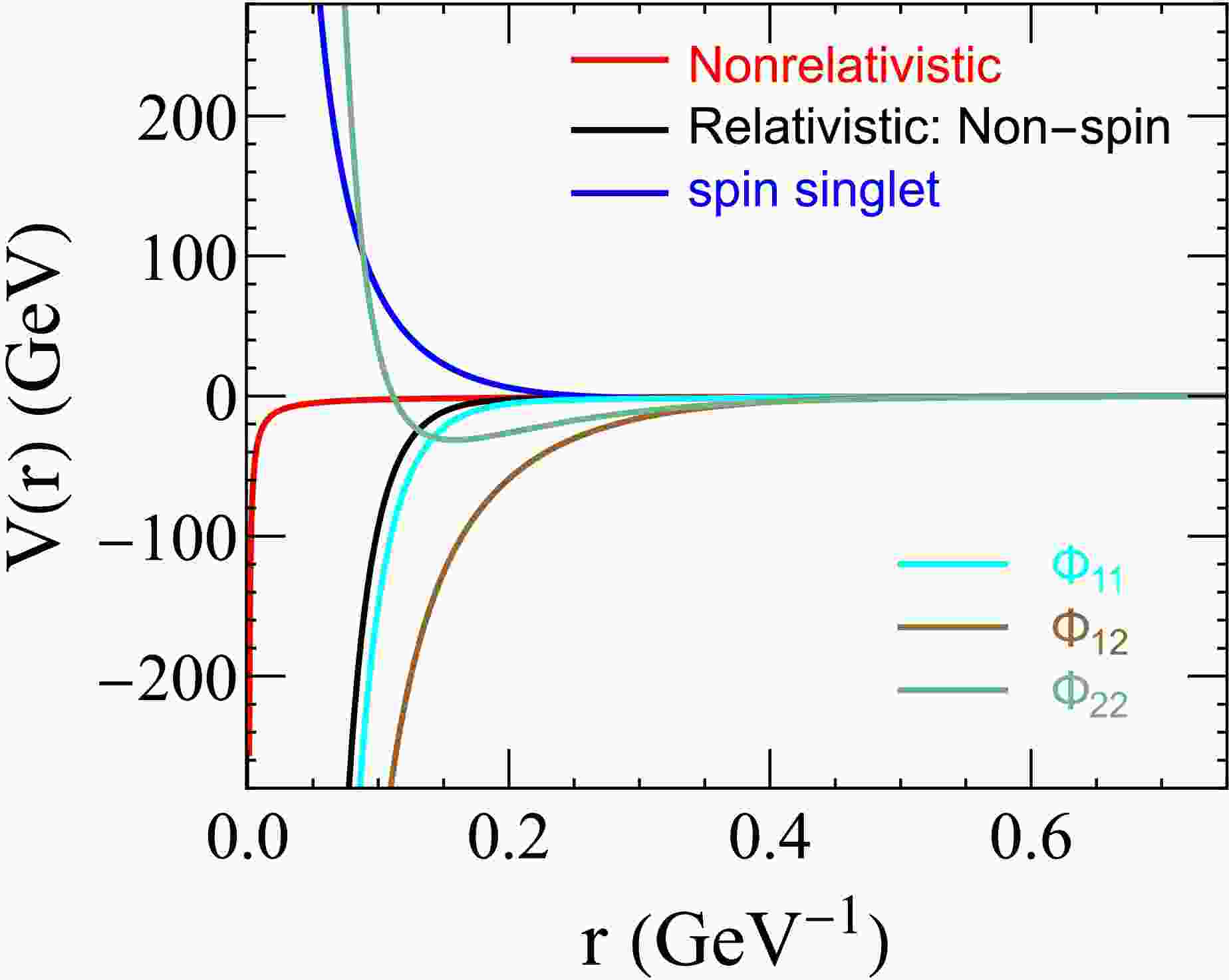 $ m_w = m_1m_2/w $ ,$ \epsilon_w = (w^2 - m_1^2 - m_2^2)/2w $ , and$ b^2(w) = \epsilon_w^2 - m_w^2 $ . ω is the total energy.$ \Phi_{\rm{IS}}=2m_w S + S^2 + 2 \epsilon_w A - A^2+\Phi_D $ is the spin-independent potential, with$ \Phi_D $ being the Darwin term. S and A are scalar (pseudoscalar) and time-like vector potentials, respectively.$ \Phi_{SS} $ ,$ \Phi_{SO} $ ,$ \Phi_{SOT} $ ,$ \Phi_{SOD} $ ,$ \Phi_{SOX} $ , and$ \Phi_{T} $ are the spin–spin, spin–orbital, and tensor interactions. The explicit forms of these terms can be found in Ref. [37].$ \begin{aligned}[b] \Phi_D =\;& -{2F'(\cosh{2K} - 1)\over r} + F'^2 + K'^2 +m(r)\\ &+{2K'\sinh{2K} \over r} - \nabla^2 F - {2(\cosh{2K} - 1) \over r^2} ,\\ \Phi_{SO} =\;& -{F' \over r} - {F' (\cosh{2K} - 1) \over r} - {\cosh{2K} - 1 \over r^2} \\& + {K' \sinh{2K} \over r},\\ \Phi_{SOD} =\;& l'(r)\cosh{2K} - q'(r)\sinh{2K},\\ \Phi_{SOX} =\;& q'(r)\cosh{2K} - l'(r)\sinh{2K},\\ \Phi_{SS} =\;& k(r) + {2K'\sinh{2K} \over 3r} - {2F'(\cosh{2K} - 1) \over 3r} \\& - {2(\cosh{2K} - 1) \over 3r^2} + {2 F' K' \over 3} - {\nabla^2 K \over 3},\\ \Phi_T =\;& {1 \over 3} \Big[ n(r) + {3F'\cosh{2K} \over r} + {F' (\cosh{2K} - 1) \over r} \\ &+ 2F'K' - {K'\sinh{2K} \over r} - {3K'(\cosh{2K} - 1) \over r}\\ &- \nabla^2 K + {3\sinh{2K} \over r^2} + {\cosh{2K} - 1 \over r^2}\Big],\\ \Phi_{SOT} =\;& -{K'(\cosh{2K} - 1) \over r} + {\sinh{2K} \over r^2} - {K' \over r} \\& + {F'\sinh{2K} \over r}, \end{aligned} $