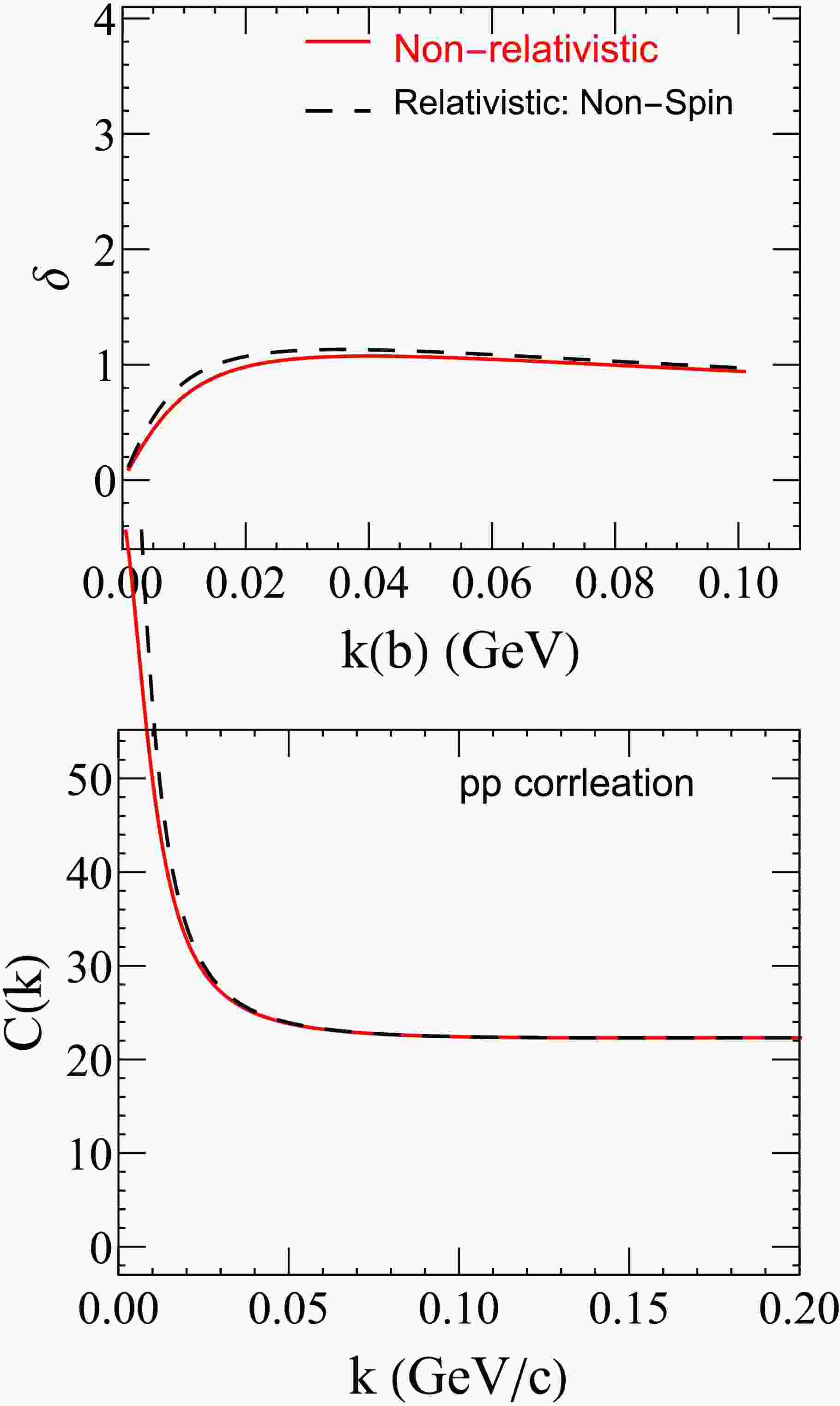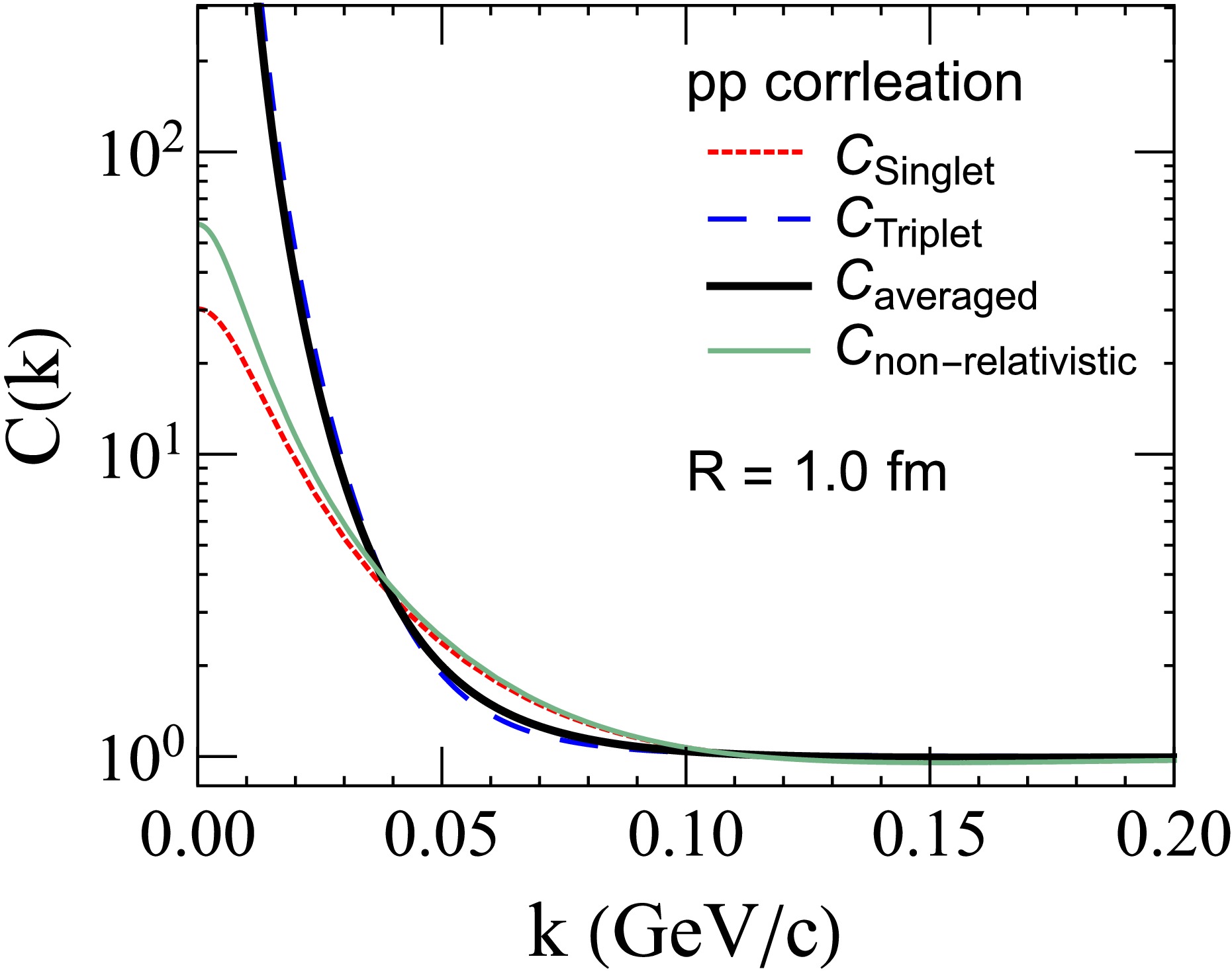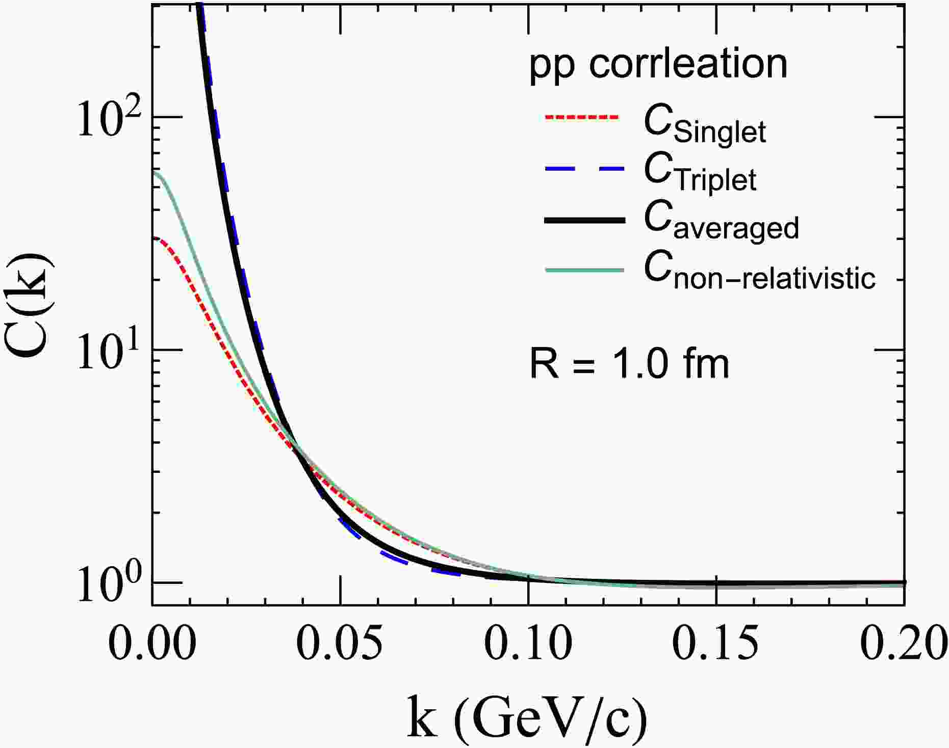 $ C_{\rm{Singlet}} $ and$ C_{\rm{Triplet}} $ are the correlation functions for the spin-singlet and spin-triplet states, respectively. The spin-averaged correlation function is shown in Fig. 5 with a thick black line. Compared to the non-relativistic scenario$ C_{\rm non-relativistic} $ , it is evident that the inclusion of relativistic corrections enhances the two-nucleon correlation function due to the stronger effective interaction. This highlights the importance of considering relativistic effects in the study of hadron-hadron correlations. Conversely, when extracting information about the hadron emission source and the underlying hadronic interaction from experimental correlation data, it is essential to account for these relativistic corrections. -