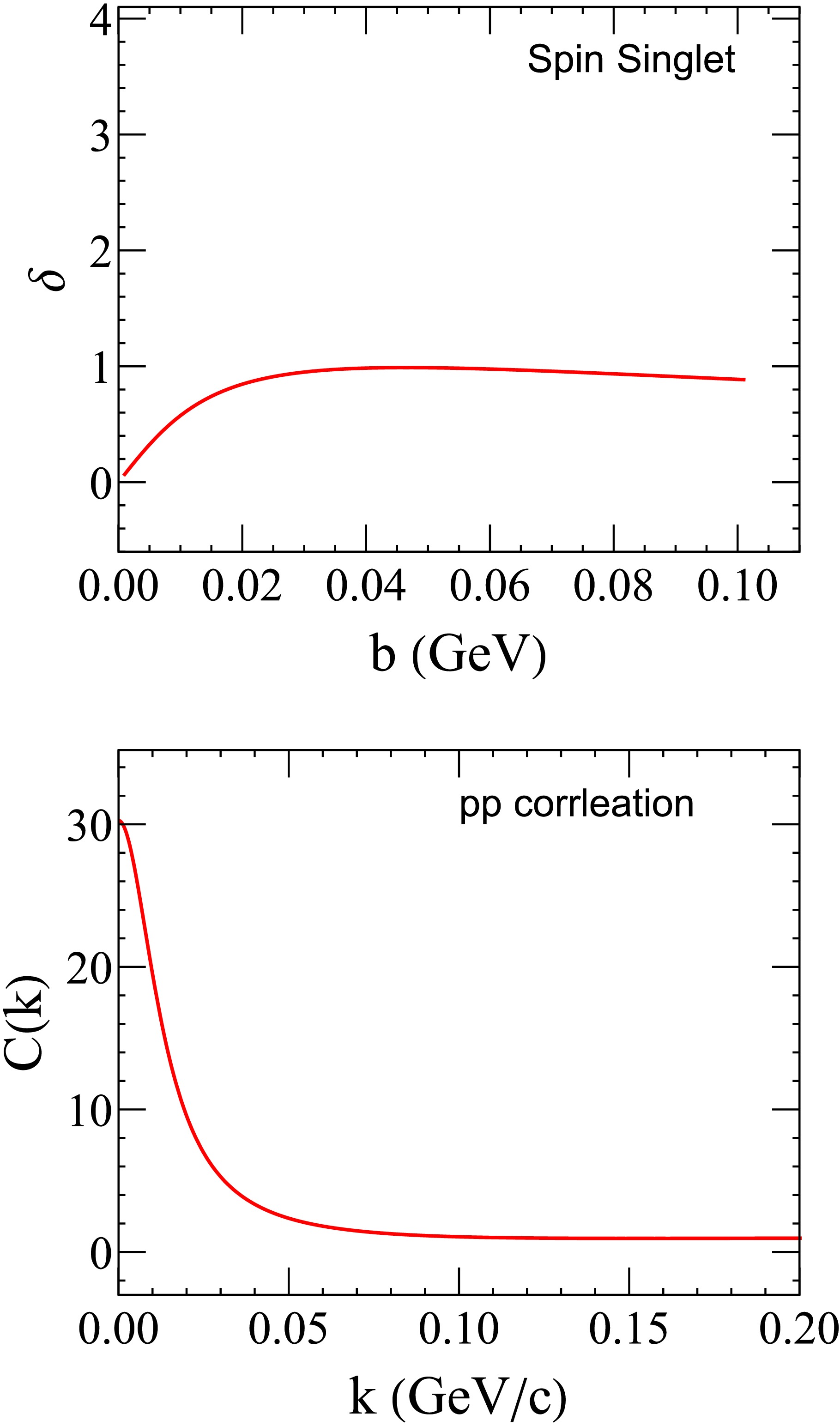 $ C_S $ and$ C_D $ , depicted by the red-solid and black-dashed lines, respectively. The S-wave contribution exhibits a positive correlation at low relative momentum, consistent with the attractive nature of the S-wave interaction. In contrast, the D-wave contribution shows a negative correlation at small k, which can be attributed to the repulsive effect of the centrifugal barrier, proportional to$ (J+1)(J+2)/r^2 $ .In experimental measurements, distinguishing the spin state of the two-particle system is generally not feasible. As a result, the observed correlation function corresponds to a spin-averaged quantity. Assuming the absence of polarization, the contributions from different spin states are weighted according to their statistical spin factors. Specifically, the spin-averaged correlation function is expressed as,