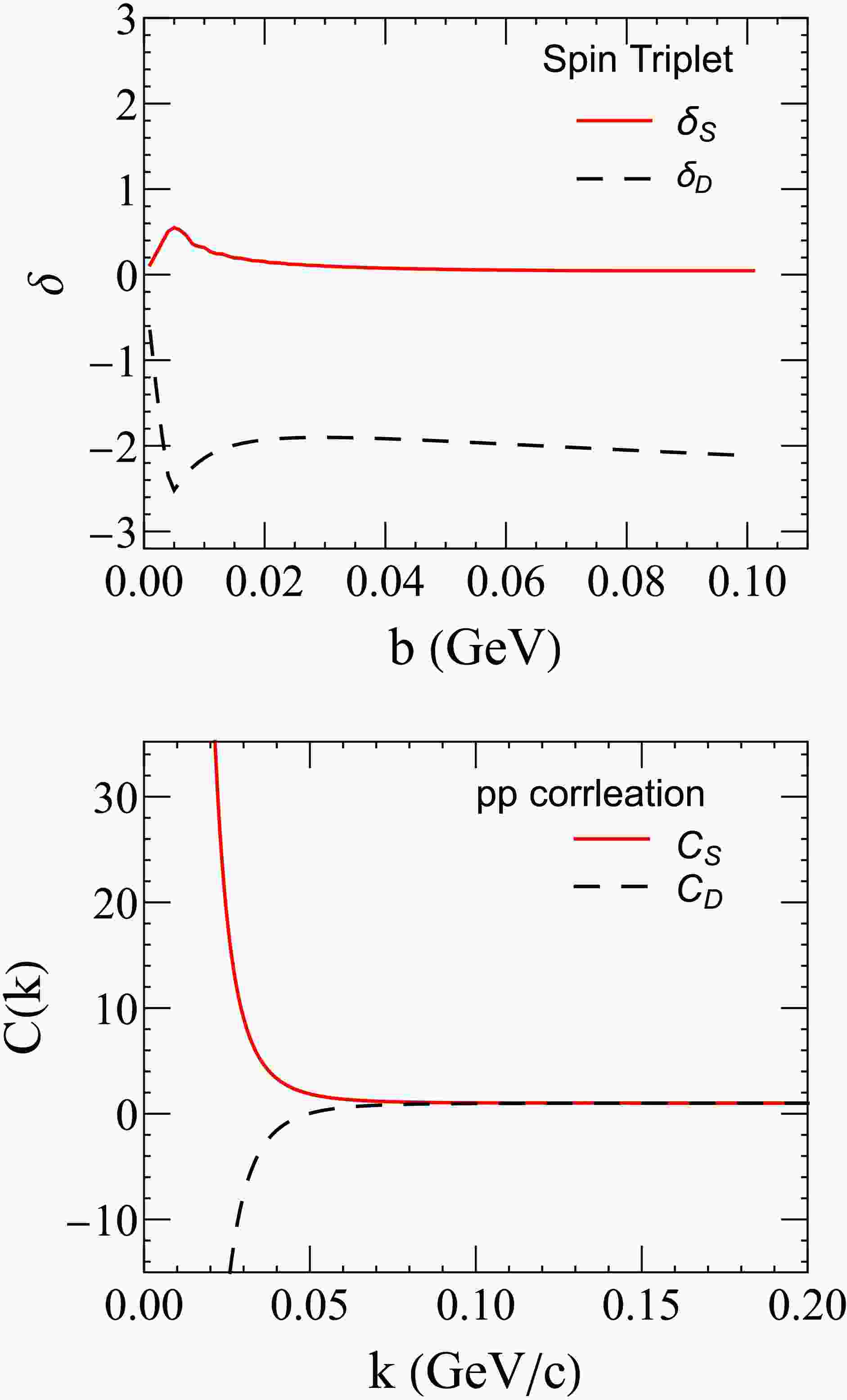 $ \delta_S $ ) and D-wave ($ \delta_D $ ) components, respectively. (Bottom panel) The correlation functions of S-wave ($ C_S $ ) and D-wave ($ C_D $ ) components.$a_0$ (fm)$r_{\rm eff}$ (fm)non-relativistic -18.69 2.82 relativistic w/o spin -24.15 2.71 spin singlet -13.43 2.99 spin triplet -22.10 -129.35 Table 1. The S-wave scattering length