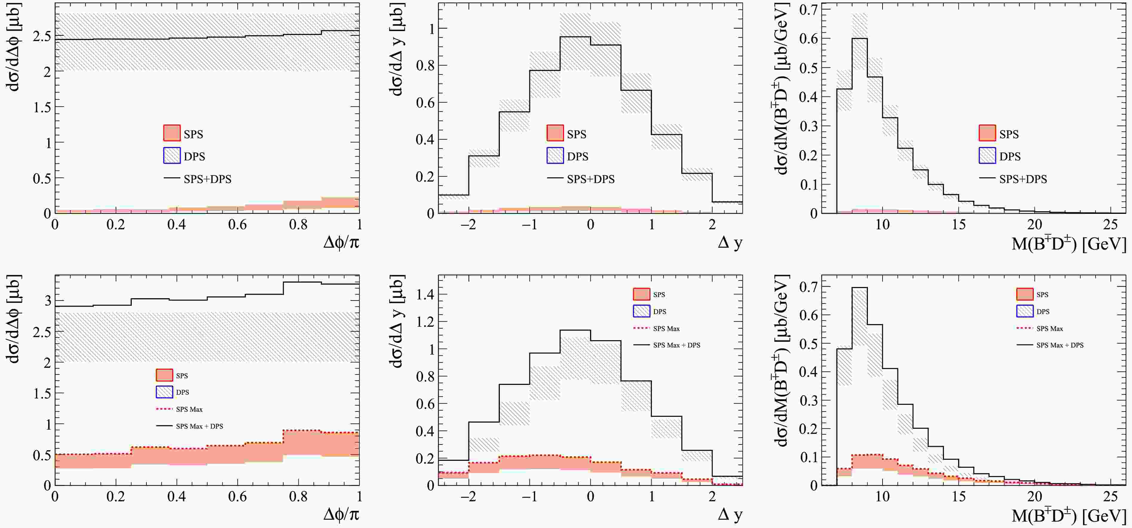 $ B^\mp D^\pm $ production via SPS, DPS, and their combination (SPS+DPS) are shown in Fig. \ref{fig:sps_dps_eff15}. The upper panels correspond to the NLO SPS prediction in the 3FNS, while the lower panels show the LO SPS prediction in the 4FNS. The shaded bands denote the combined statistical and systematic uncertainties. For both SPS and DPS, statistical uncertainties are estimated from the event samples. The DPS systematic uncertainty originates from the uncertainties on$ \sigma_{B^\mp} $ and$ \sigma_{D^\pm} $ , whereas the SPS systematic uncertainty is dominated by variations of the renormalization and factorization scales in the perturbative calculations.In the SPS mechanism, the azimuthal angle difference distribution,