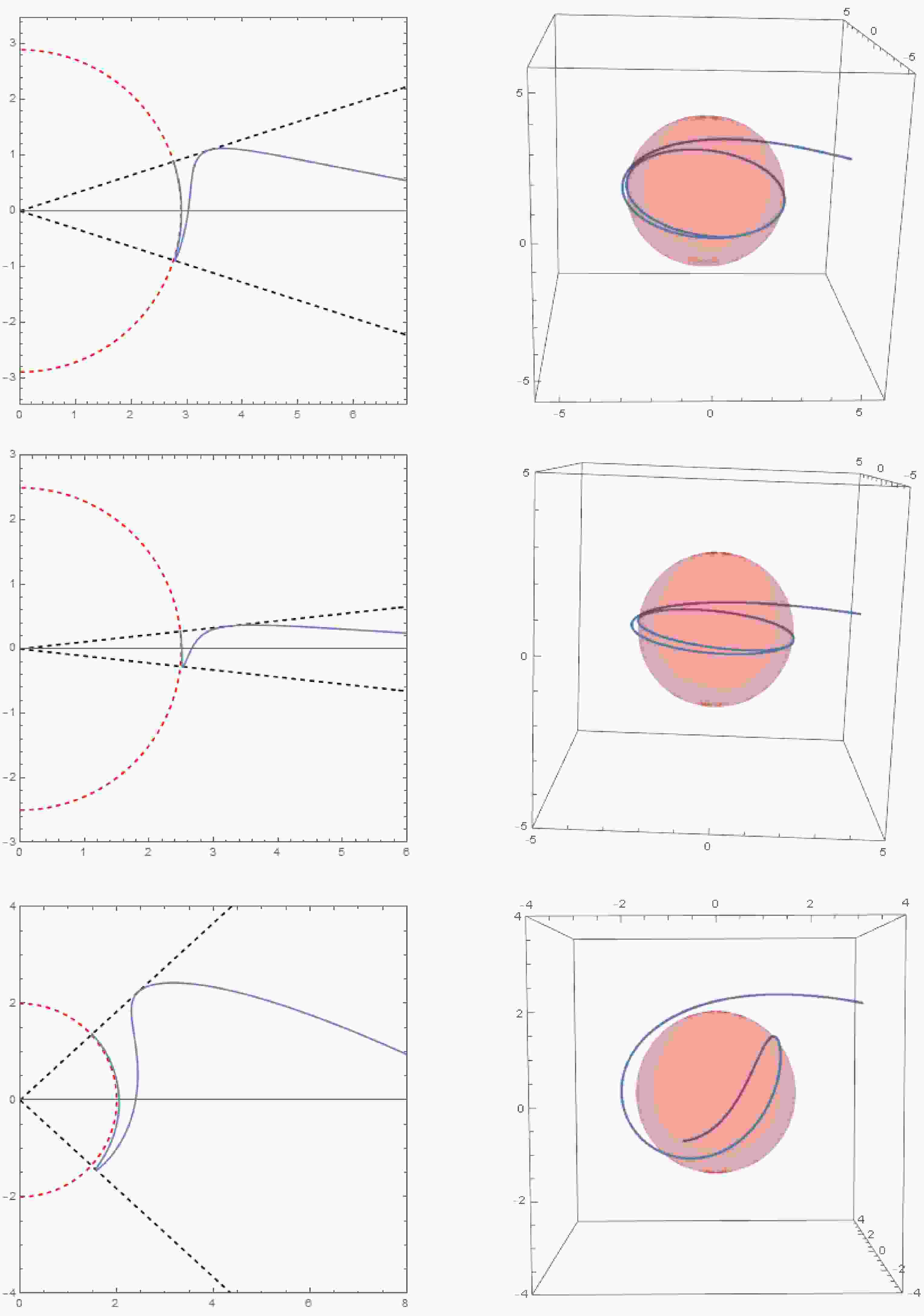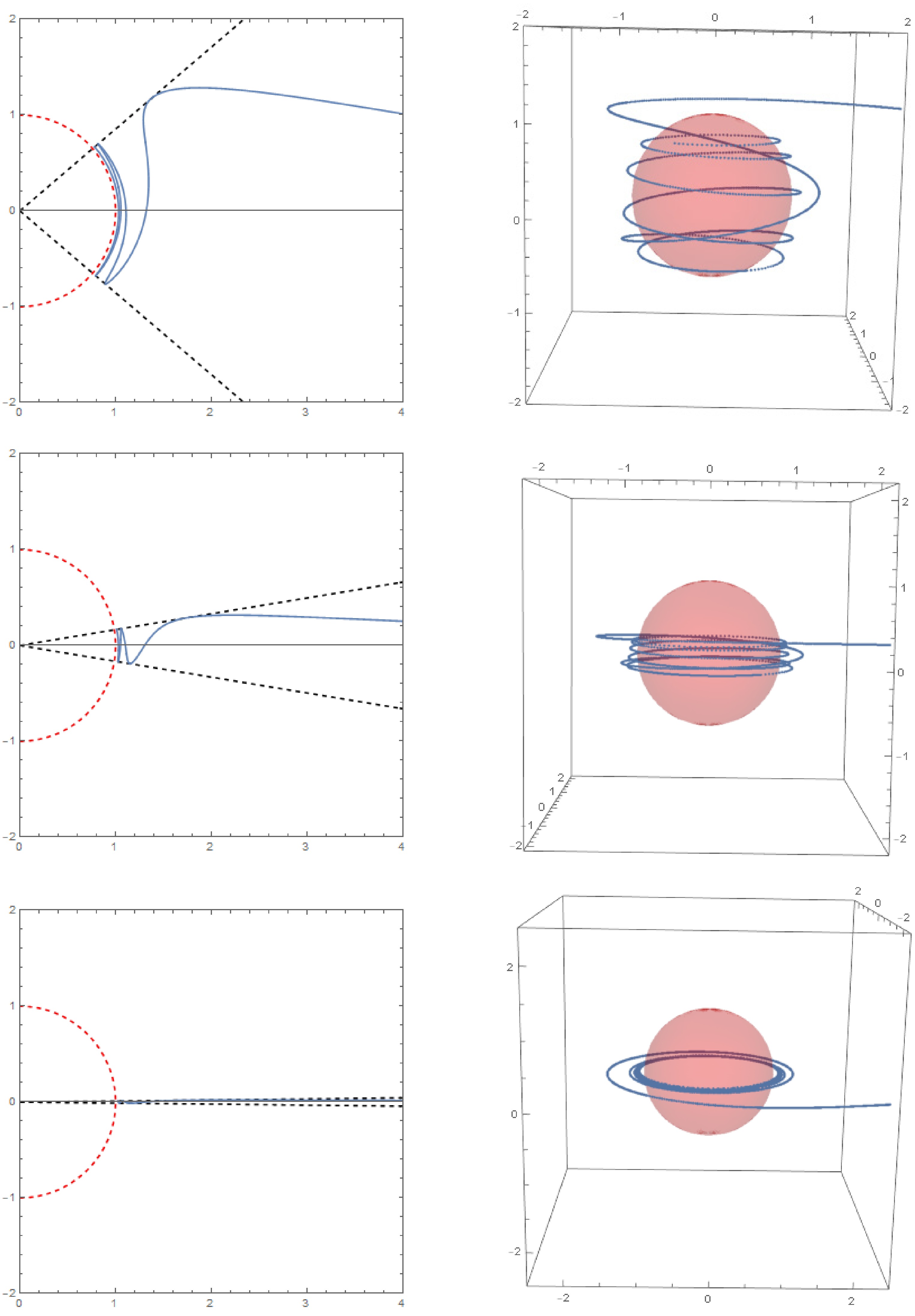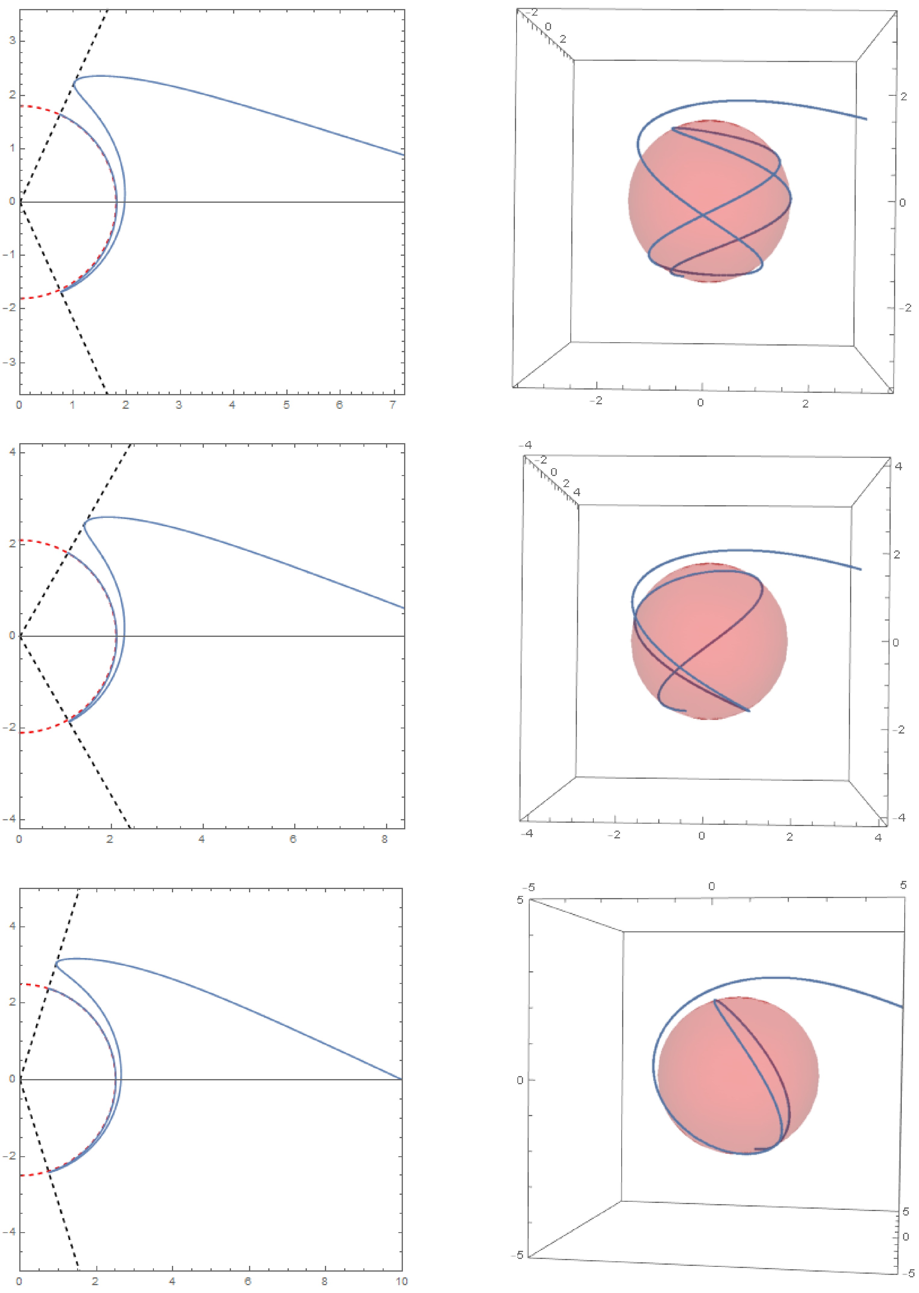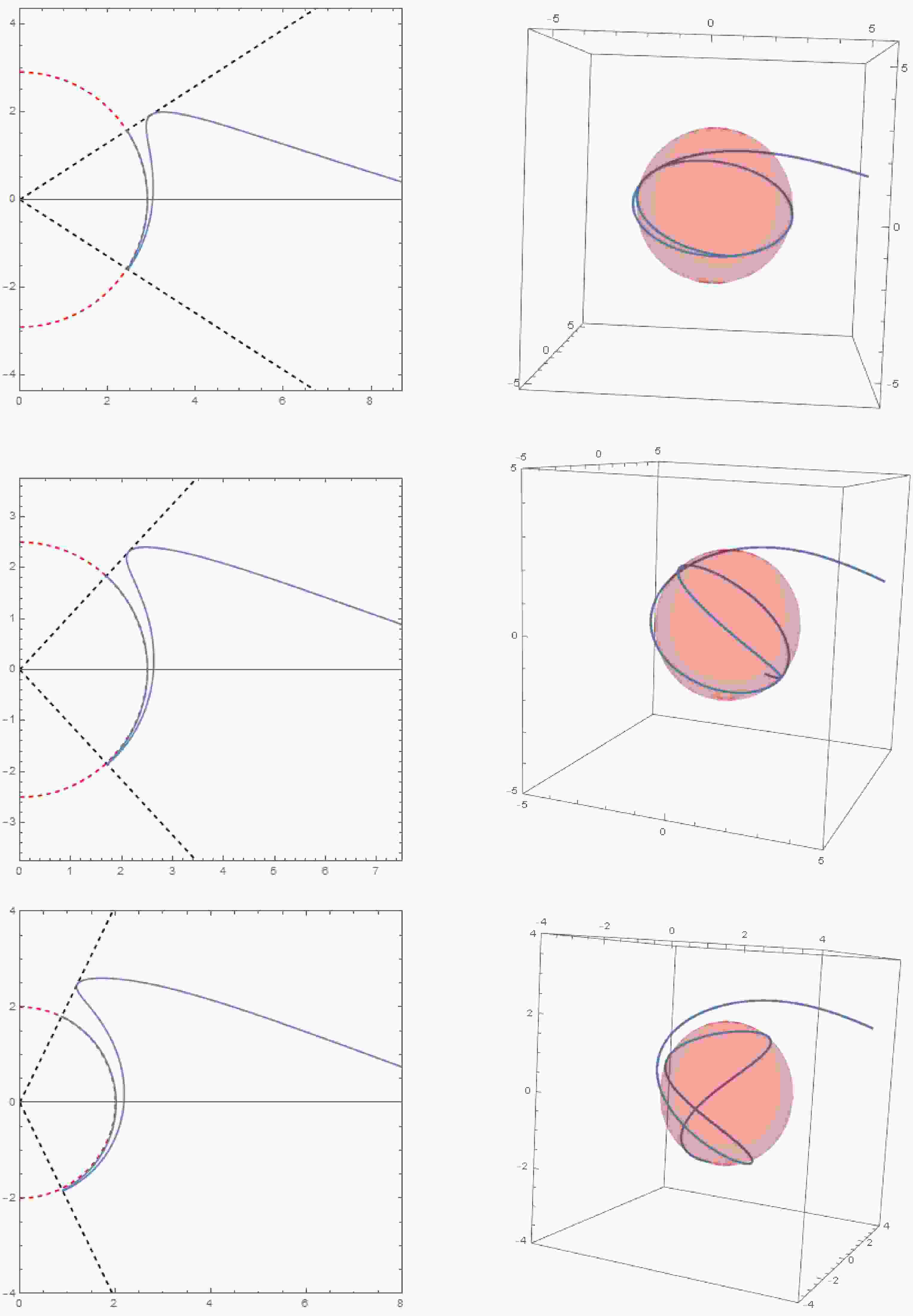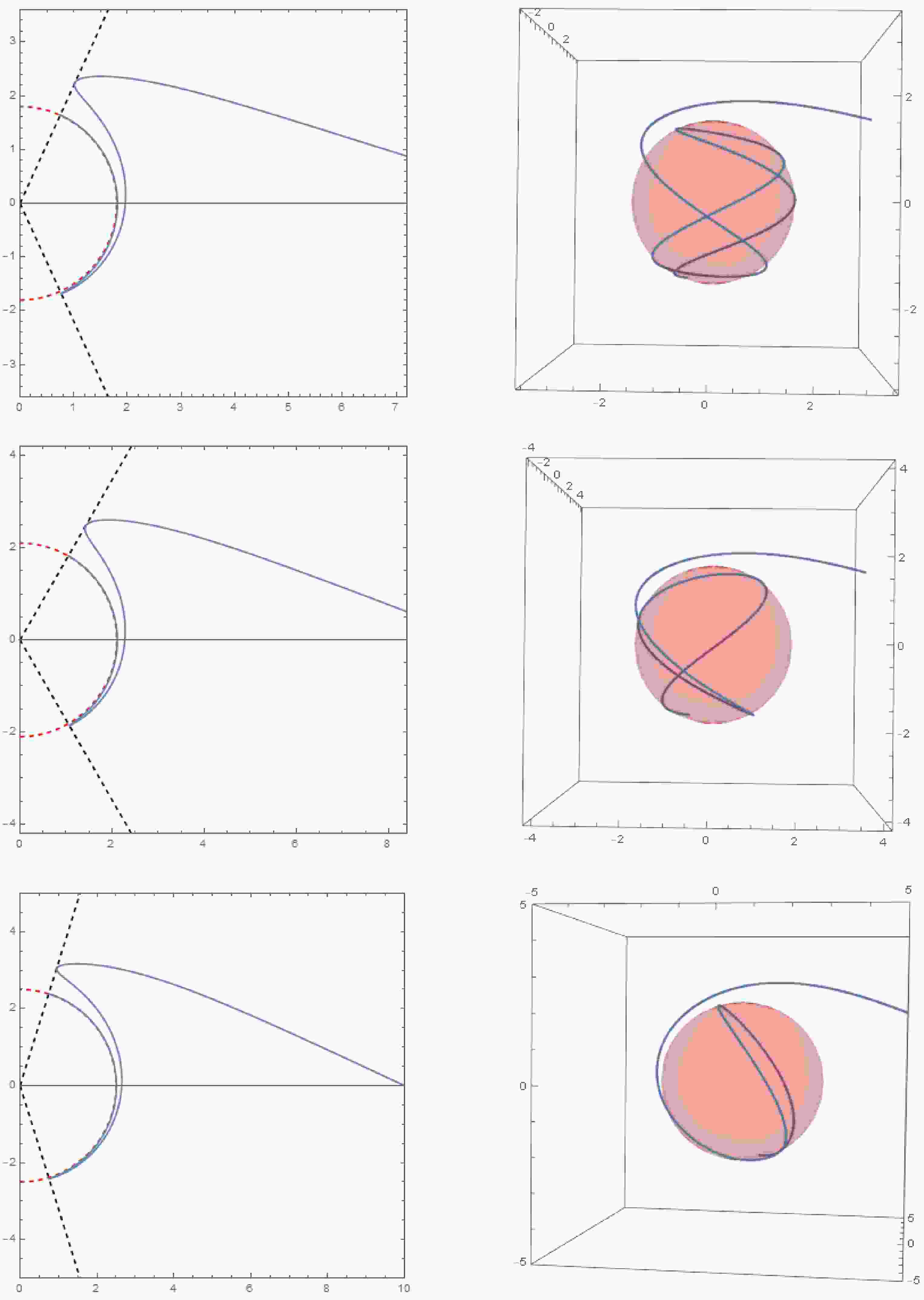 Figure 12.  Critical timelike orbits with coincident double roots in Kerr-Newman spacetime. The left diagram illustrates the trajectory of a timelike geodesic in the $ (r,\theta) $ plane, while the right diagram shows the corresponding trajectory in three-dimensional space. The initial conditions are $ r_{i} = 10,\mu_{i} = 0,\varphi_i = 0 $. The parameter sets for each row of images (from top to bottom) are $ a = 0.8, r_c = 1.8, Q = 0.5, \tilde{e} = 1.1, \chi = 1.1; a = 0.8, r_c = 2.1, Q = 0.3, \tilde{e} = 1.3, \chi = 1.3; a = 0.4, r_c = 2.5, Q = 0.6, \tilde{e} = 1.5, \chi = 1.5 $.