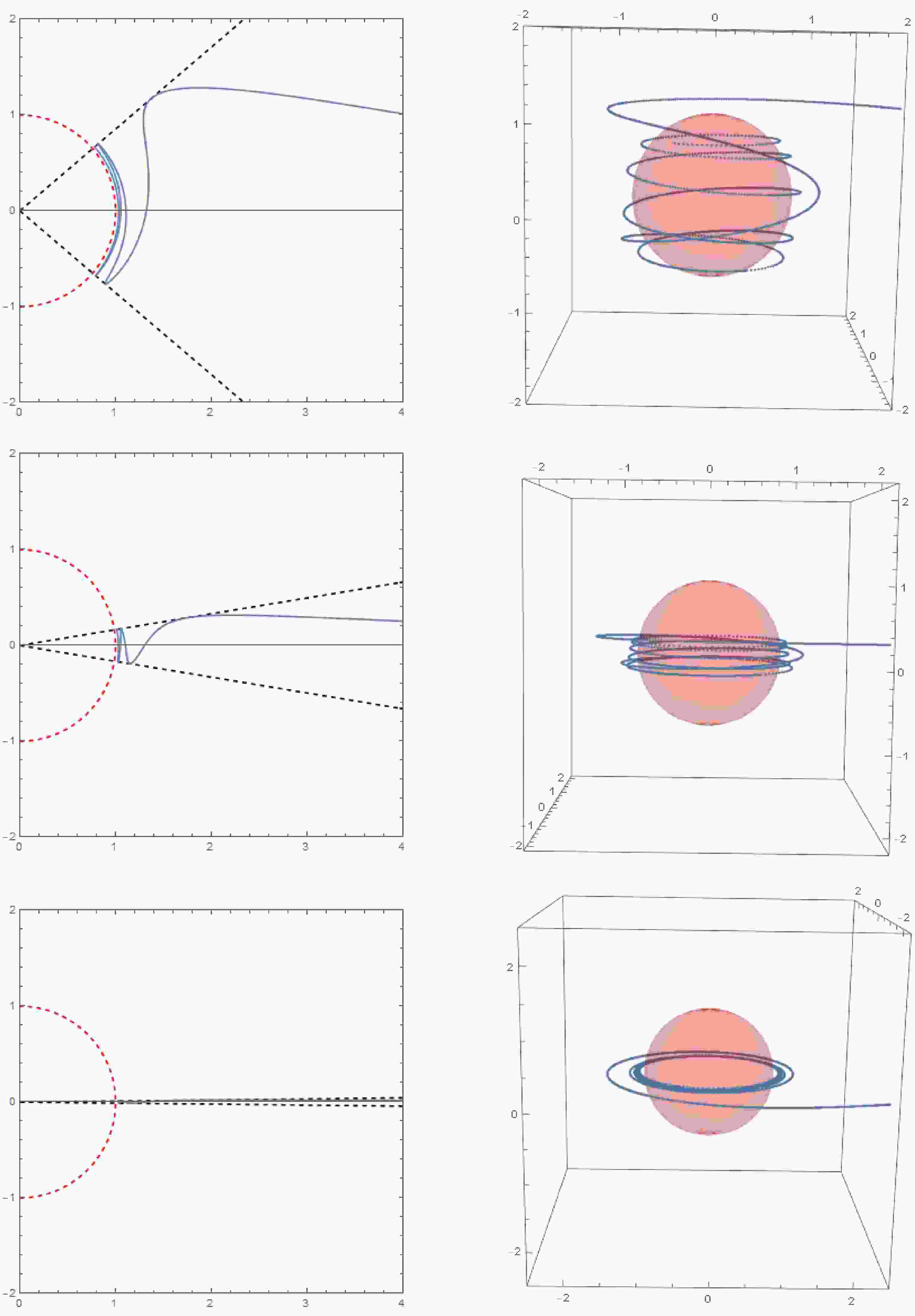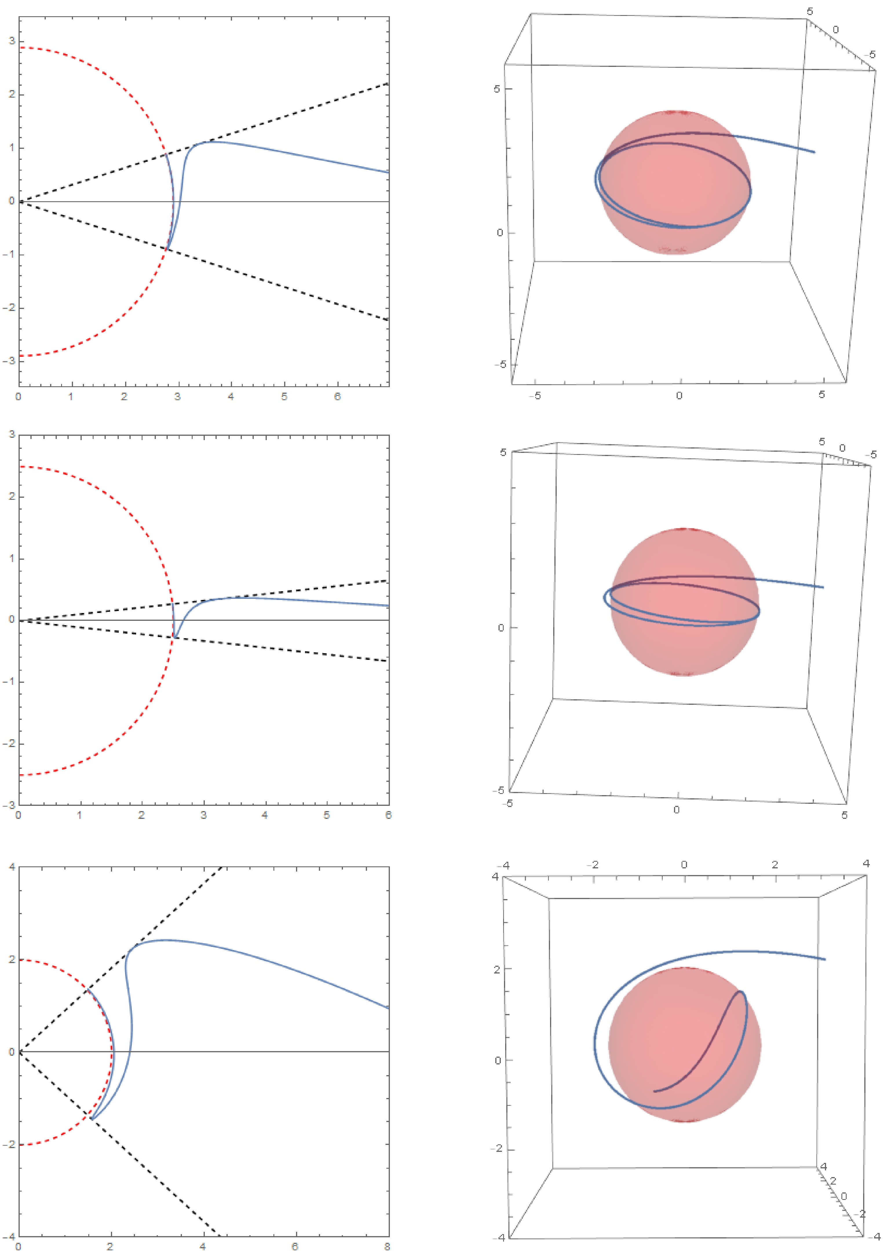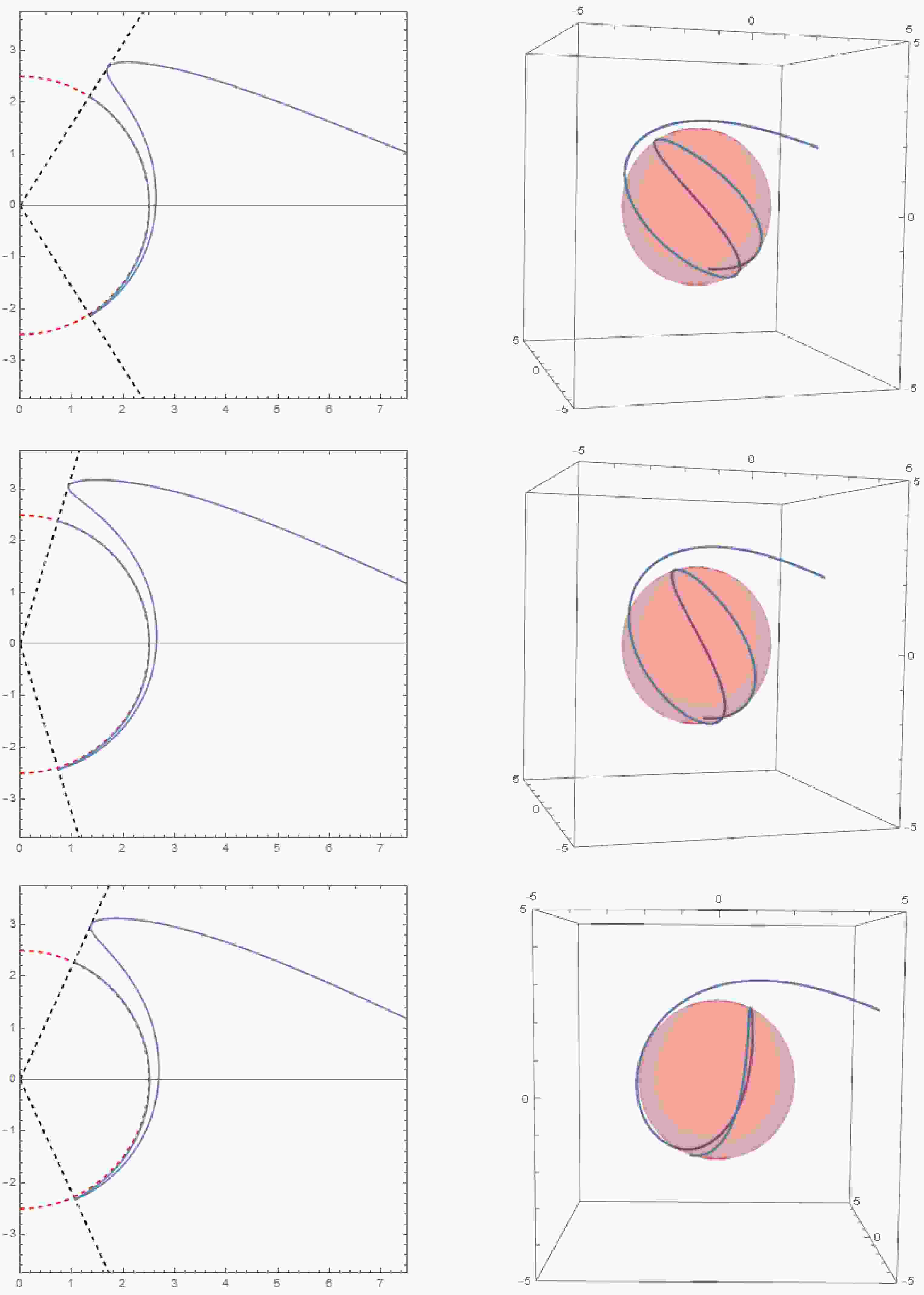 Figure 11.  Critical null orbits corresponding to double coincident roots in Kerr-Newman spacetime are shown. The left diagram illustrates the trajectory of a null geodesic in the $ (r,\theta) $ plane, while the right diagram shows the trajectory of a null geodesic in three-dimensional space. The mass of the black hole is set to $ M = 1 $, and the initial conditions are $ r_{i} = 10,\mu_{i} = 0,\varphi_i = 0 $. The parameters for each row of images (from top to bottom) are $ Q = 0.3, Q = 0.5, $ and $ Q = 0.866 $ with $ a = 0.5, $ and $ r_c = 2.5 $. The red dashed line (ball) marks $ r = r_c $ and the black dashed line denotes $ \mu = \pm \mu_{m} $.