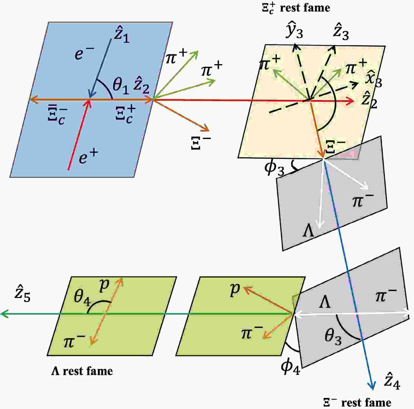 $ \Xi^+_c $ production and the collision plane is defined as$ \phi_1 $ . For the three-body decay of$ \Xi^+_c \to \Xi^- \pi^+ \pi^+ $ , the Euler angles$ (\phi_2,\theta_2,\psi_2) $ are used. The system is rotated from$ \hat{z}_{2} $ to$ \hat{z}_{3} $ following the ZYZ convention. In$ \Xi^- $ decays, a rotation from$ \hat{z}_{3} $ to$ \hat{z}_{4} $ is needed. Due to the rotational invariance of helicity, this rotation operation does not introduce any additional modifications. In fact, the angle$ \psi_2 $ will not contribute to integrated cross sections we are interested in, and the selection of pion does not alter amplitudes since the meson's spin is zero. -