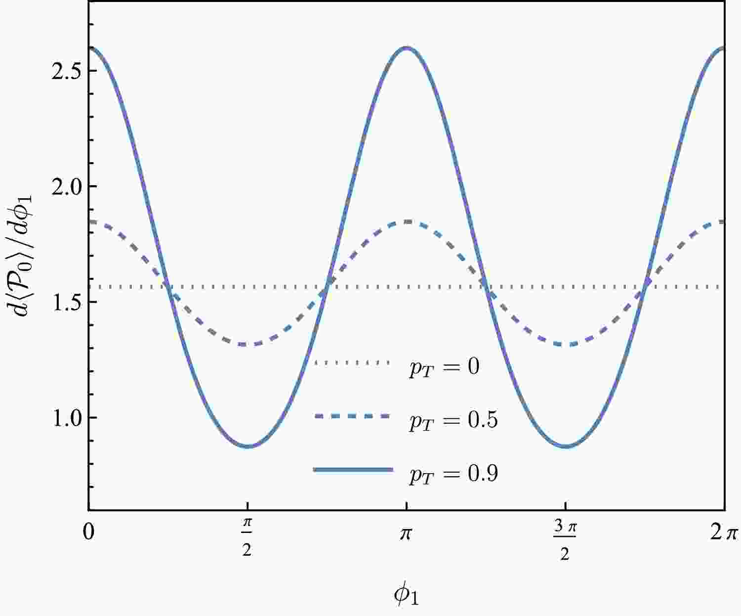 $ {{\cal{P}}}_0 $ as a function of$ \phi_1 $ for$ p_T=0 $ ,$ 0.5 $ ,$ 0.9 $ (dotted, dashed and solid lines, respectively).