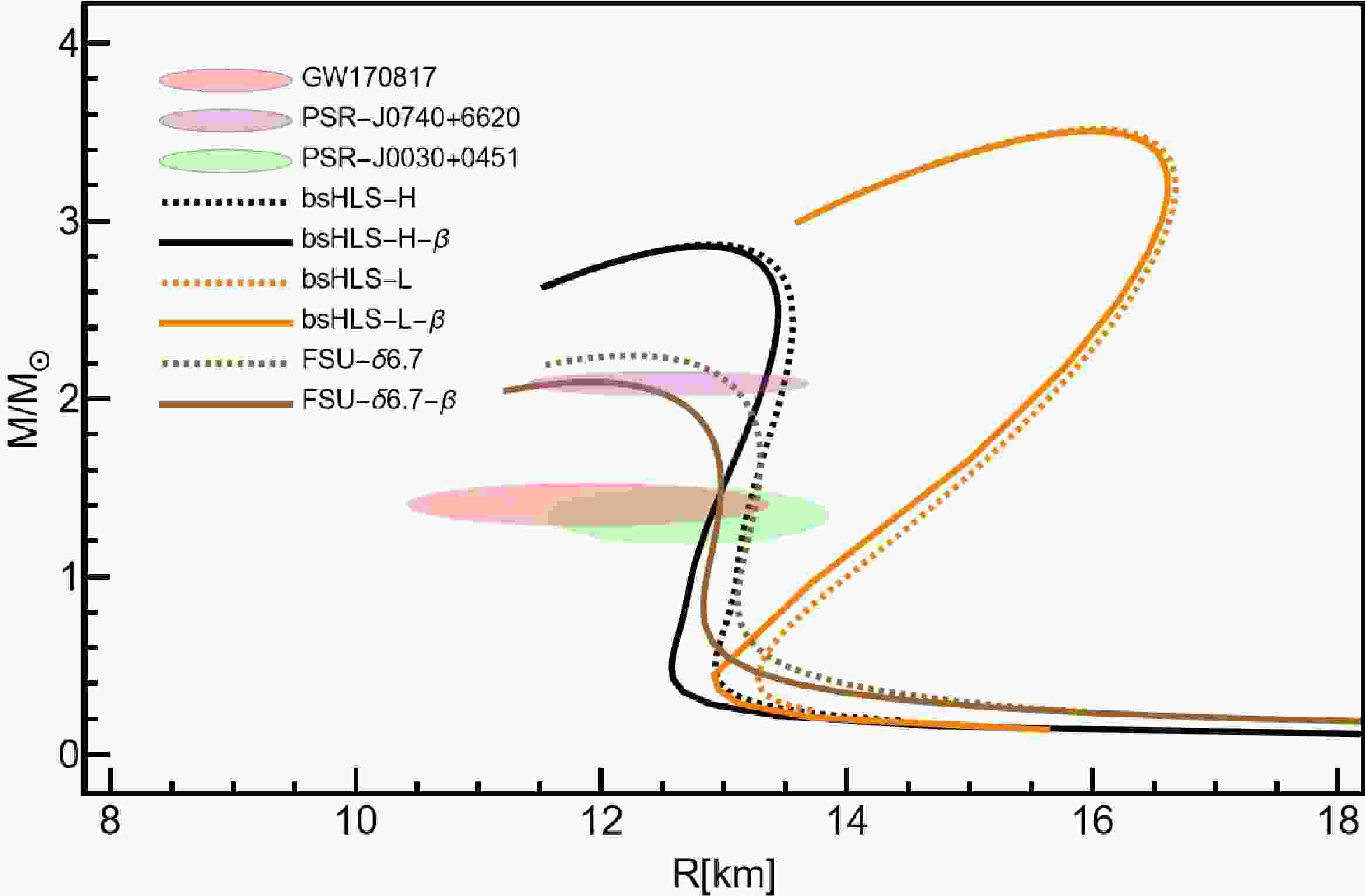 $\delta6.7$ are close to the constraints of GW170817 [43]. This is due to the softness of$E_{\rm{sym}}$ from these two at intermediate densities, as shown in Fig. 1. However, the tidal deformation of bsHLS-L is very large, though the symmetry energy at intermediate densities is also soft. The reason lies in the very early surge of incompressibility, as shown in Fig. 1 leading to large maximum mass of NS, resulting a more distorted M-R relation: compact NSs for small mass ones but loose NSs to reach such a large maximum mass. The same reasoning applies to the Walecka-type models, NL3, TM1, BKA22, BSR12.In order to show the rationality of the above discussions, we also plot the M-R relations in beta equilibrium matter—a more realistic case but beyond the present framework—in Fig. 3. One can see that the maximum mass of a NS doesn't change much, while the M-R relations all become more compact, favored by observations. So, the inclusion of beta equilibrium matter doesn't change the main conclusion drawn above.