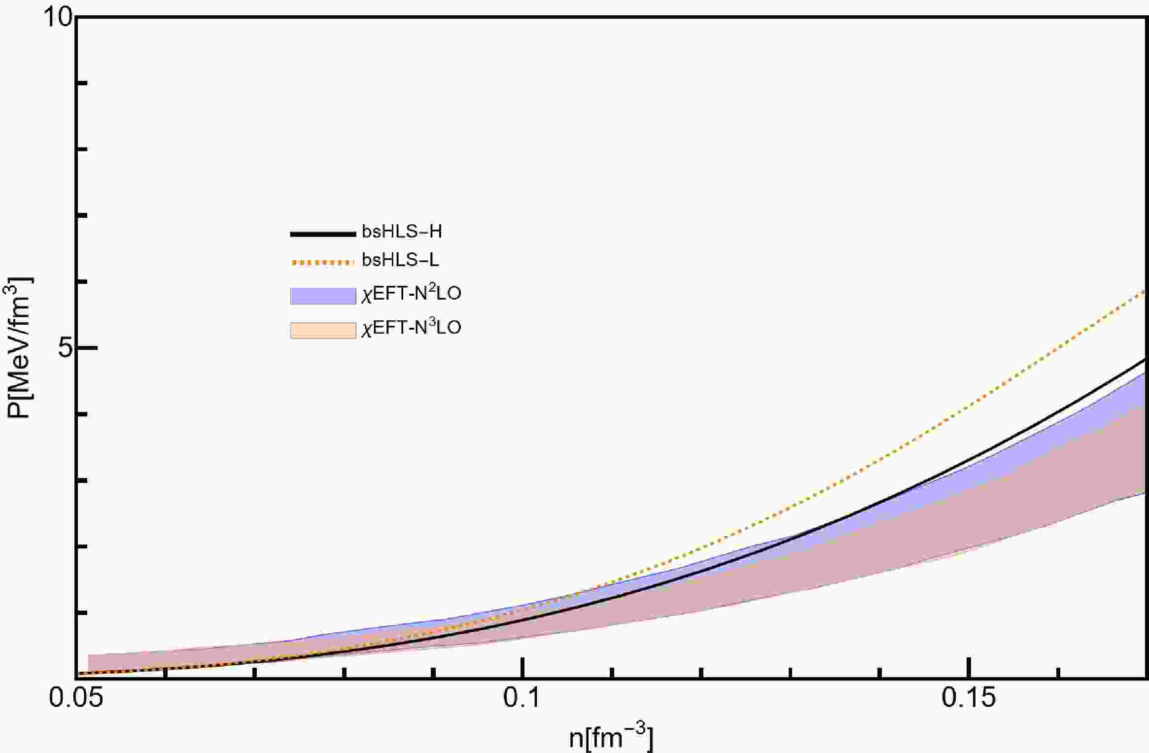 The difference between bsHLS-L and bsHLS-H becomes significant in the M-R relation, as shown in Fig. 2 and discussed in the previous section, though it is not distinguishable from the NM properties around saturation density. In order to understand these more deeply, the pressure of PNM is calculated around and below saturation density, and compared with the results of the conventional chiral nuclear force, as shown in Fig. 4. One can see that the pressure of bsHLS-H can align with the constraints up to saturation density, while bsHLS-L is a little higher around
