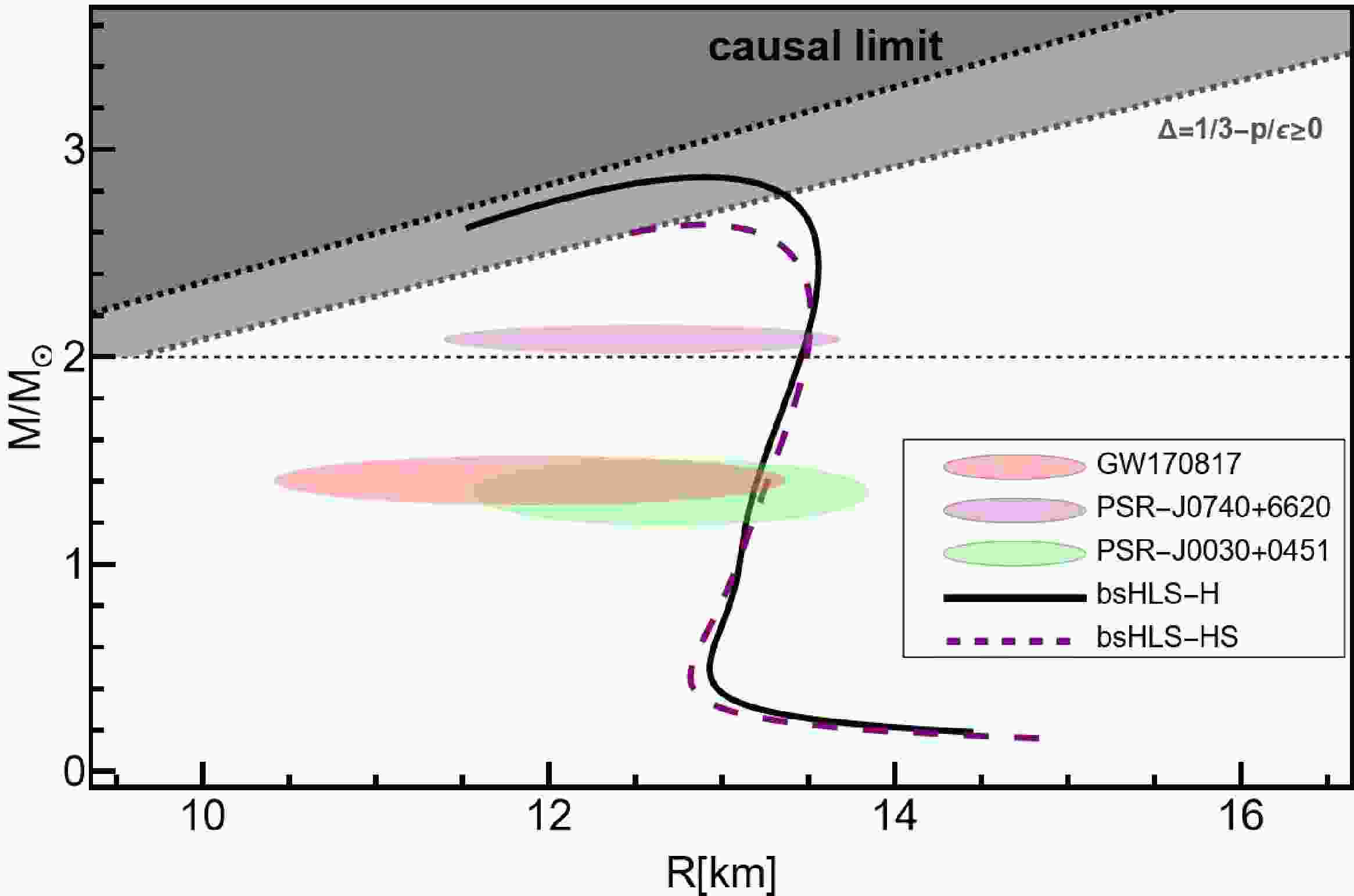 $M_{\sigma}=2.25\times10^5\ {\rm{MeV}}^2$ ,$\beta'=1.14$ ,$g_{\omega NN}=11.5$ ,$g_{\rho NN}=4.27$ ,$g^{SSB}_{\omega NN}=8.70$ ,$g^{SSB}_{\rho NN}=4.85$ ,$r=0.20 $ and$R=0.02 $ . And, as shown in Fig. 6, the M-R relations for PNM are roughly consistent with observational constraints, but there is a decrease of$ M_{\rm{max}} $ compared to bsHLS-H, which makes the M-R relation fall within the positive trace anomaly region.$ n_0 $