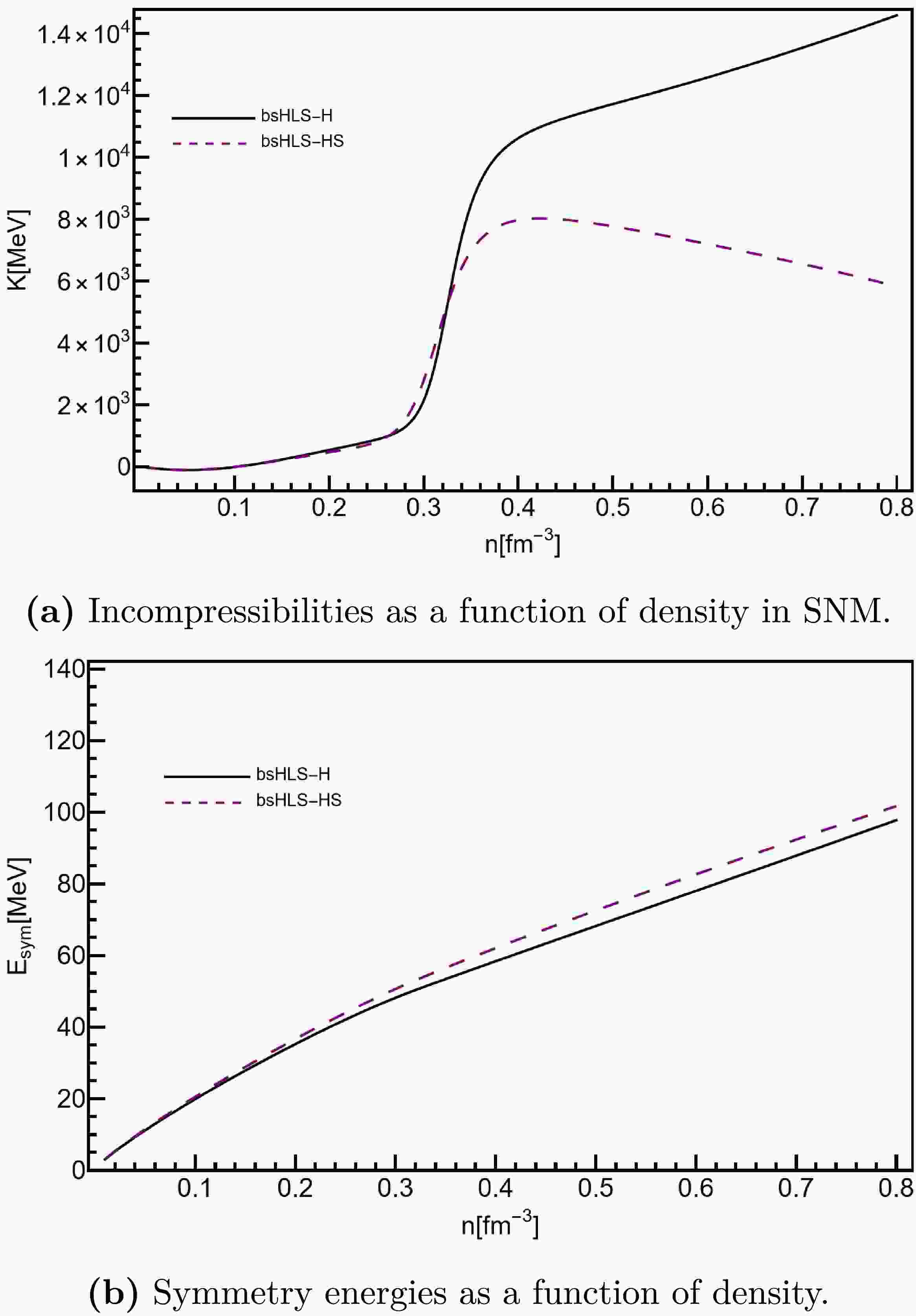 It can be seen that the symmetry energy remains almost the same in both cases. However, the incompressibility of bsHLS-HS is much softer than that of bsHLS-H at high densities, leading to a decrease in