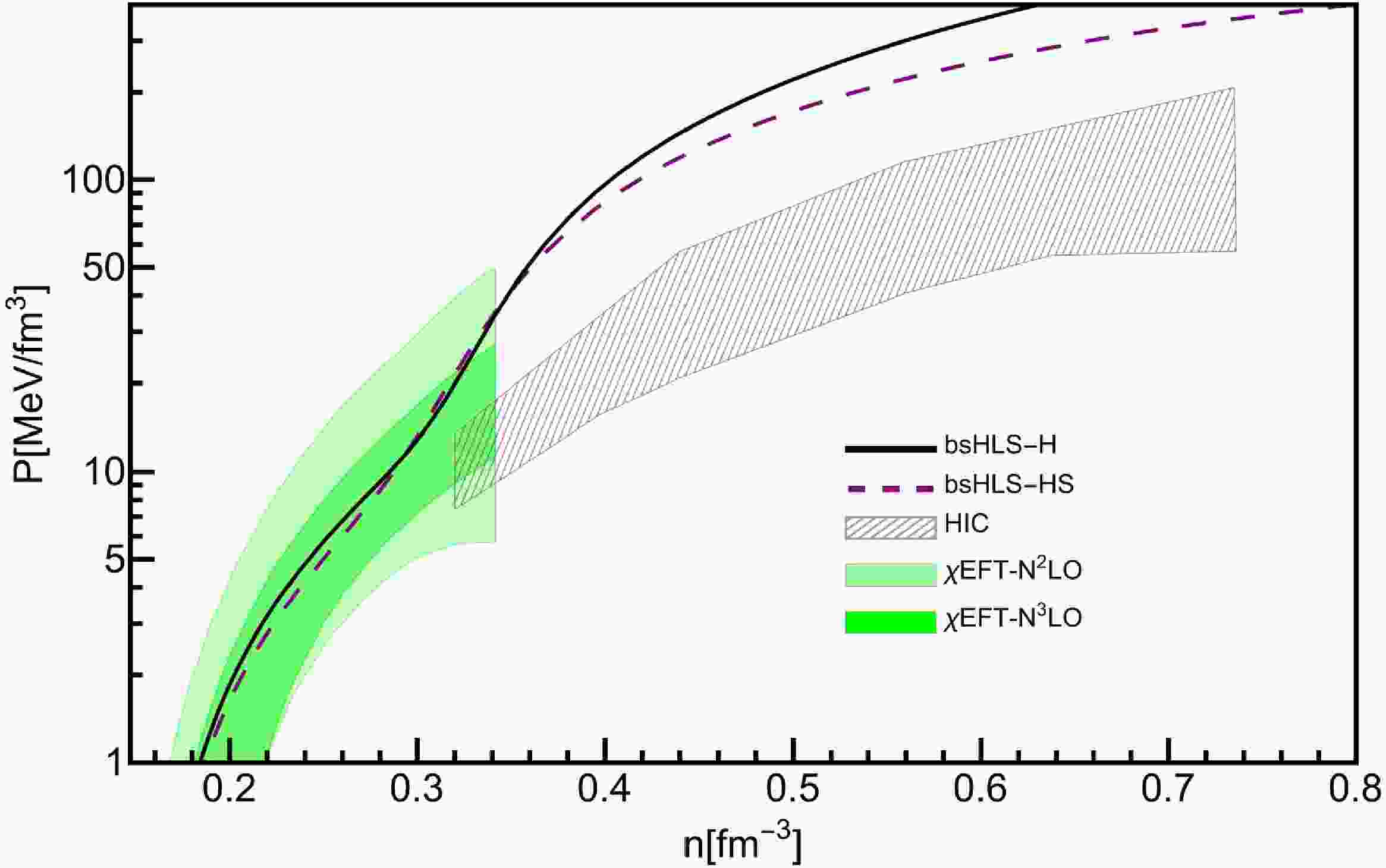 $\delta 6.7$ can fall in the region above$2.5 n_0$ , which mostly influences the maximum mass of neutron star: The ones in the constraints have smaller maximum mass, and the ones above the constraints have larger maximum mass. The results of bsHLS-L and bsHLS-H are both above the constraints, and bsHLS-L is even above the chiral nuclear force results. One reason is that the HIC flow-data constraints are not included in our fitting process, and possible ways to fix the discrepancy will be discussed latter in this section.