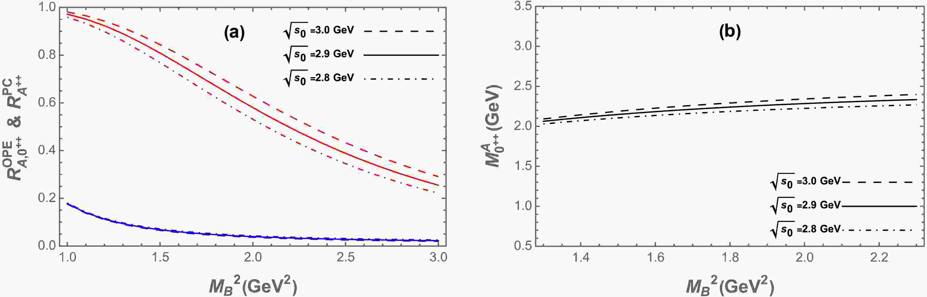 $ J_{0^{++}}^A $ , as an example, the OPE convergence ratio$ R^{OPE}_{A,\;0^{++}} $ and the pole contribution ratio$ R^{PC}_{A,\;0^{++}} $ are plotted as functions of the Borel paramete$ M_B^2 $ in Fig. 2(a), for three different values of the continuum threshold$ \sqrt{s_0}=2.8 $ ,$ 2.9 $ , and$ 3.0 $ GeV. The dependence of the extracted mass$ M_{0^{++}}^A $ on the Borel parameter is illustrated in Fig. 2(b). From these analyses, an optimal Borel window is identified as$ 1.4 \le M_B^2 \le 2.2\; \text{GeV}^2 $ , within which both the OPE convergence and pole dominance criteria are satisfied. Accordingly, the mass of the fully strange tetraquark state corresponding to the current$ J_{0^{++}}^A $ is extracted to be: