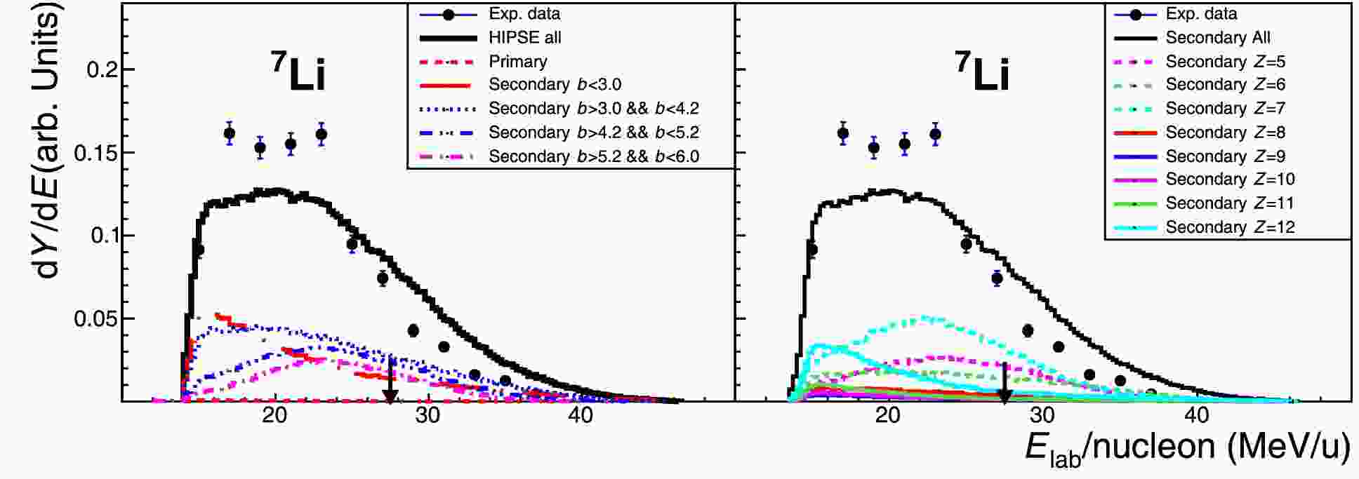 Figure 10. (color online) Fragment-energy spectra for 7Li produced in 16C + C reaction (refer to Fig. 8 for the normalized presentation). Left panel: Experimental data with statistical error bars are compared with calculations characterized by secondary decay processes within different impact parameter (b, in unit of fm) zones. Right panel: Calculated secondary decay processes characterized by mother nuclei which decay to 7Li final fragment.