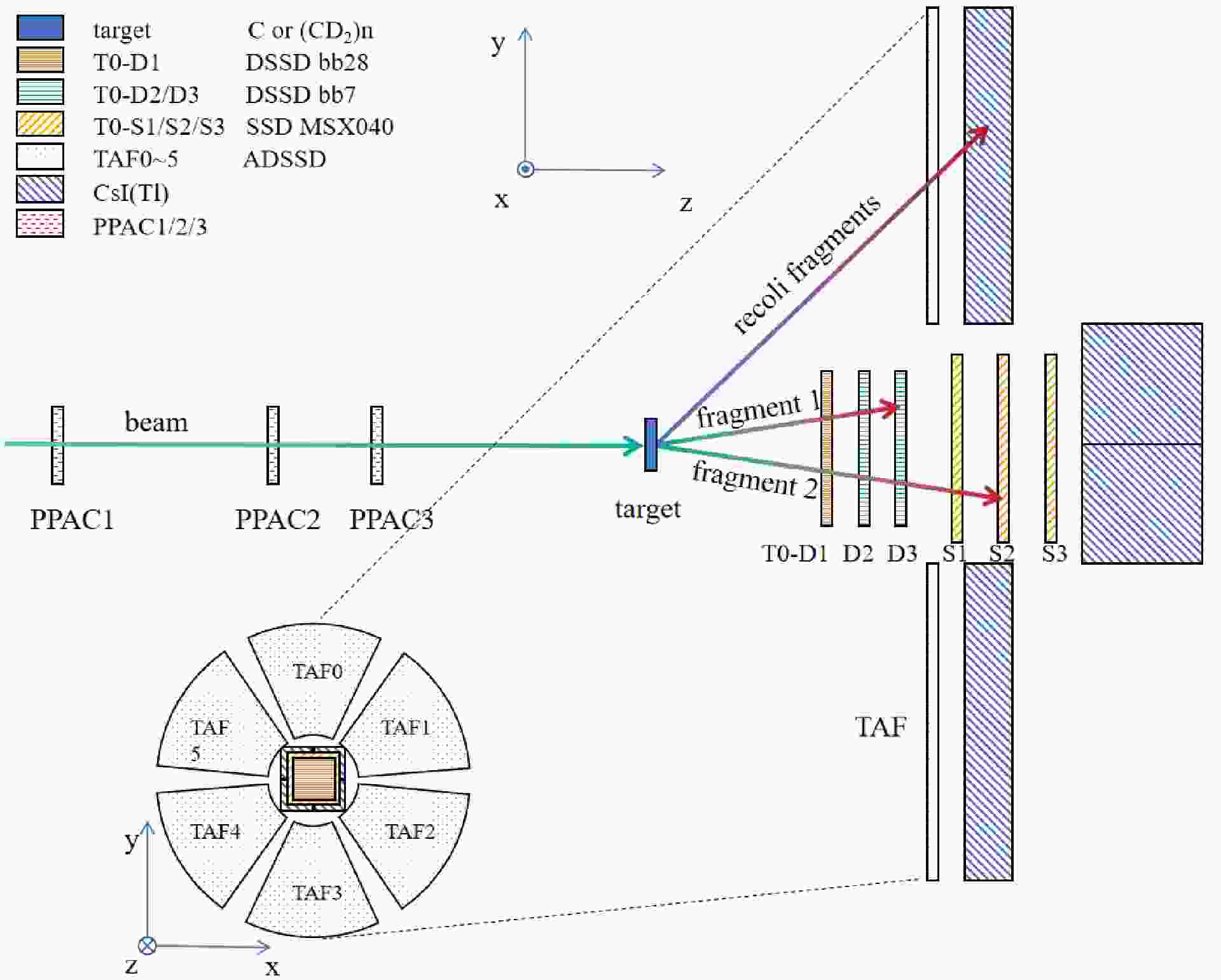 Figure 1. (color online) Schematic view of the experimental setup. The beam is tracked by PPACs onto the target. Reaction fragments are detected by the T0 telescope, consisting of DSSDs and SSDs, and the surrounding TAF array. See texts for details.