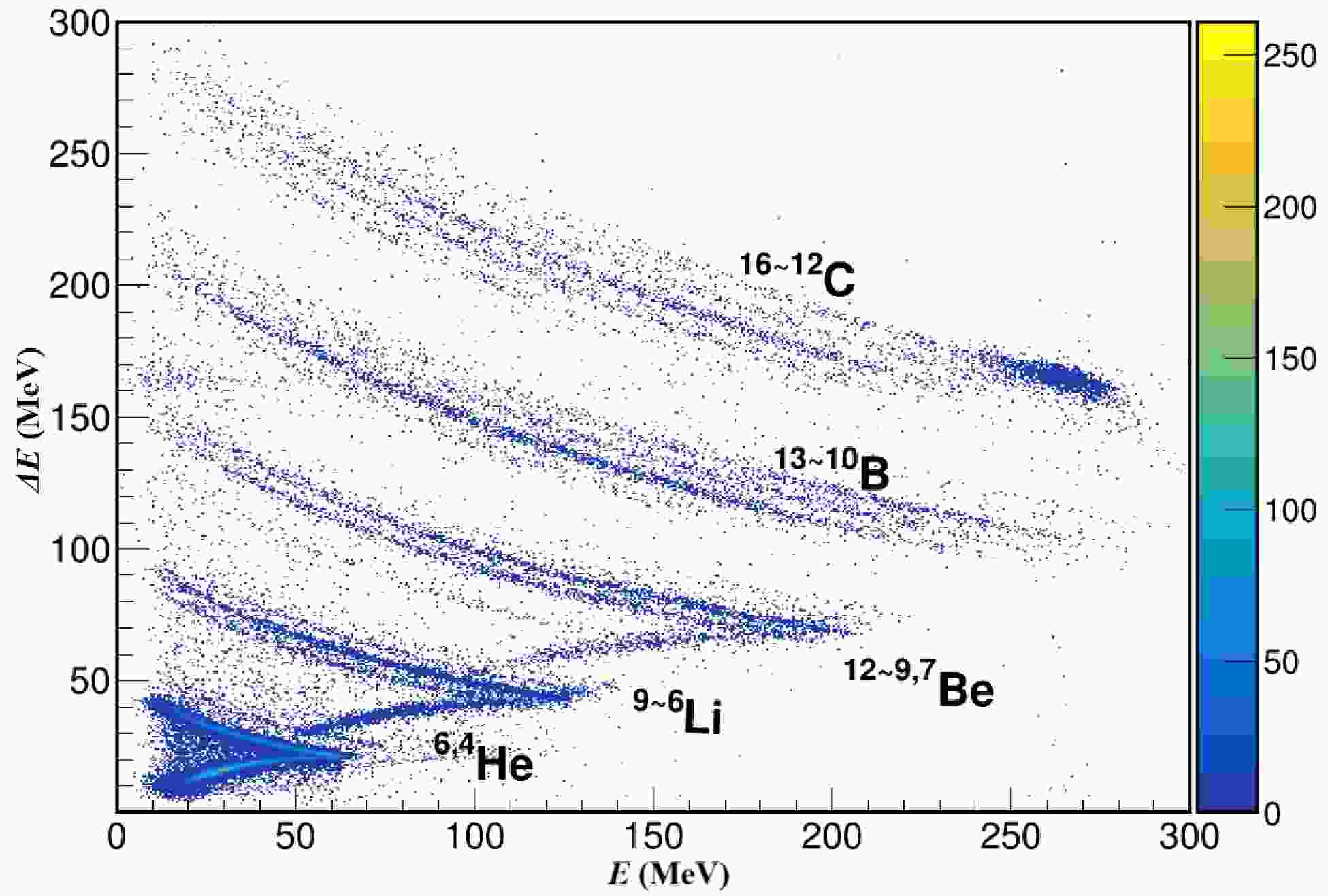$ \Delta E$ ) and the remaining energy (E) as measured by T0-D1 and T0-D2 detectors, respectively, for the 16C + C reaction at 27.5 MeV/nucleon. Each band corresponds to a specific isotope, demonstrating clear particle identification. For each element, mass numbers of the isotopes are labeled, with the higher number corresponding to the upper band. -